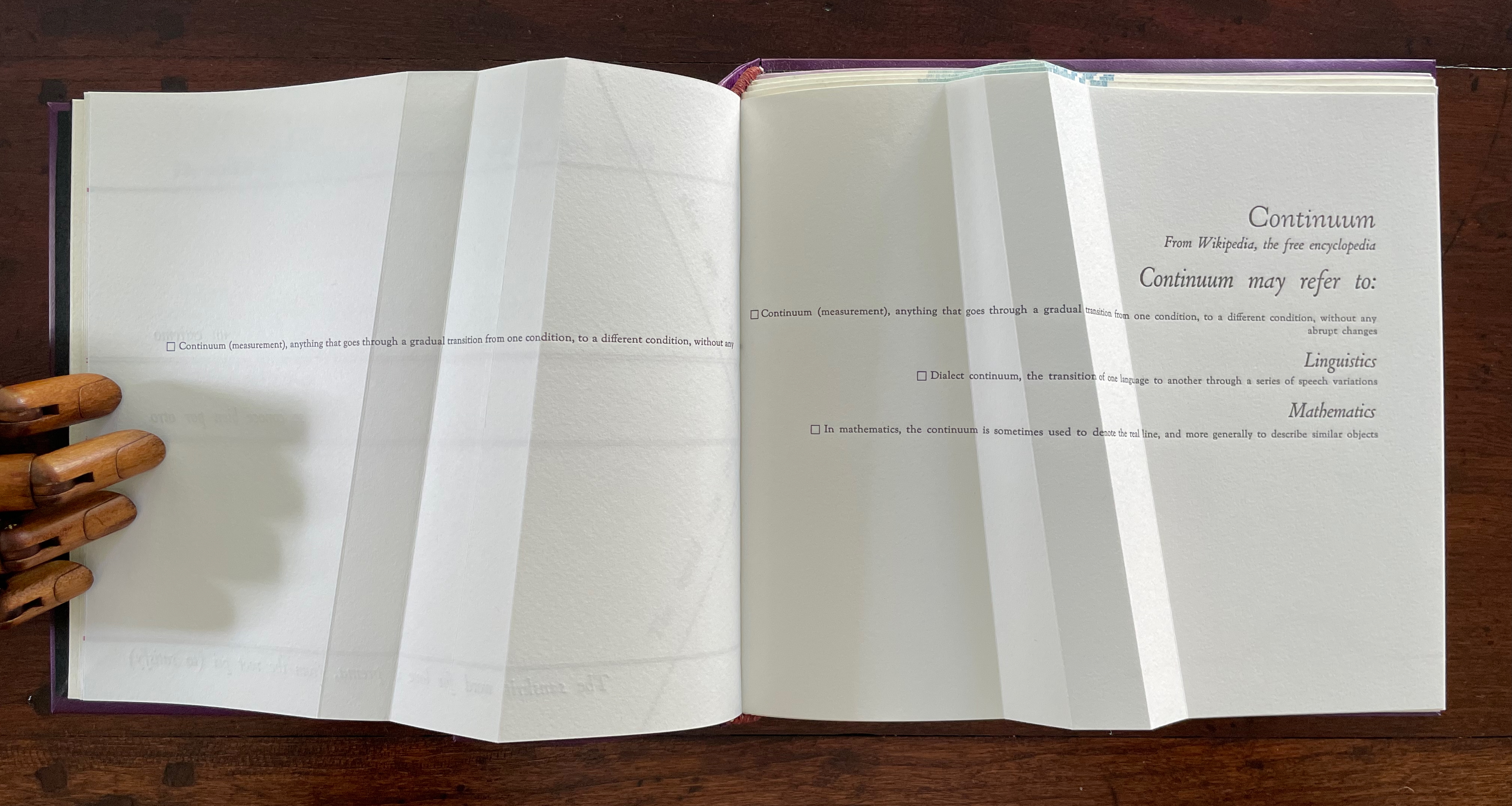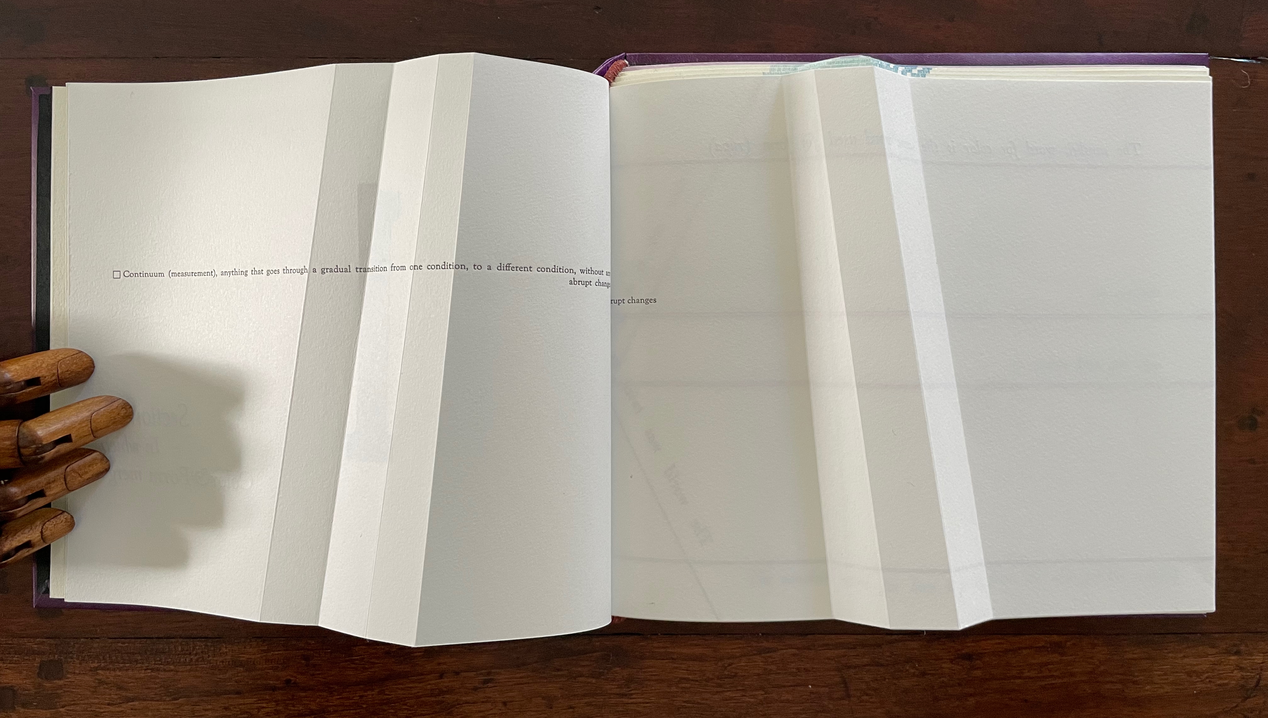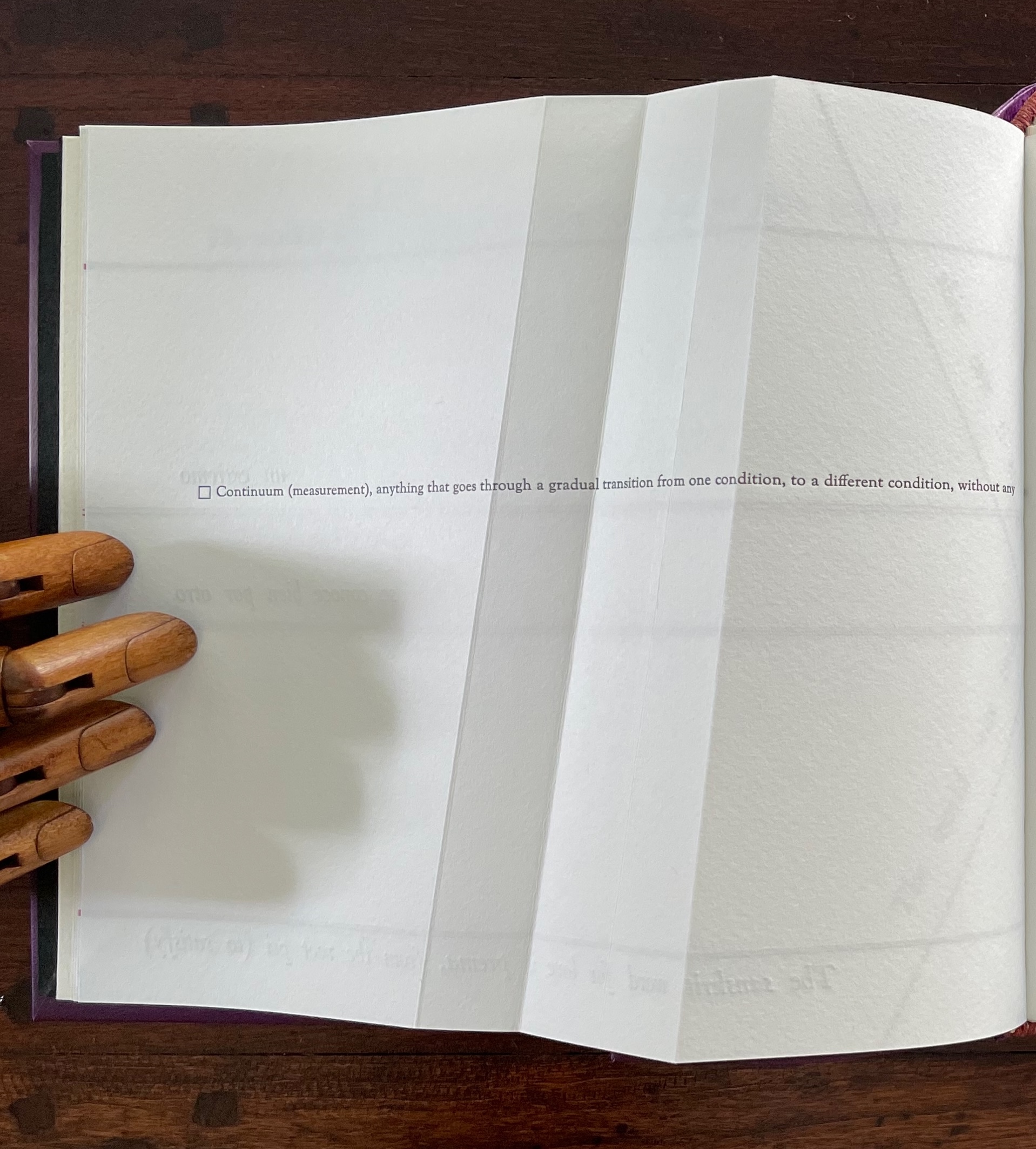 Before the reassurance, however, we come back to the puzzle of “rupt changes”. Again, on the verso page above, the definition of “continuum” runs pell mell into the crease. To solve the puzzle, we have to look more closely at the structure of the Section R gathering. It consists of three oblong folios folded in half. On the reverse side of the center folio (what would be pages 5 and 8 of this gathering if the pages were numbered), the definition of “continuum” has been printed so that the fold splits the word “abrupt” between its syllables: “Continuum (measurement), anything that goes through a gradual transition from one condition, to a different condition, without any a | brupt changes.” In effect, the layout draws attention to our perception of breaks in continua.