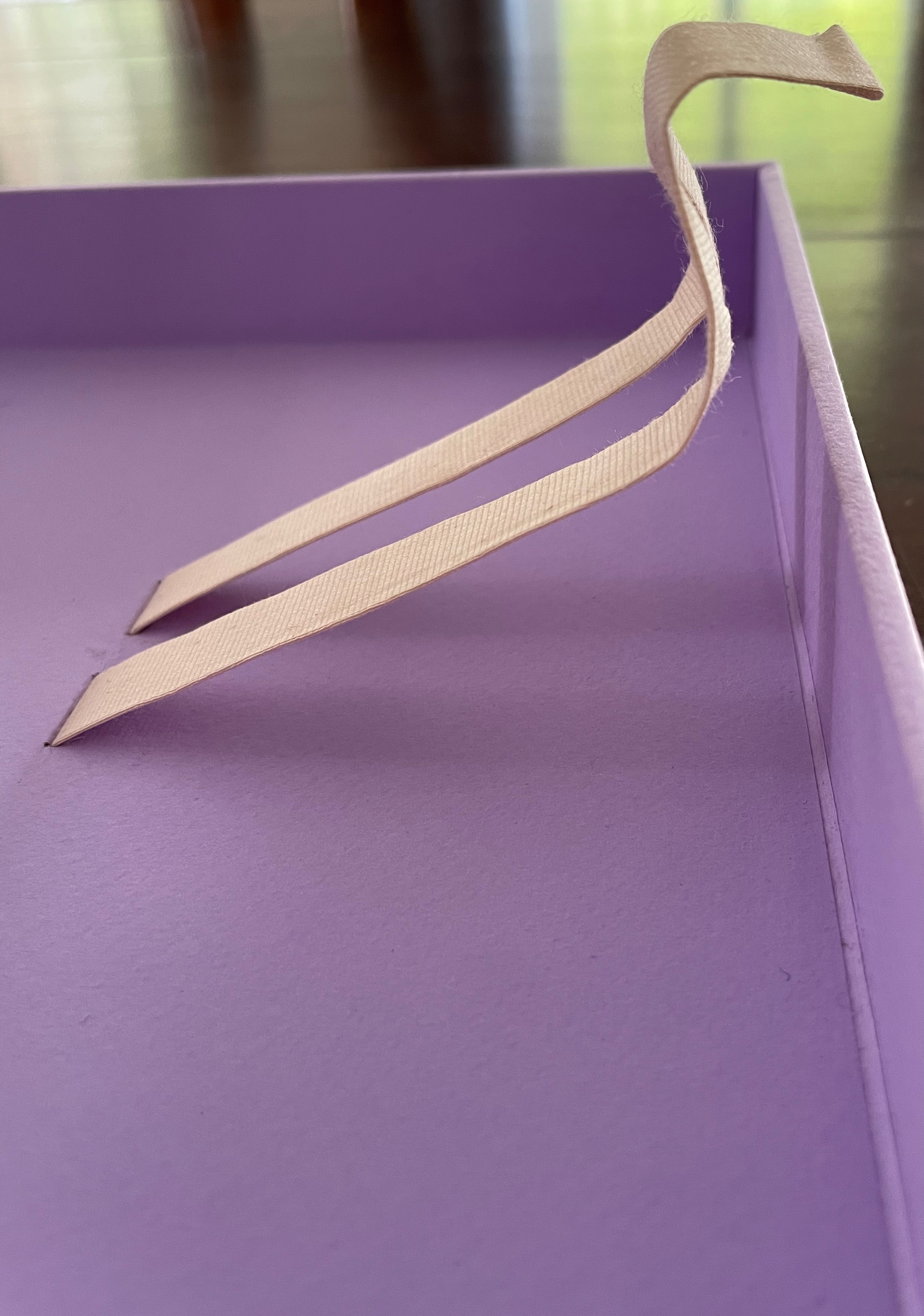 Following Emily Dickinson’s injunction — “Tell all the truth but tell it slant” — Cordeiro plants other angles in Lightweight. The ribbon tape that lies under the book is stiff, not soft and flexible, and it twists once and folds twice into an angular tool for lifting up the book. The trim of the book’s top and bottom edges slants. Creased into the covers, end sheets, and text block of this limp form, the angled beam is a physical constant echoing the metaphor of a continuum whose endpoints contrast and balance with one another.