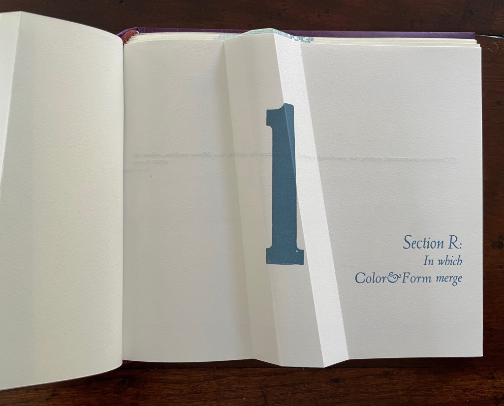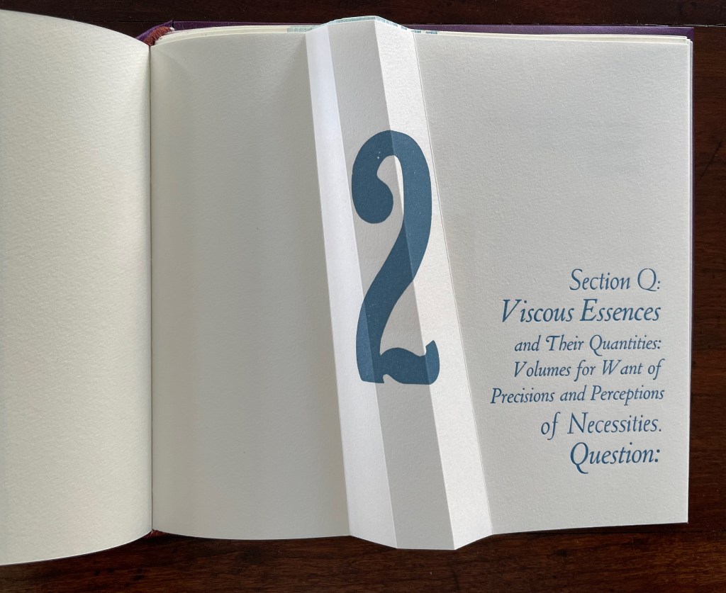 If Section R has not prompted the reader to propose questions about the structure of the book or this book in particular, the Part 2, Section Q gathering provides a series of oblique questions very much focused on that but also on metaphorical matters. Again, what happens structurally in the gathering and on the surface of its pages presents puzzles and hints at solutions.