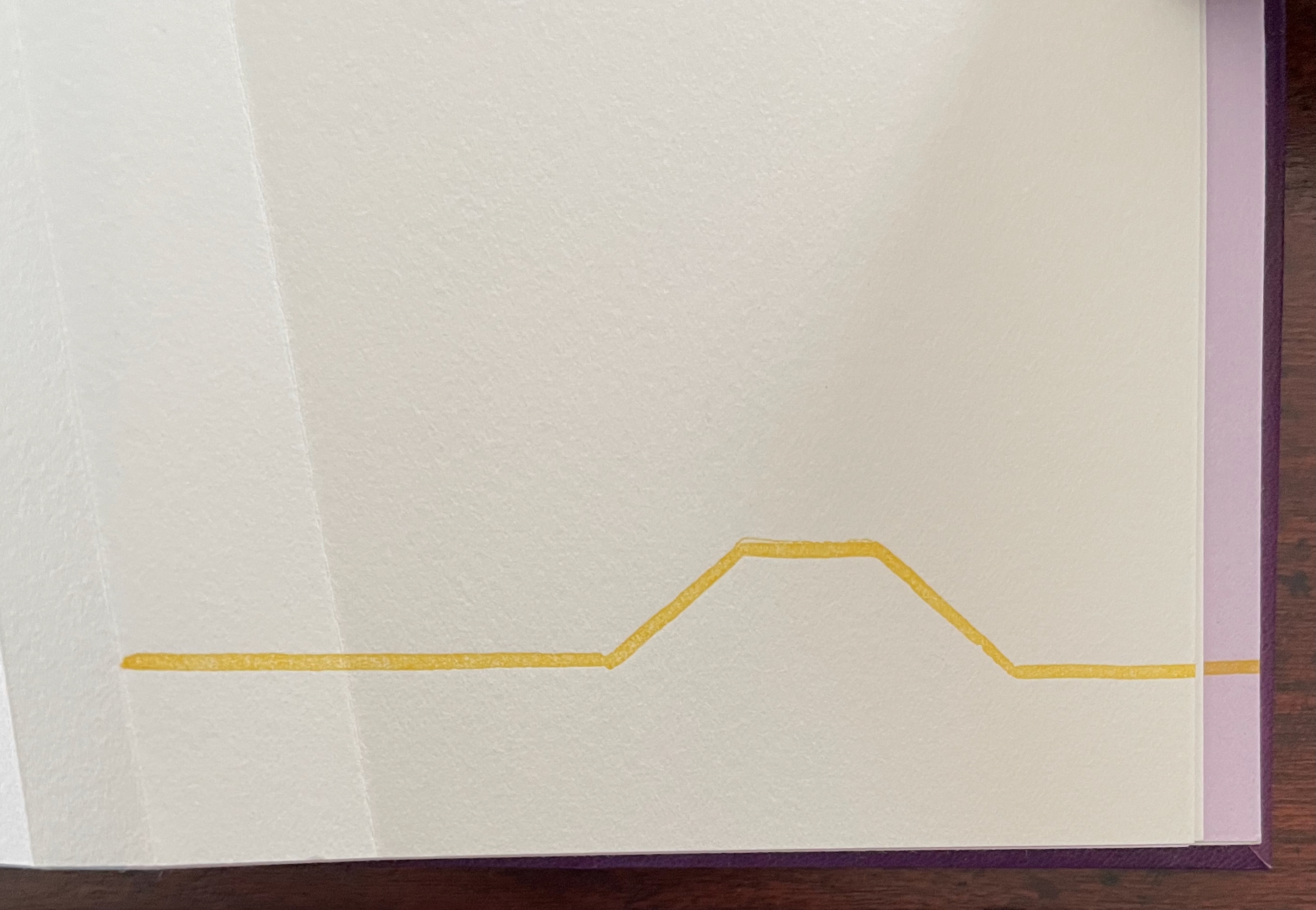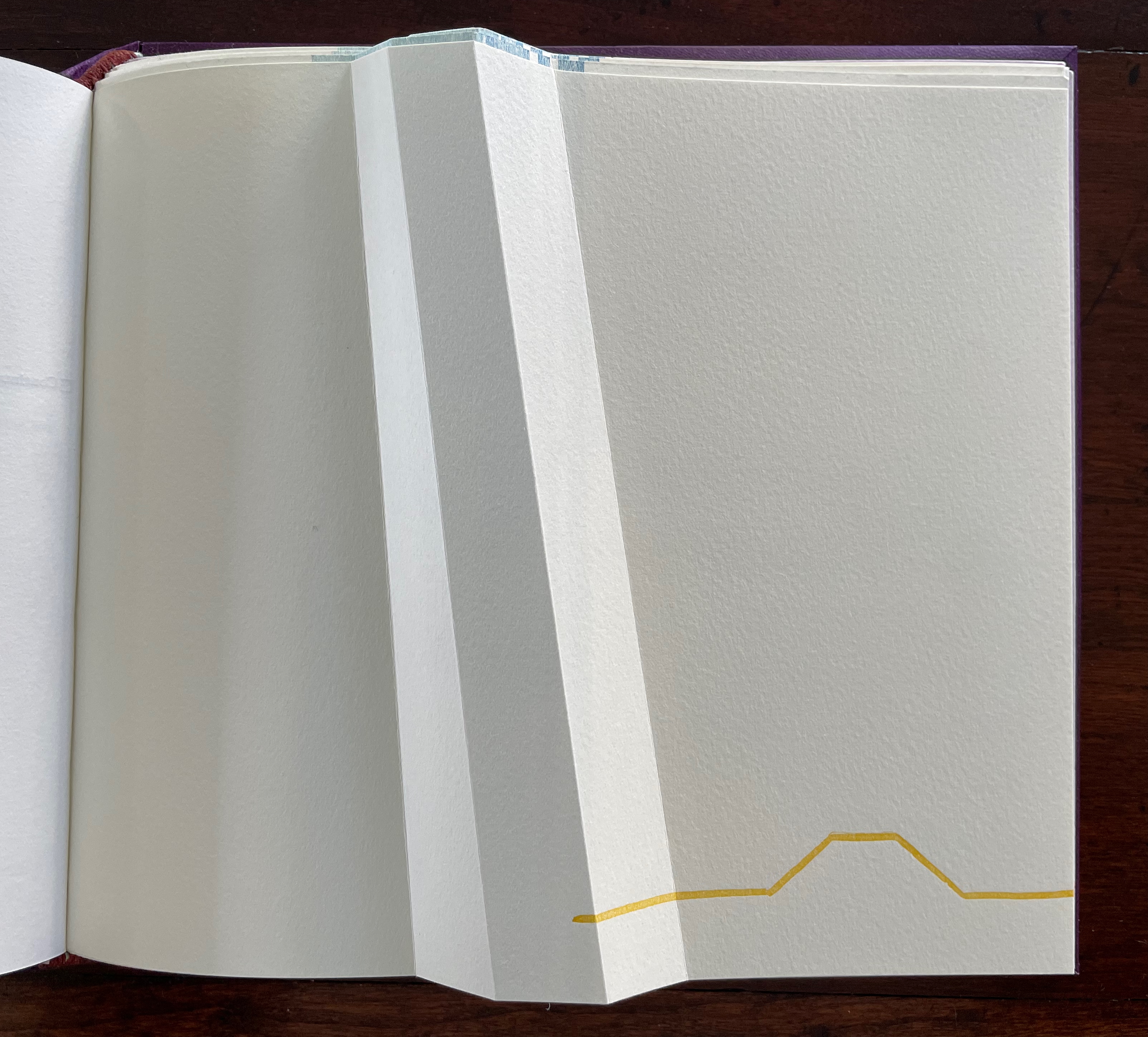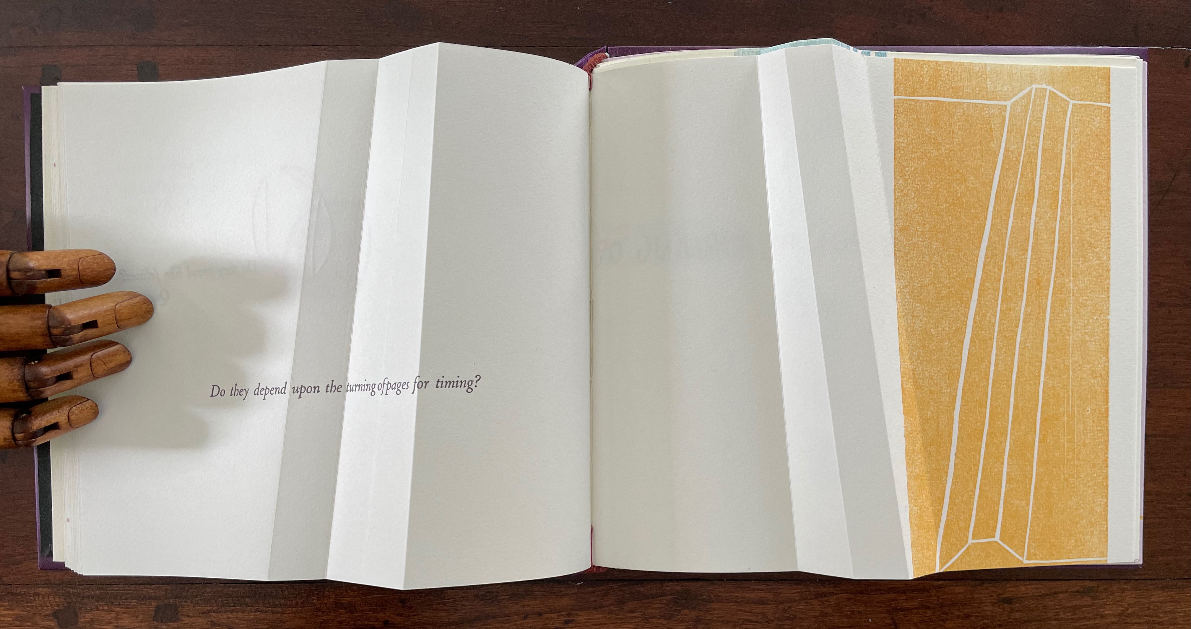 The next question turns directly to a functional attribute of the book structure: turning pages. The yellow print gives an ambiguous view. The two-dimensional representation of the angled beam fluctuates between a mountain view and a valley view. Are we looking down on the splayed spine of a book or its gutter with pages splayed open? Either way, the print angles away from the physical angled beam, which sets up a metronomic pattern in the spread — the beam leaning to the right, then to the left, and again to the right — or a page turned to the right, then to the left, and back again to the right — or mountain fold, then valley fold, then mountain, then valley (the gutter), then mountain, then valley, then mountain until we come to the ambiguous two-dimensional print. Again, this is a continuum, and “they” seems to refer to limp vellum structures.