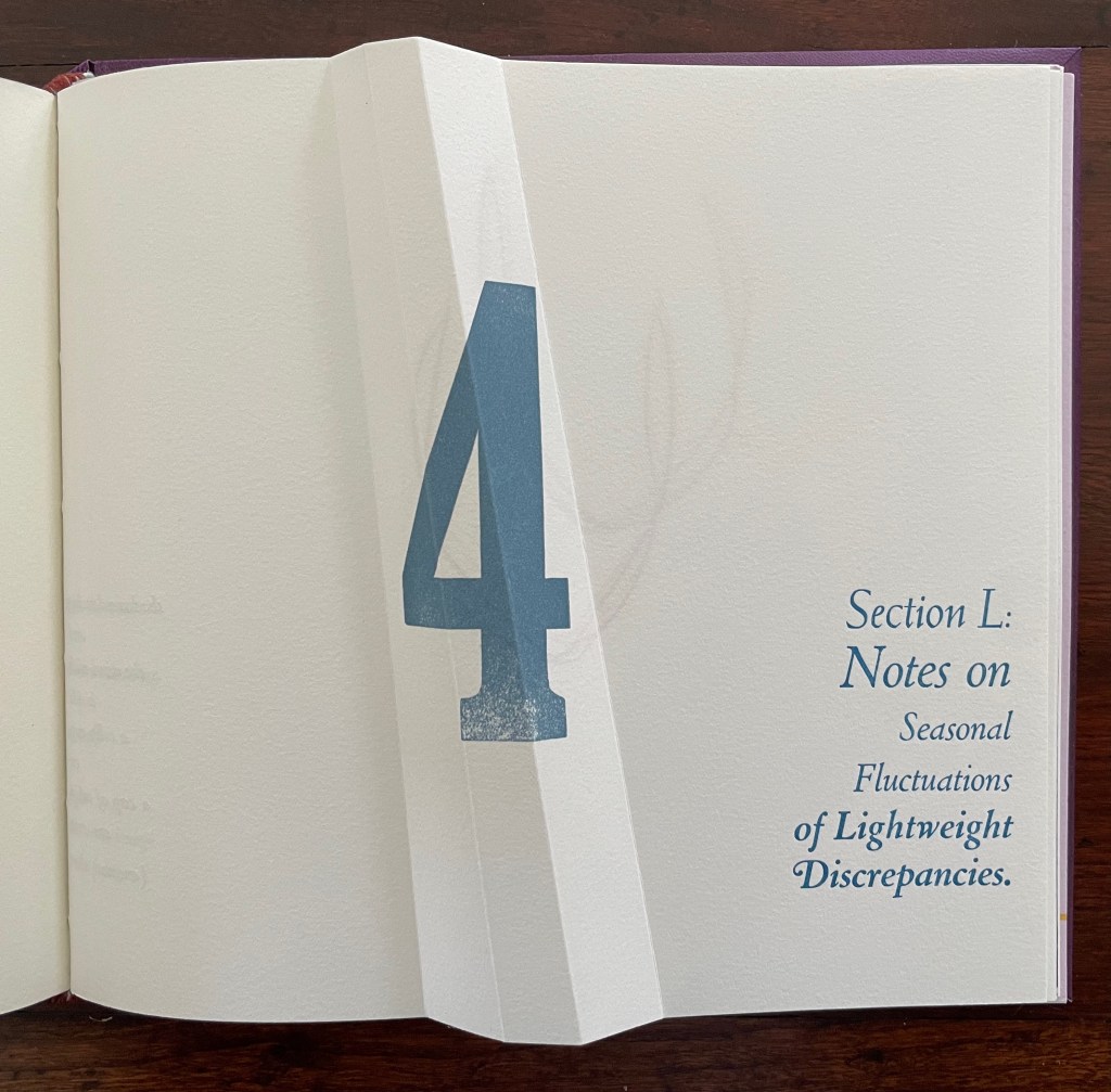 Part 4, labeled “Section L: Notes on Seasonal Fluctuations of Lightweight Discrepancies”, is the densest of the gatherings. Drawings, verse typeset in English and scribed in Portuguese, typographic arrangements, trimmed and segmented photographs, and linocut prints of a stone wall all find their way into Part 4.