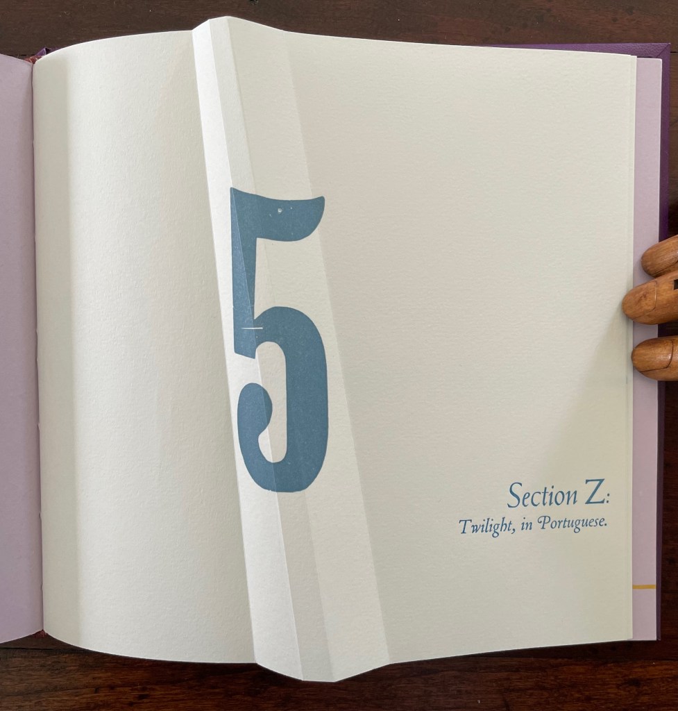 Part 5, Section Z is the wrap-up, conflating the end of the alphabet with the end of the day (twilight), but of course, twilight is also a point on the continuum of day into night.