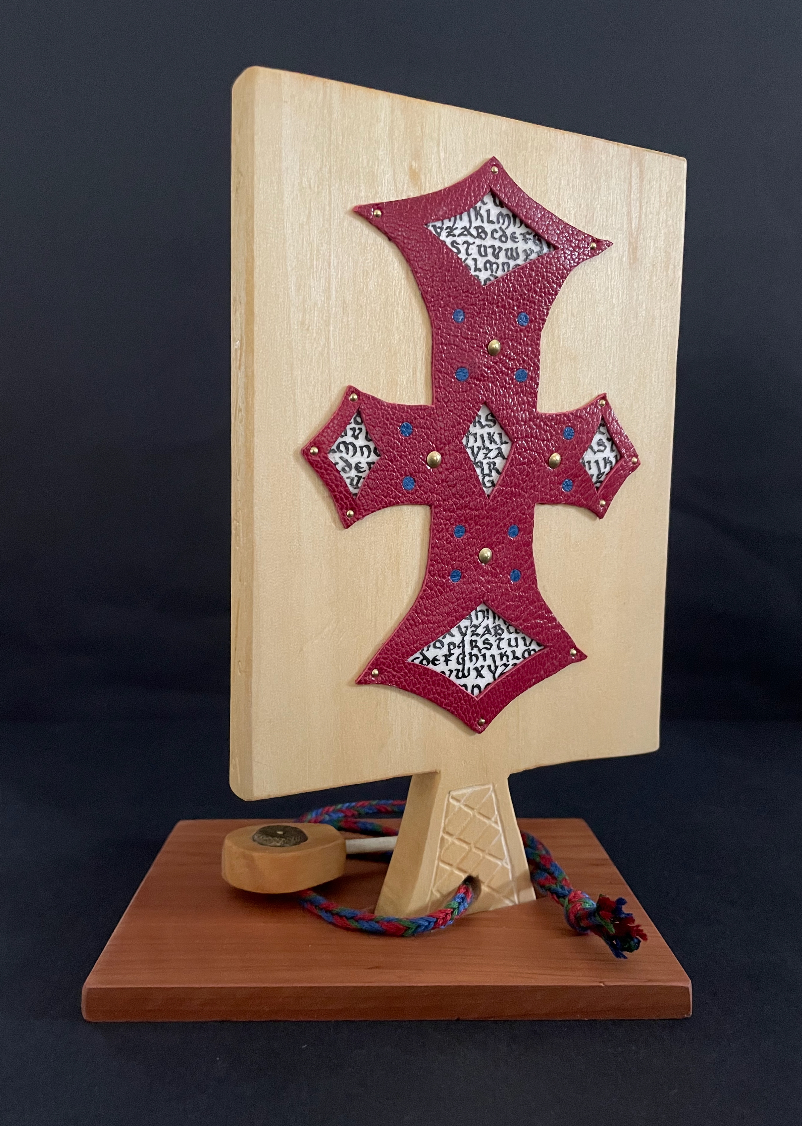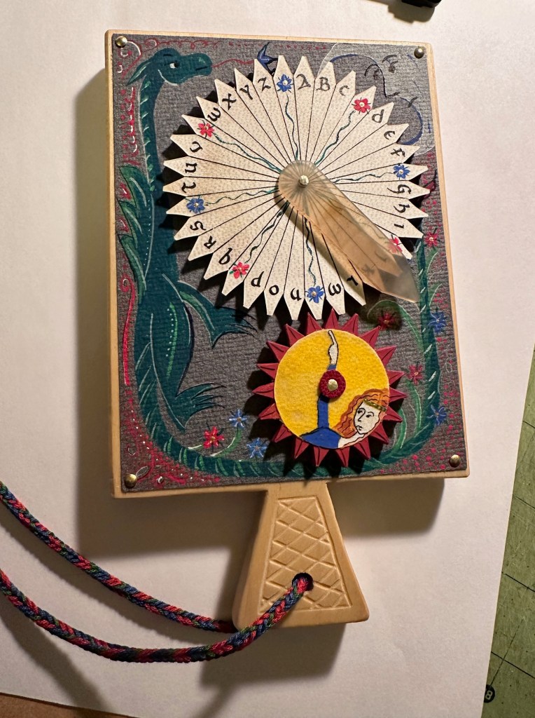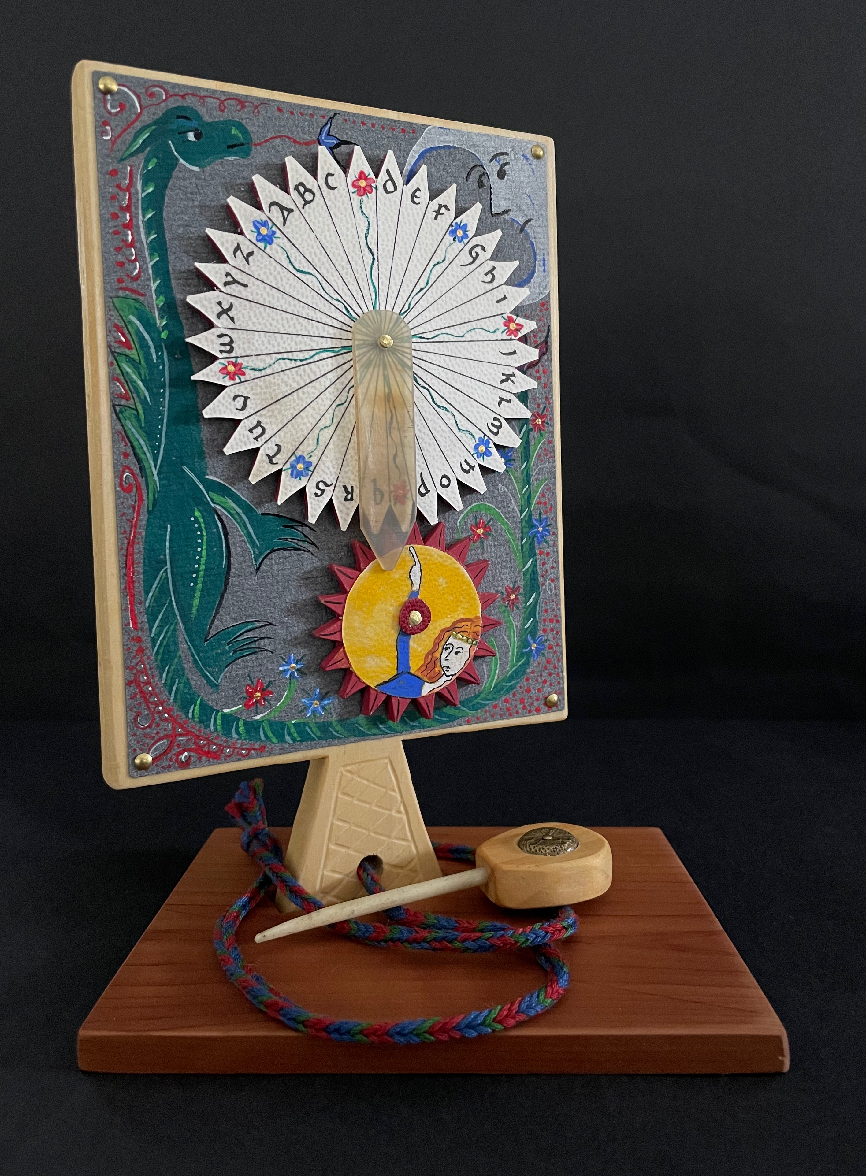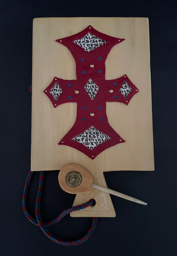 The paddle is made of pine wood, the gears of vellum-covered bookboard, the spinning “arm” of authentic cow horn, and the wrist loop of embroidery thread by a medieval finger loop braiding technique. On dark grey-blue Khadi paper, Thayer has painted a border of the moon, a berried floral garland, and a wyvern, the heraldic emblem associated with Wessex, the Anglo-Saxon kingdom from which Alfred the Great emerged in the 9th century. On the reverse, a cross of cut red leather with five inserts of calligraphed vellum alluding to Christ’s five wounds reflects the horn-book tradition of combining religion with learning the alphabet. It also makes this horn-book reflective of Alfred’s Anglo-Saxon and Christian background.