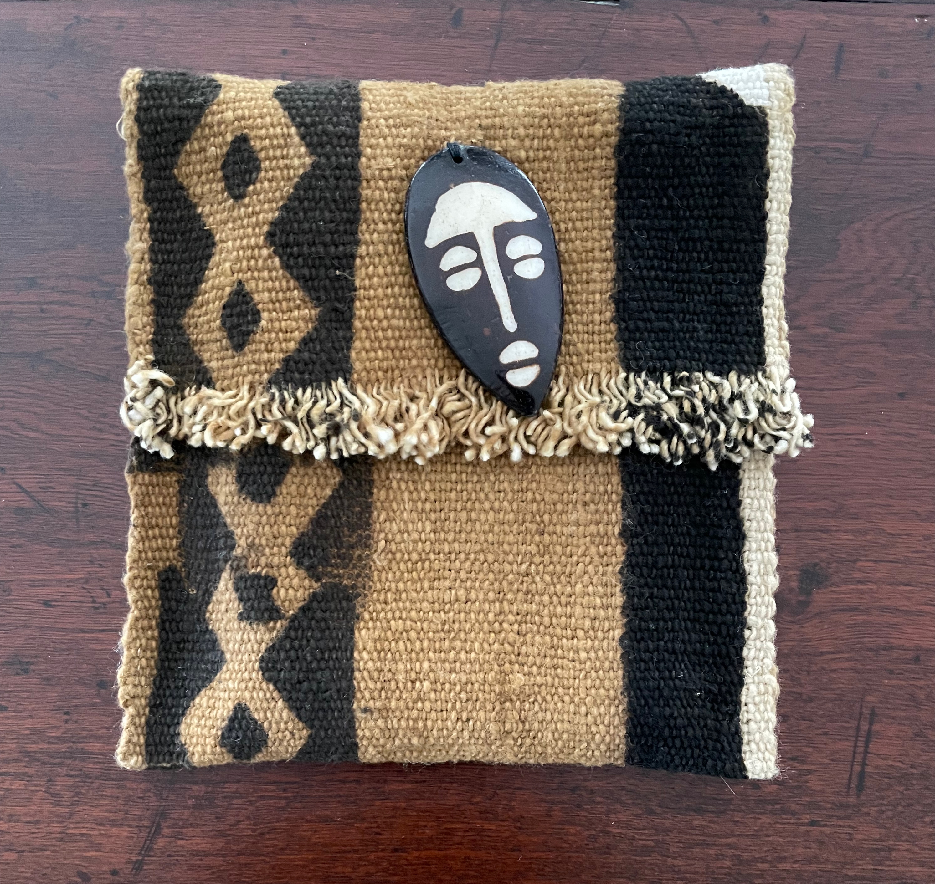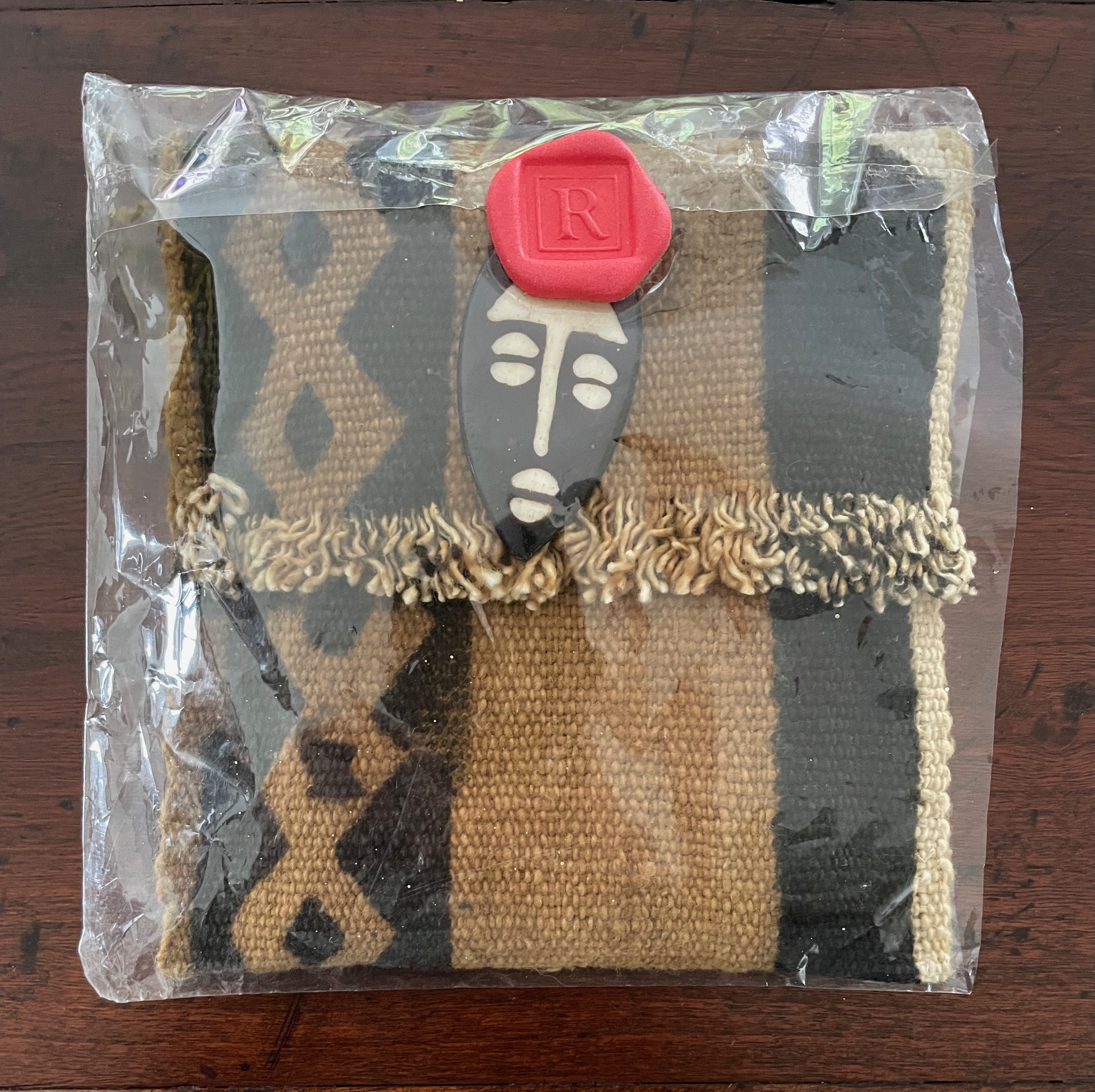 Wisdom of the Ancestors (1999) Ruth E. Edwards Cloth bag with painted stone amulet, hand-woven African mudcloth from Mali, containing metal ball bead chain through single-hole punched in cards, with gold talisman hanging. Bag: H145 x W135 mm. Cards: H130 x W76 mm. 30 cards. Eclectic Art and Collections 23 October 2025. Photos: Books On Books Collection.