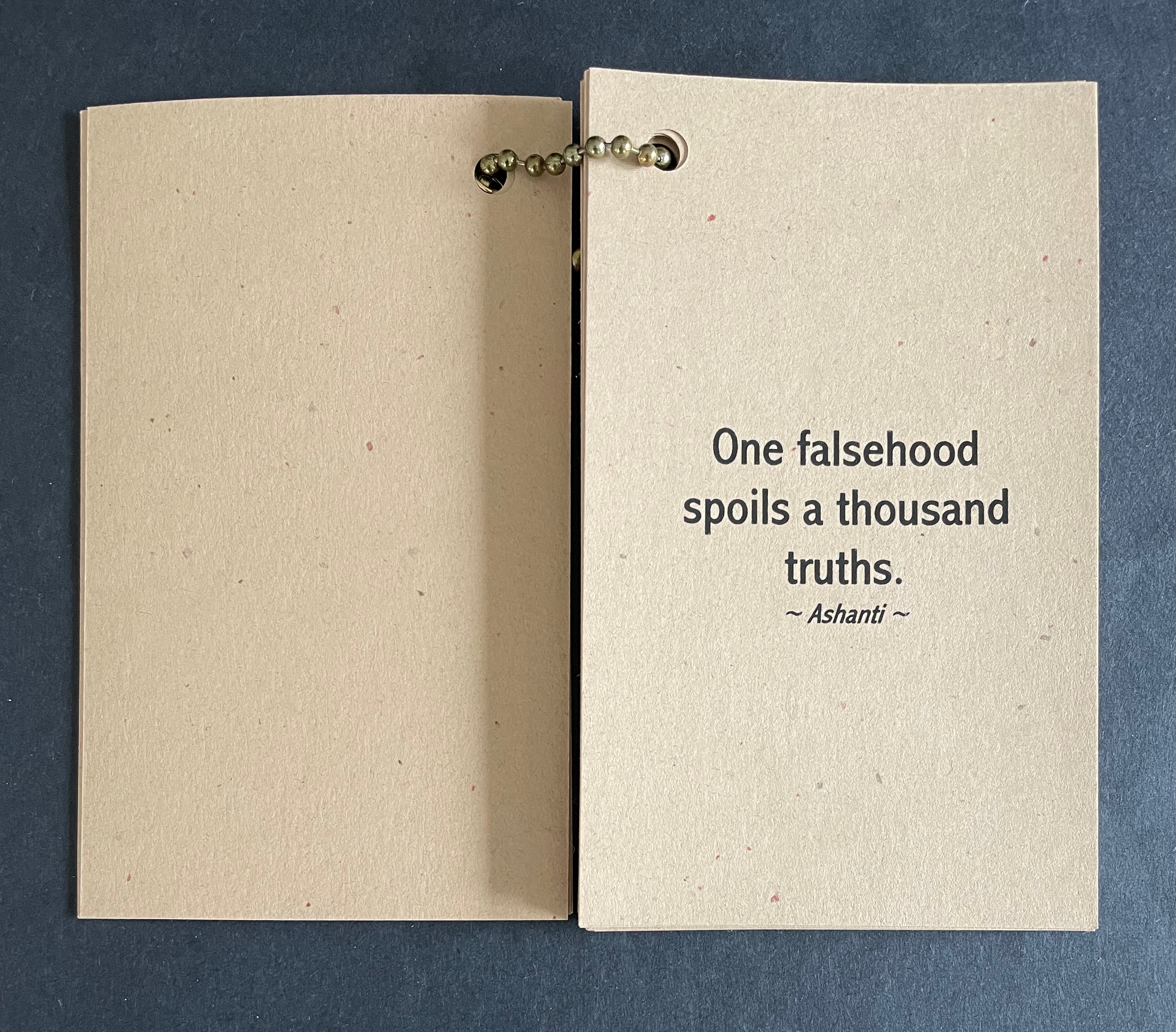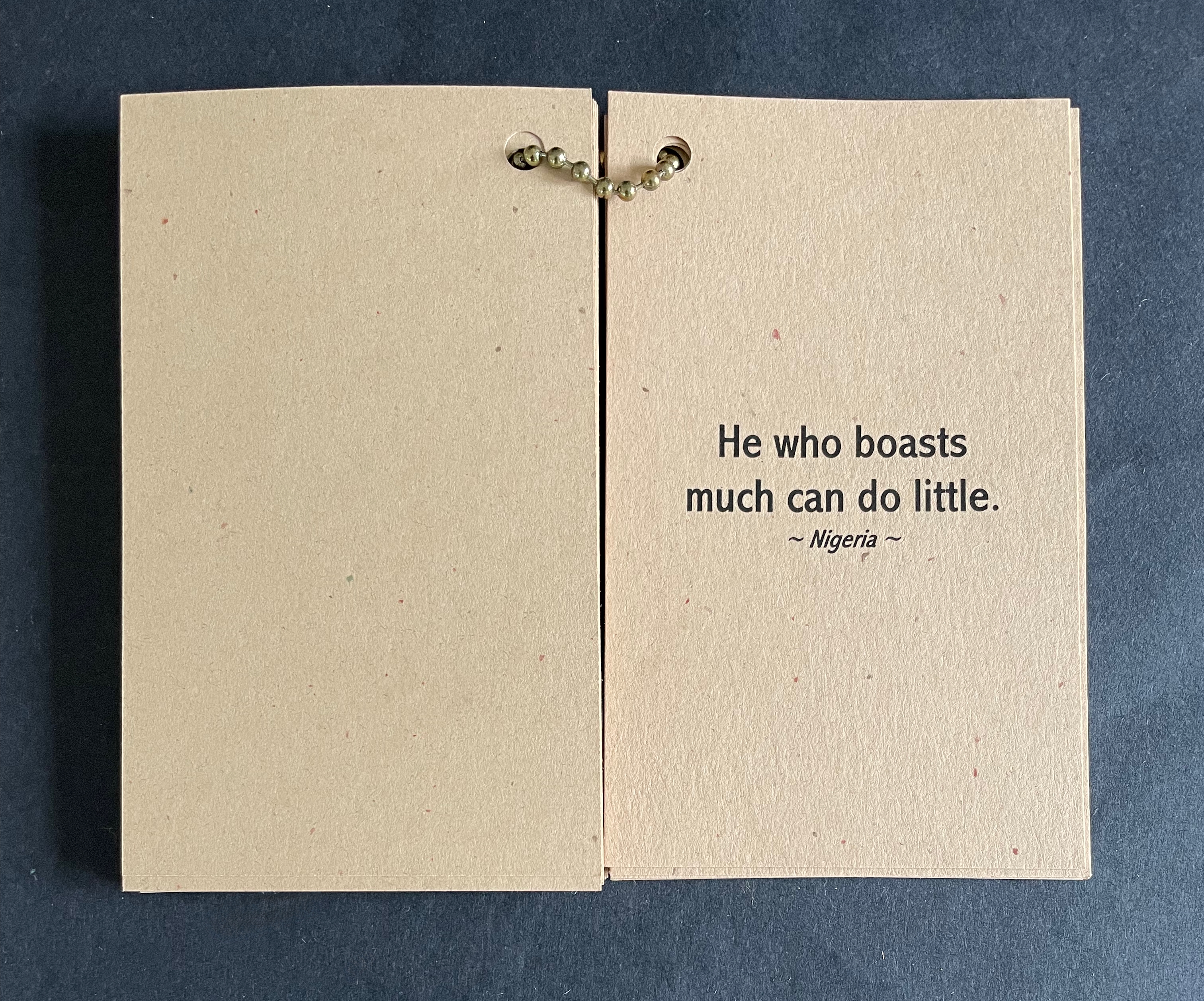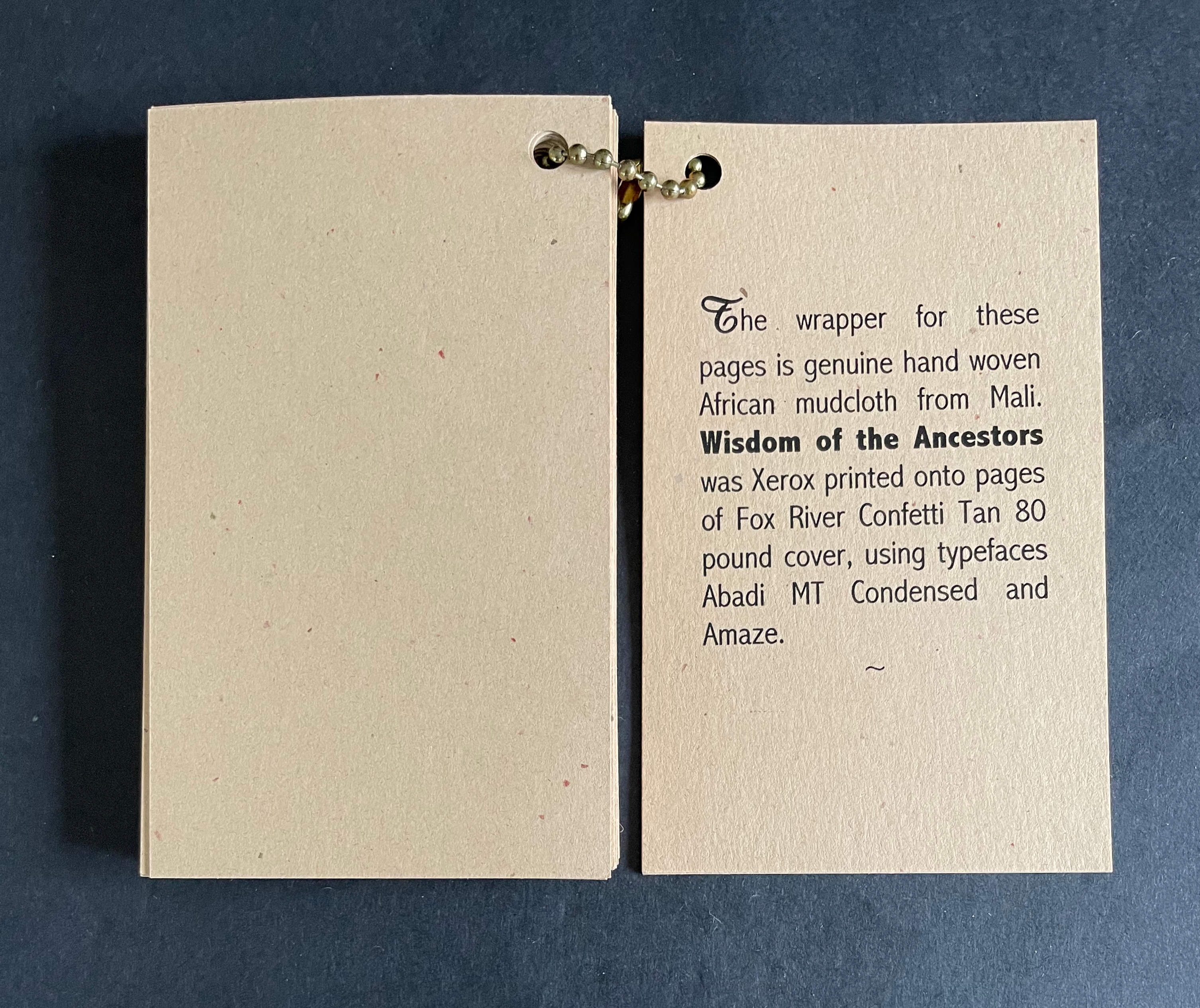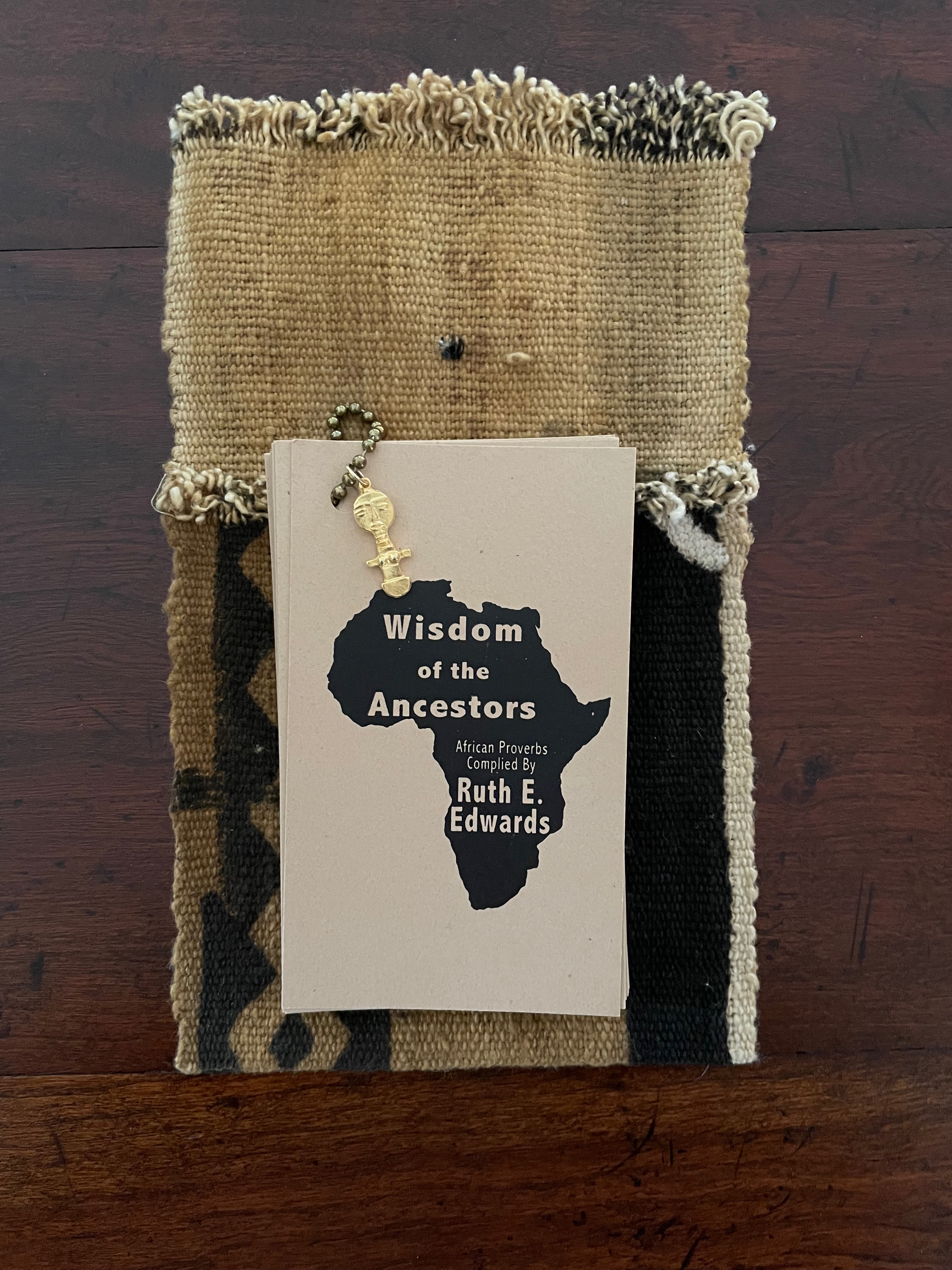 The earth-tone cards “bound” with a metal ball bead chain and mudcloth bag imbue the thirty wise sayings with a further sense of the “make do” of craft and art, which carries its own wisdom