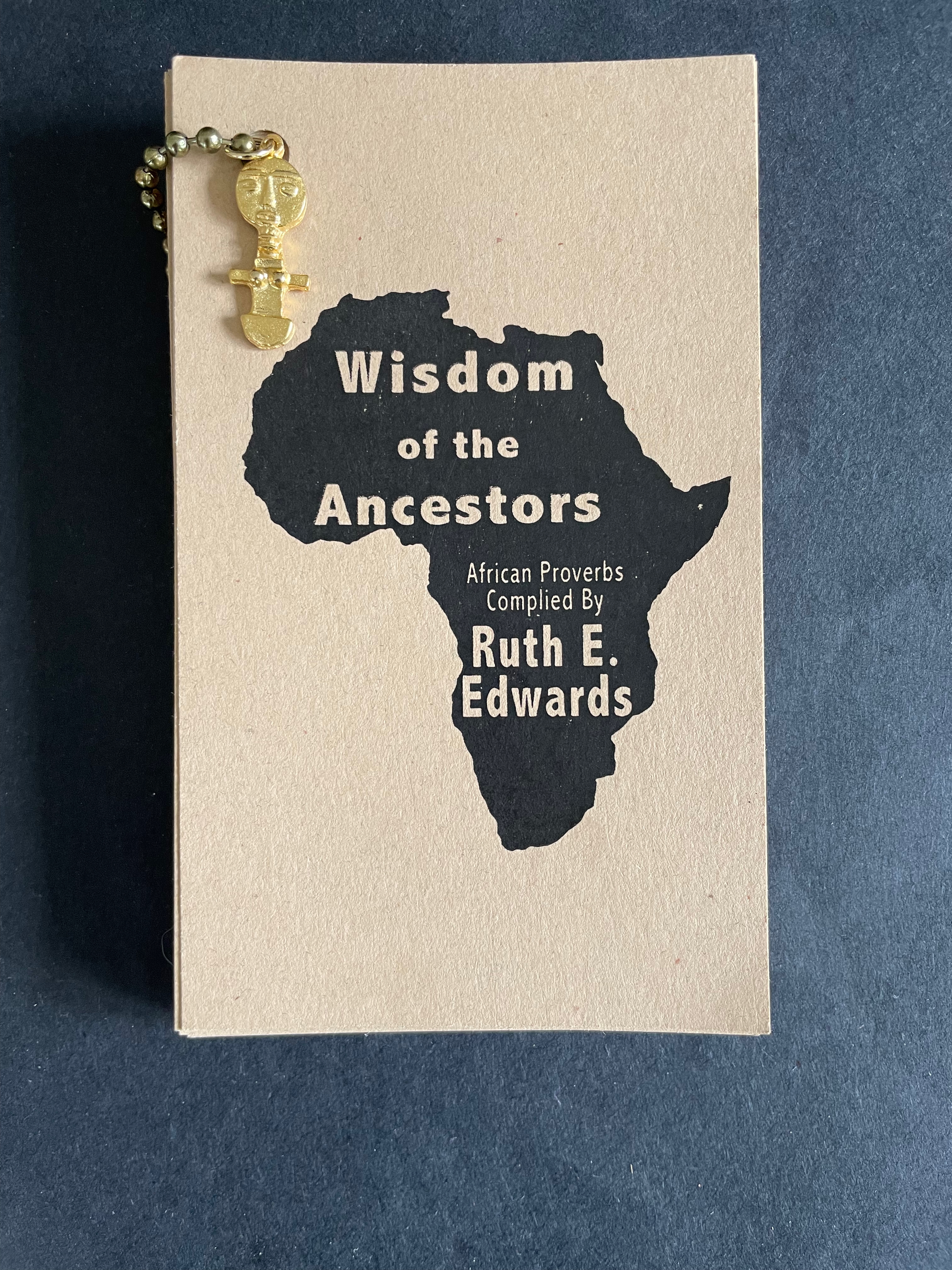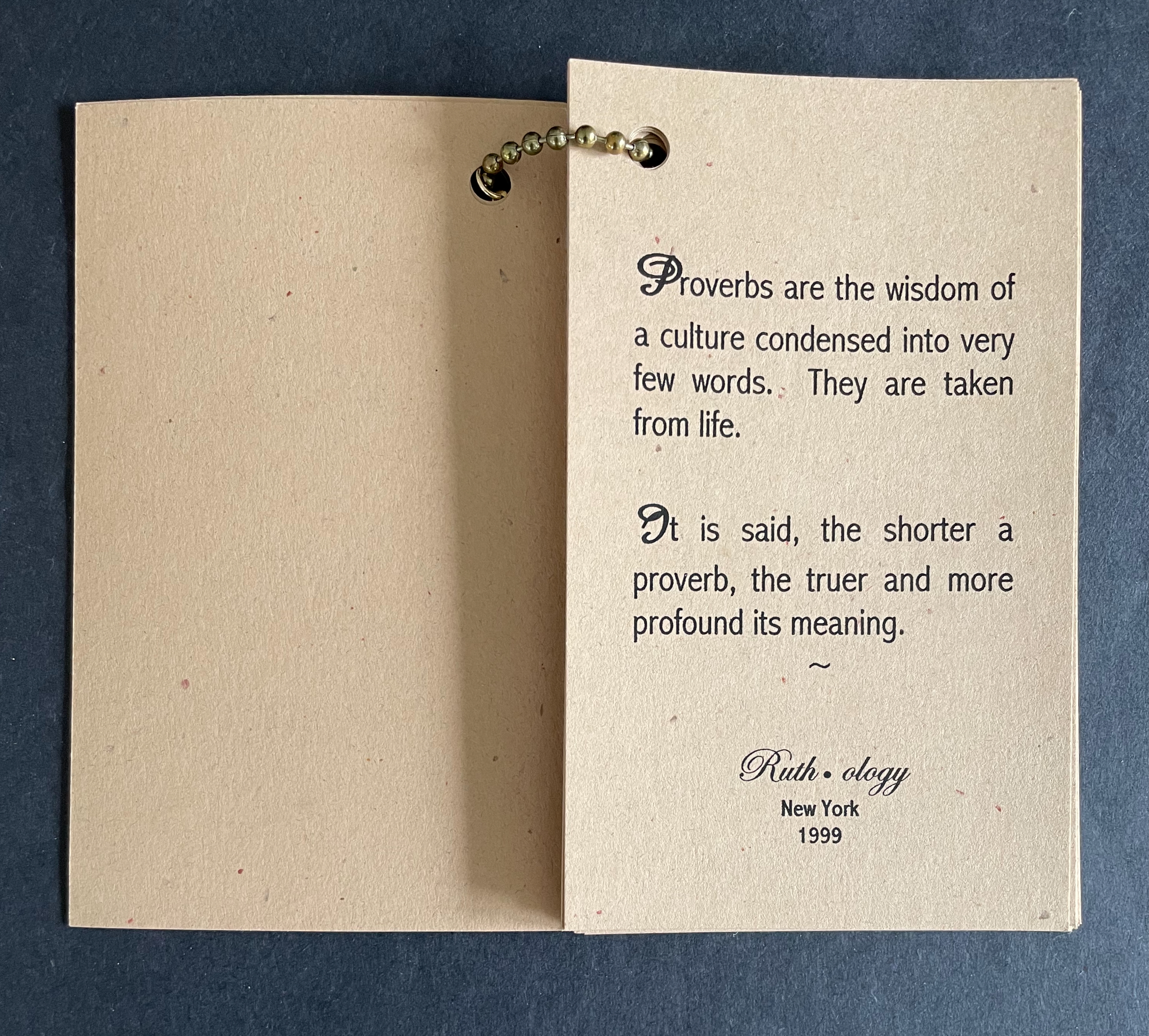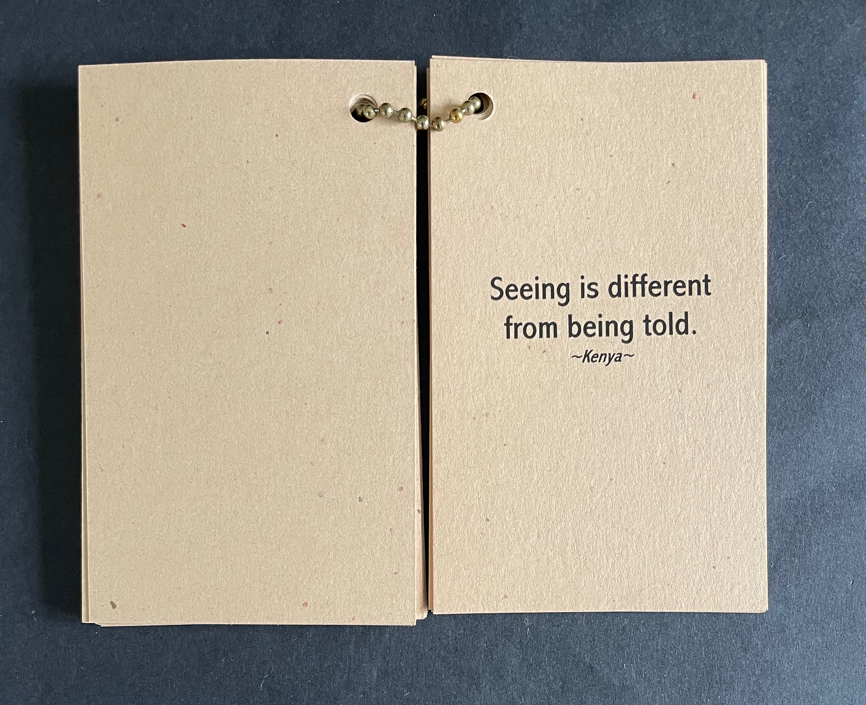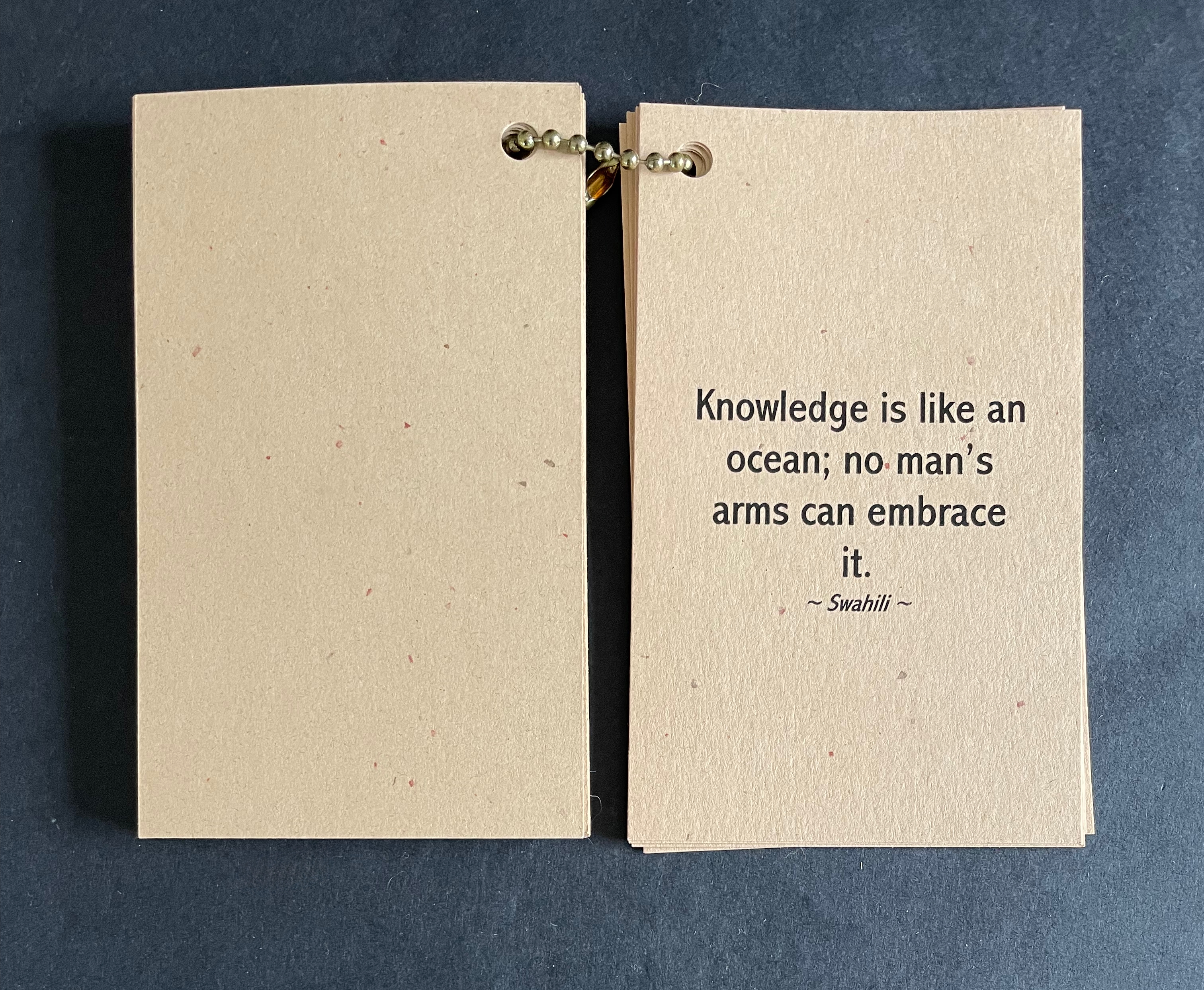 The earth-tone cards “bound” with a metal ball bead chain and mudcloth bag imbue the thirty wise sayings with a further sense of the “make do” of craft and art, which carries its own wisdom