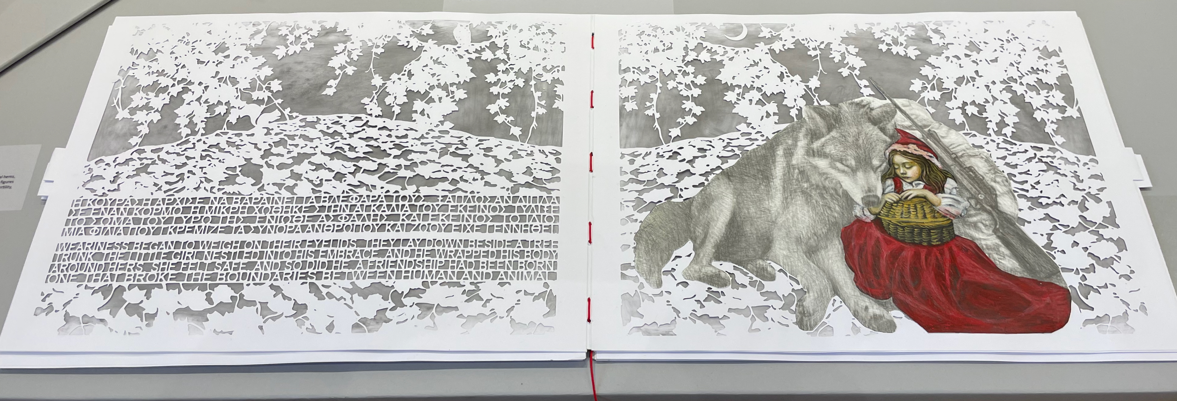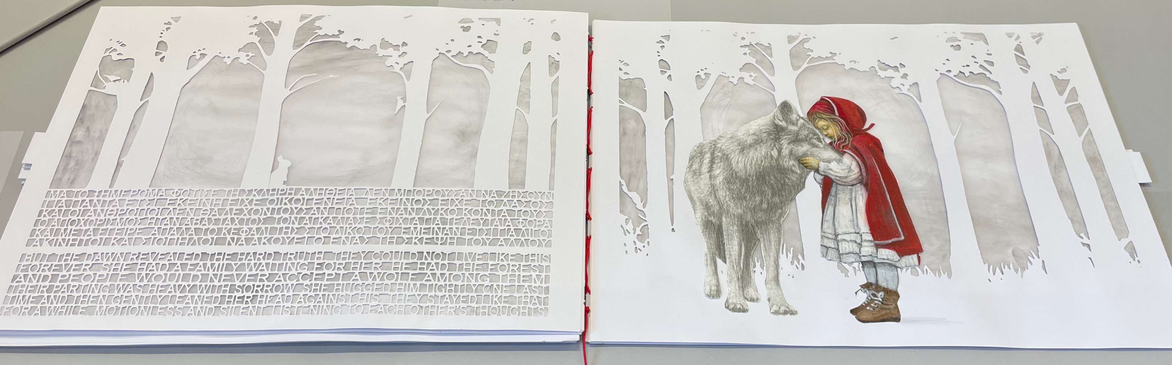 Little Red Riding Hood (2025) Ismini Bonatsou Acrylics, pencil, and papercuts. 450 x 300 mm. Photos: Books On Books.
