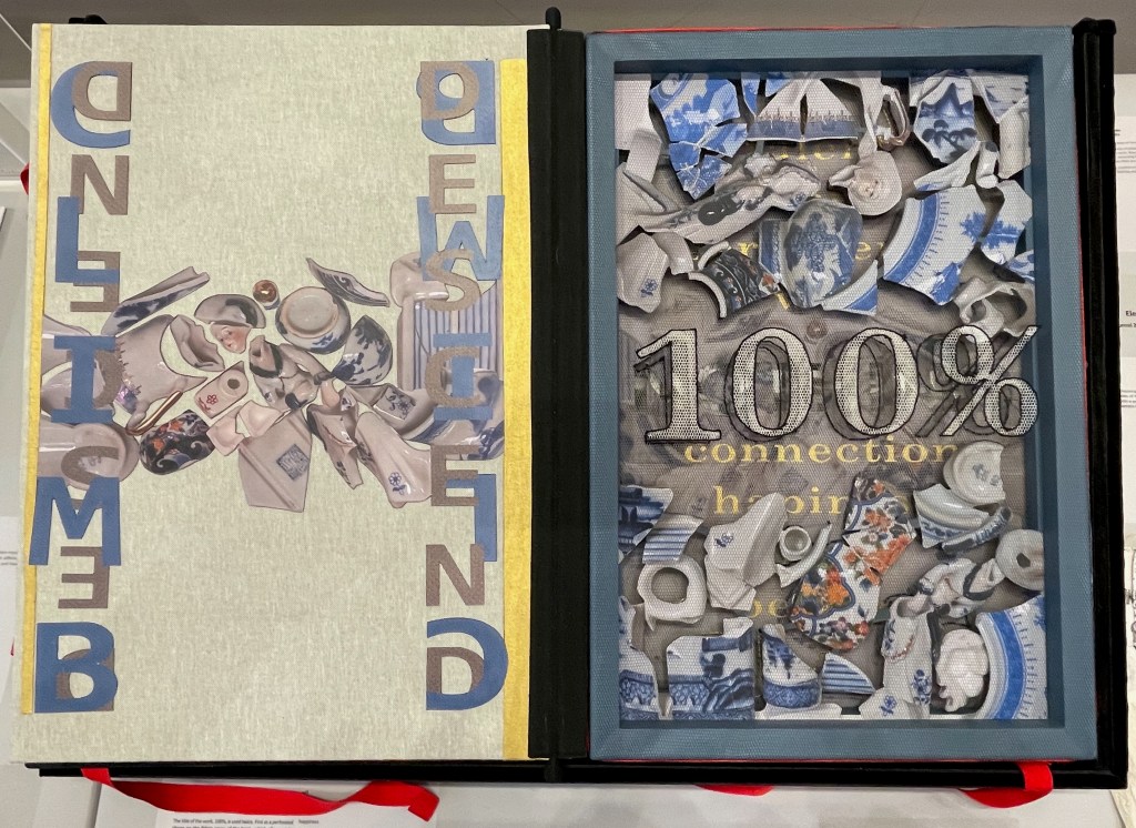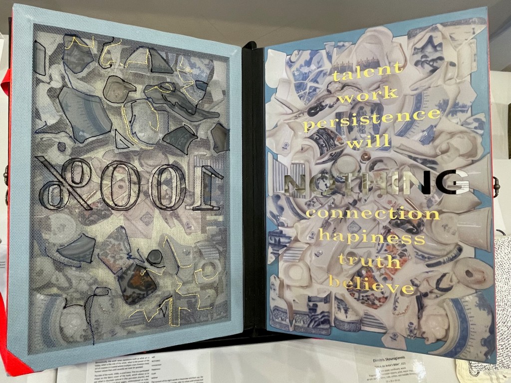 100% An Artist’s Bible (2025) Dimitris Skourogiannis Japanese paper, cardboard, wood, fragments of porcelain objects, print, metal rings, acrylic pains, fabris, tulle, and metallic threads. 500 x 350 x 140 mm. Photos: Books On Books.