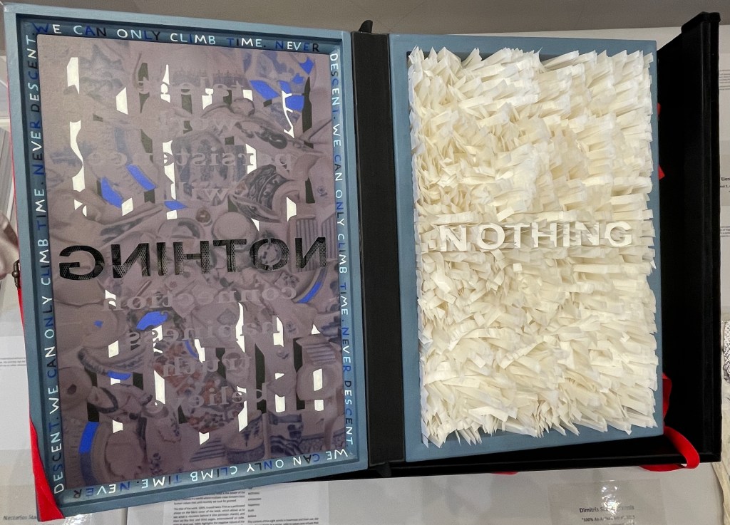 The curators’ choice of title and epigram for this exhibition is somewhat daring. Although they have included plenty of bibliographical montrosities that fit Hampton’s definition, there are plenty of bibliographical beauties, too — even among the “monstrosities”. A strong attraction of this exhibition is that it presents so many recent works from Greek book artists. Even more attractive is its hands-on display of most of the works.