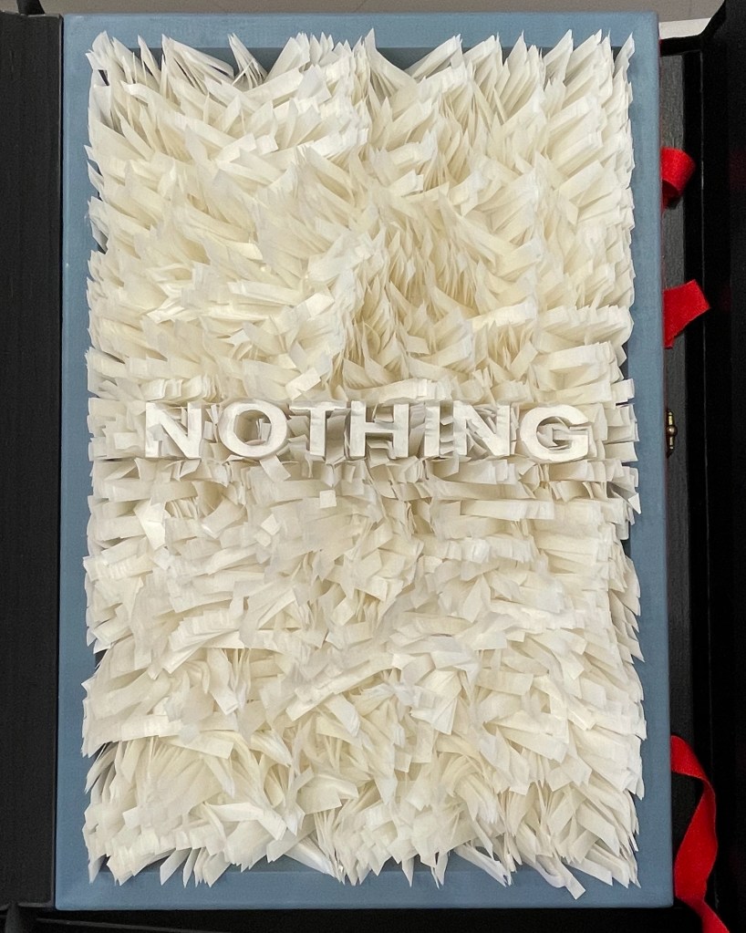 Given that the portmanteau term “bookmorph” comes from Michael Hampton, it seems appropriate that he has two works on display. Although one of them is under glass, 12 Chairs (bookmorph) (2012), the other is not. RAGE PEN by Hampton and David Blackmore is the UK contingent’s only work produced in 2025. Others from the UK contingent include Sarah Bodman, BOOKEND, Jonathan Callan, Joe Devlin, Stephen Emmerson, SJ Fowler, Rowena Hughes, and the Inscription Journal editors (Gill Partington, Simon Morris, Adam Smyth). RAGE PEN is also particularly appropriate because it requires a ruler to separate its perforated fore-edges. The exhibition provides one along with multiple pairs of white gloves. Really hands-on.