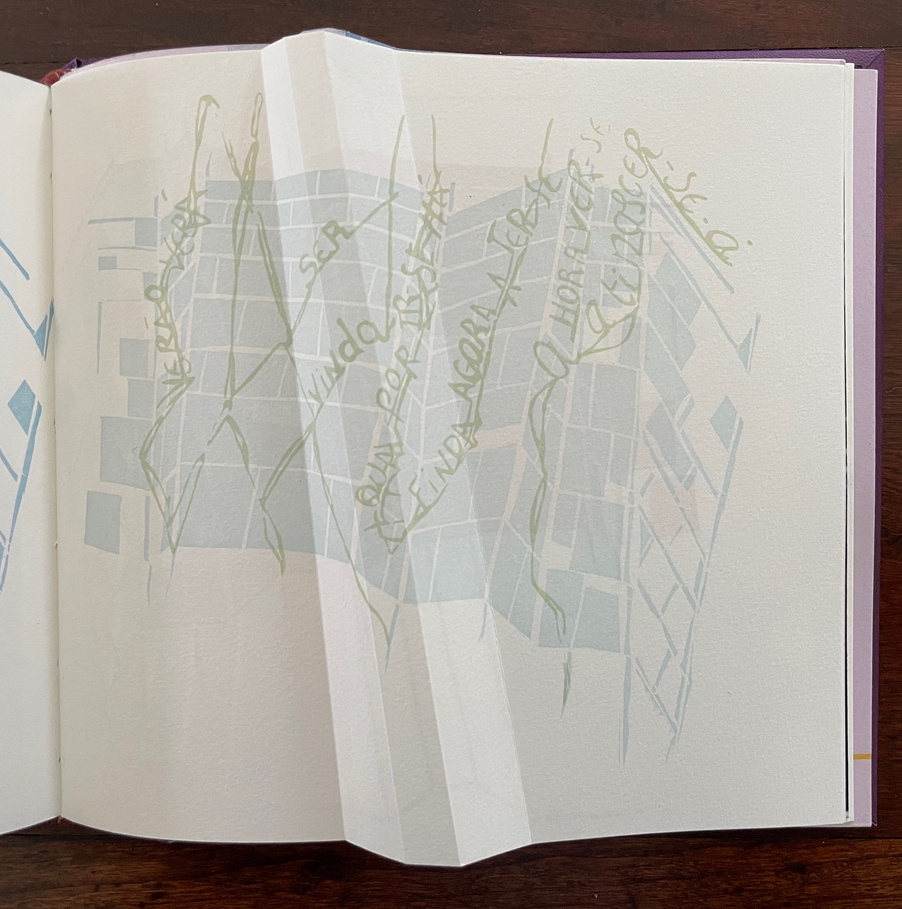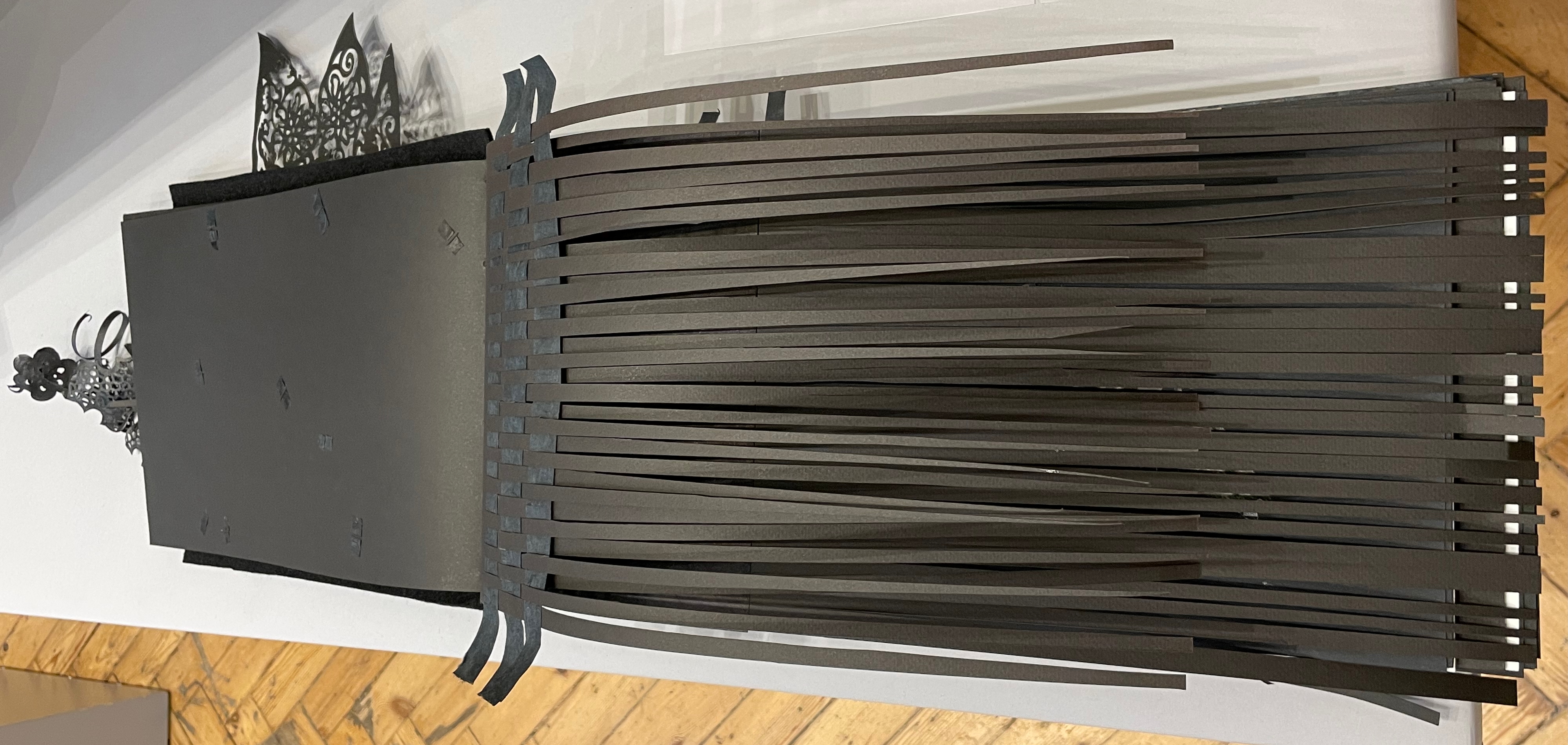 Inside, other decorative features offer further dual functionality. The sculptural element that provides the top’s weight also serves as a protective mould inside for the book and mirrors its dominant and recurrent physical feature: the creased shape slanting in parallel to the title slip tacked to the cover. Cordeiro refers to the creased shape as an “angled beam”.