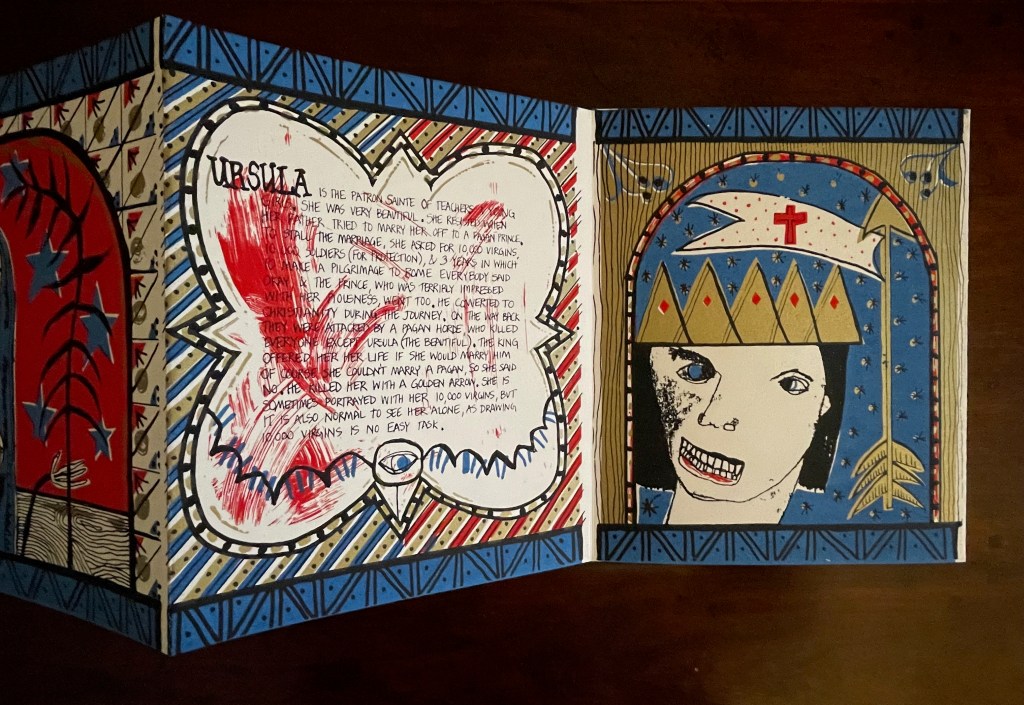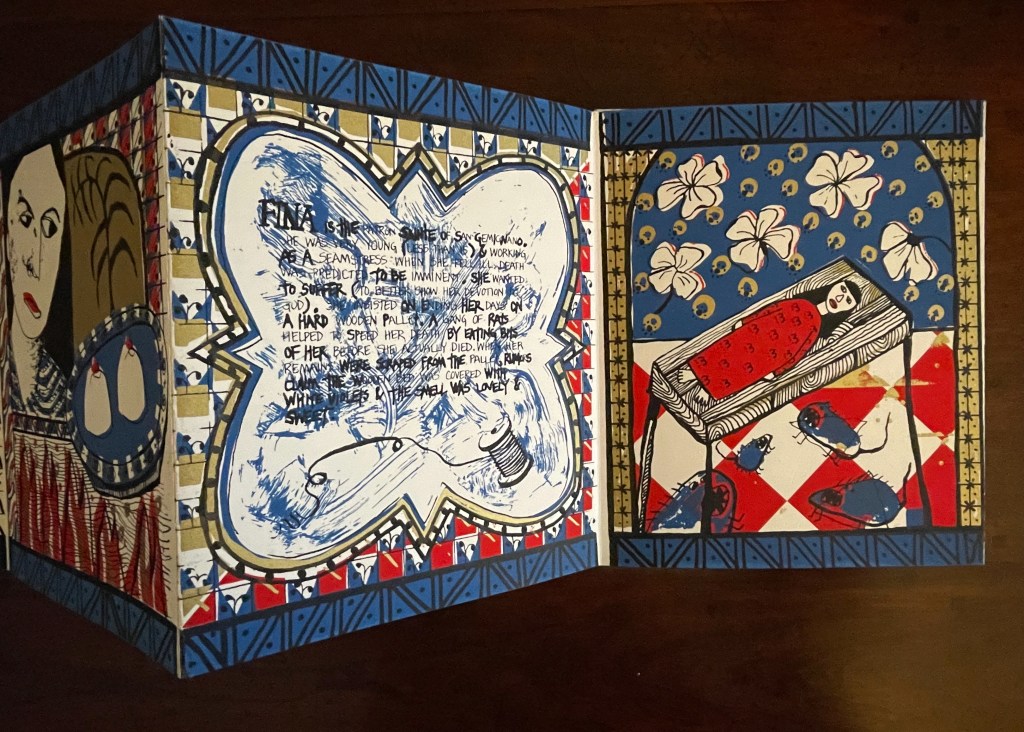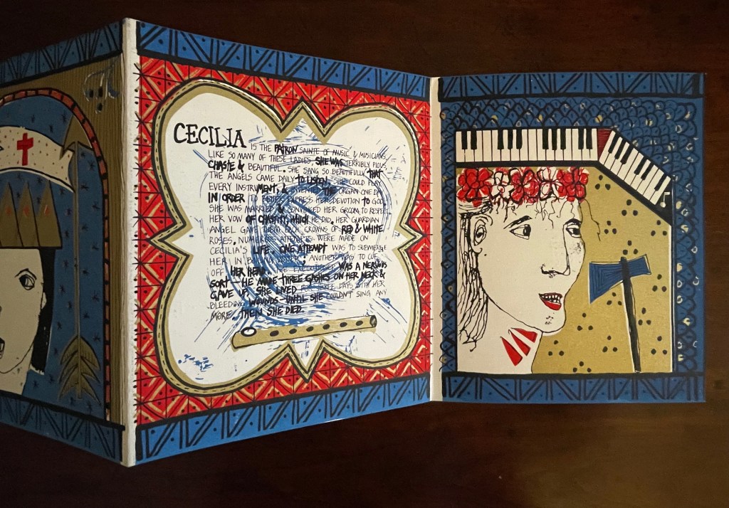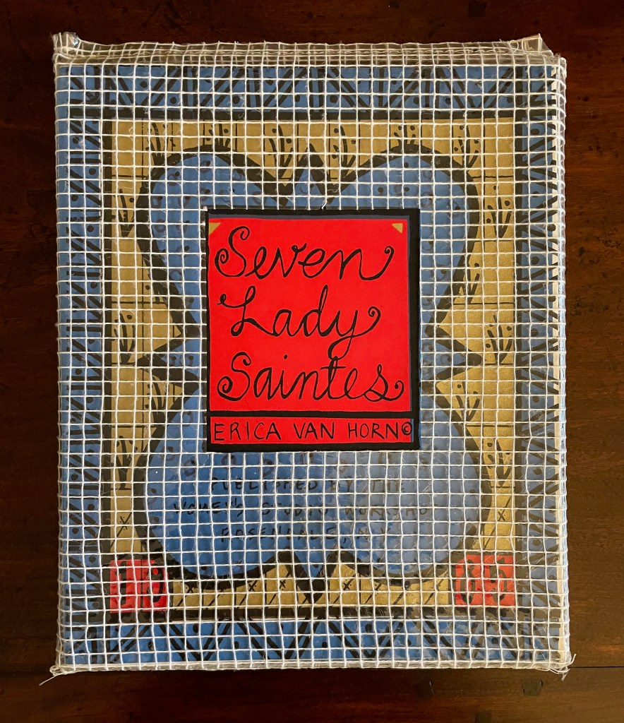 The hunt for Erica Van Horn’s Seven Lady Saintes has been long, but at last, in a glass case in Conway Hall at the Small Publishers Fair in London this year, there it was. Van Horn and Simon Cutts (co-founders of Coracle Press) have been a regular feature of the Small Publishers Fair since its first occurrence in 2002 at Royal Festival Hall.
