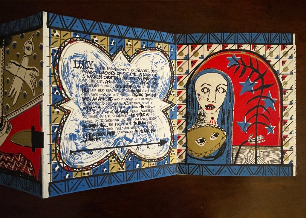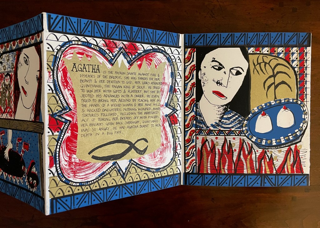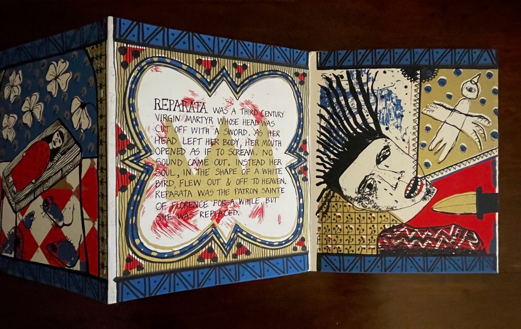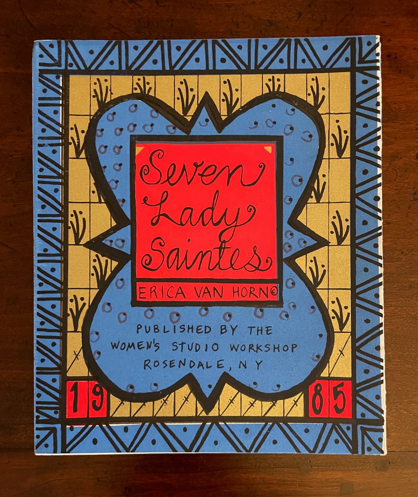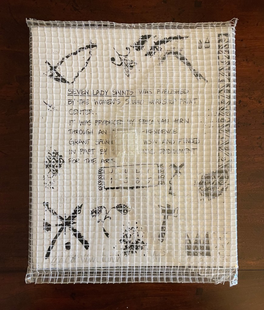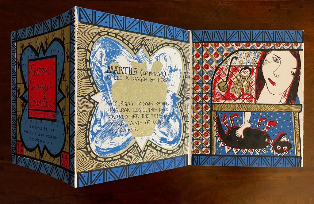 With stained-glass colors, Seven Lady Saintes splashes its own brand of sardonic humor across a stiff-card leporello produced in 1985 at the Women’s Studio Workshop Print Center in Rosendale, New York.