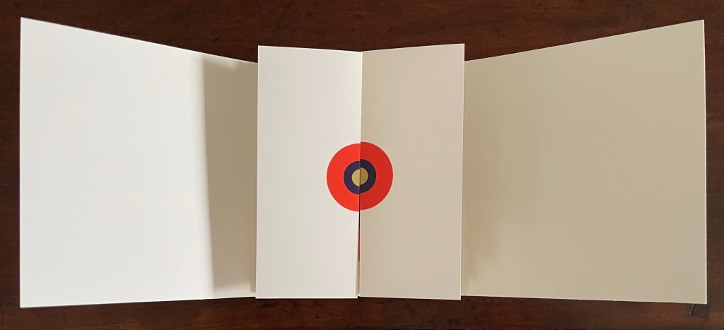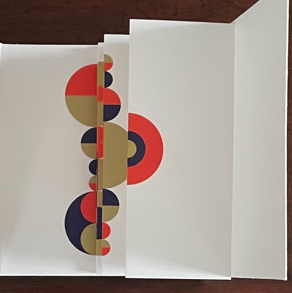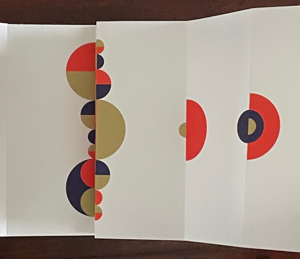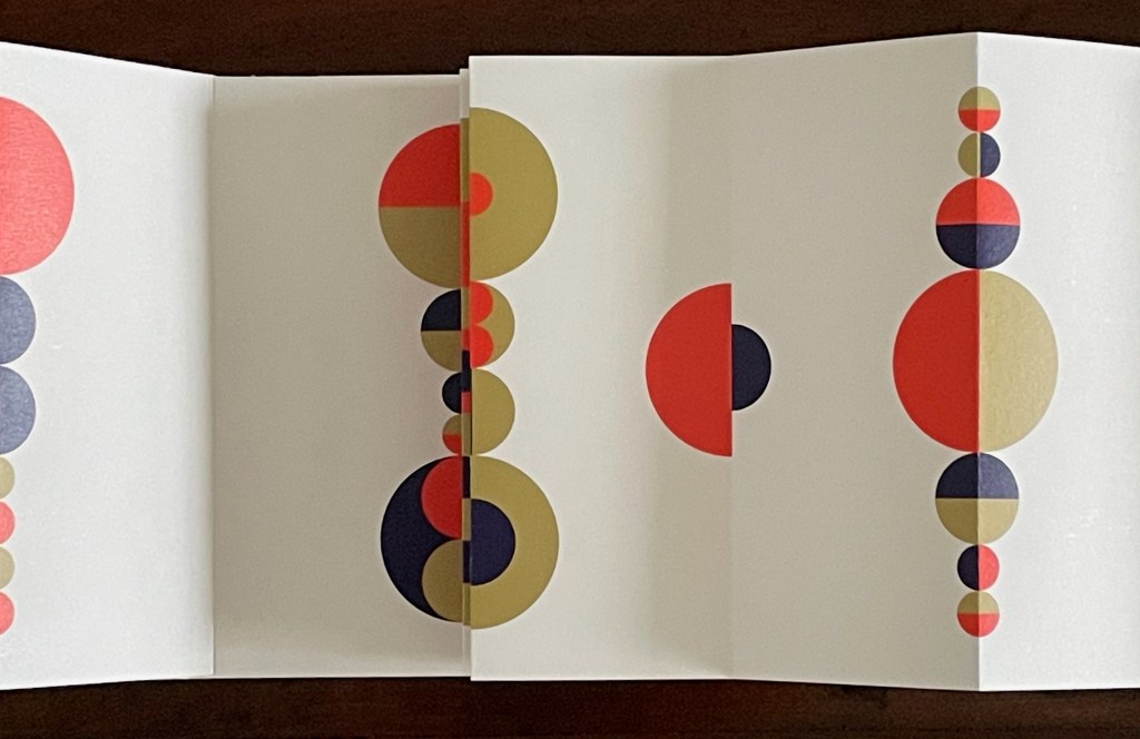 Based in Montélimar, France, and Seoul, South Korea, iOiO Studio produced this ingenious micro-edition leporello that invites its audience to behold and play. The folds and registration of images allow the viewer to find and create new shapes and color combinations. Its shapes and colors might remind viewers of Heinz Edelmann’s art for The Yellow Submarine. In its appeal to the child in the adult, it will remind book art enthusiasts of the works of Katsumi Komagata, Warja Lavater, Bruno Munari, and Peter and Donna Thomas. In its sophistication, it might remind them of the contributions to LL’Éditions leporello series. Many other connections can be found in Stephen Perkins site Accordion Publications, where Pliplop first came to my attention.