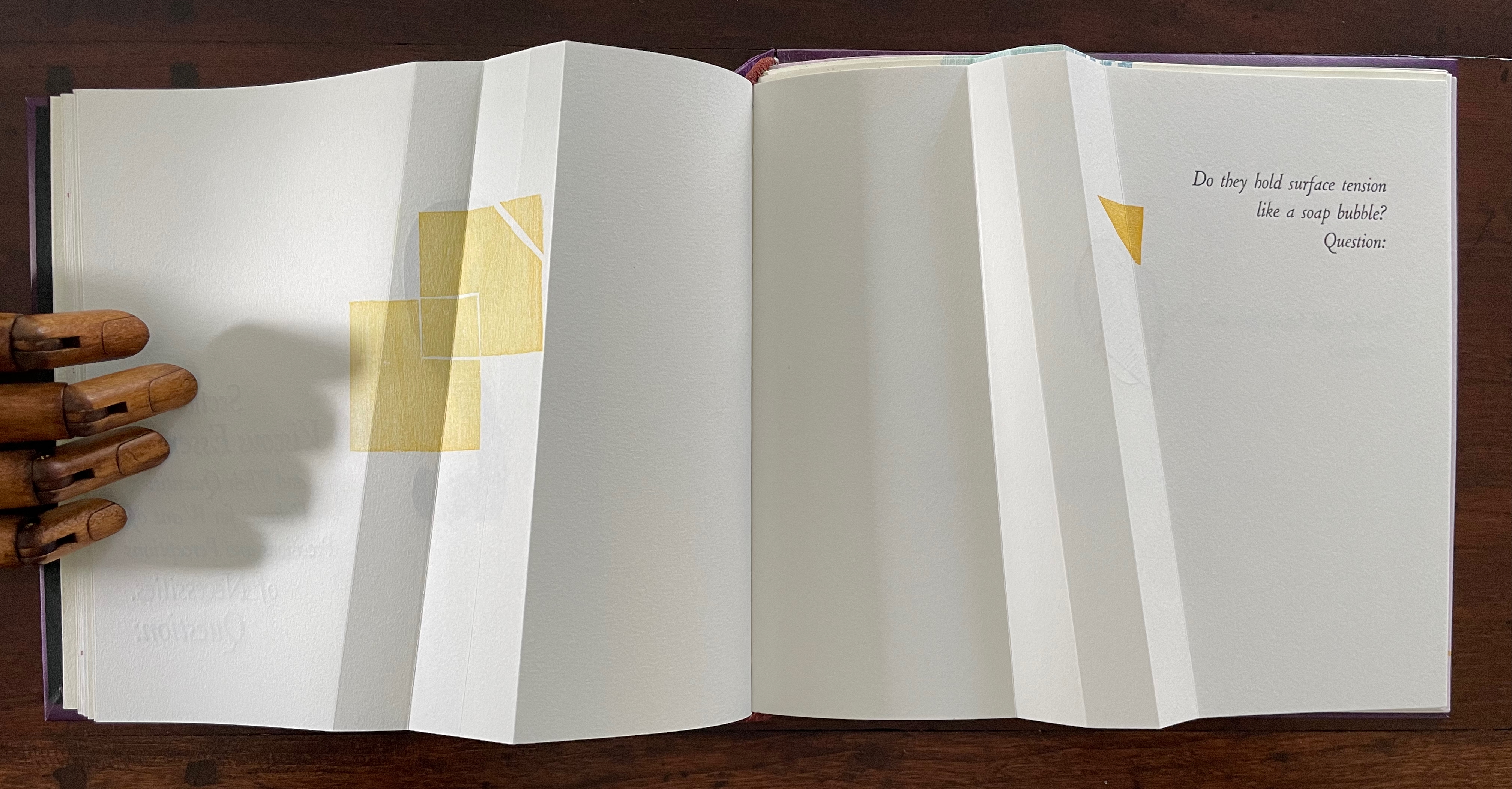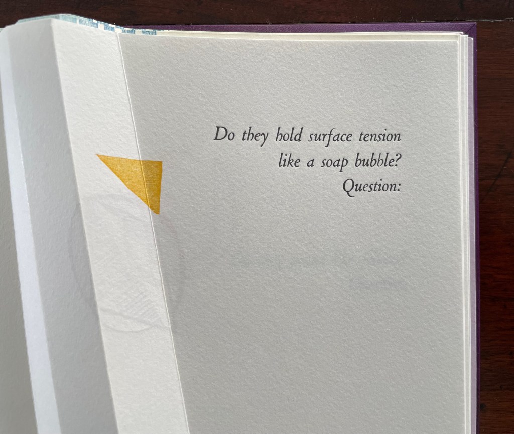 The geometrical images associated with the first question (“Do they hold surface tension like a soap bubble?”) seem to float or progress across the double-page spread, breaking up to punctuate the question. Reminding us of opposites and abrupt changes, the angular yellow overlapping squares and triangles puncture the text’s round verbal soap bubble. Before we can ask to what or whom does “they” refer, we are prompted by “Question:” to turn the page.