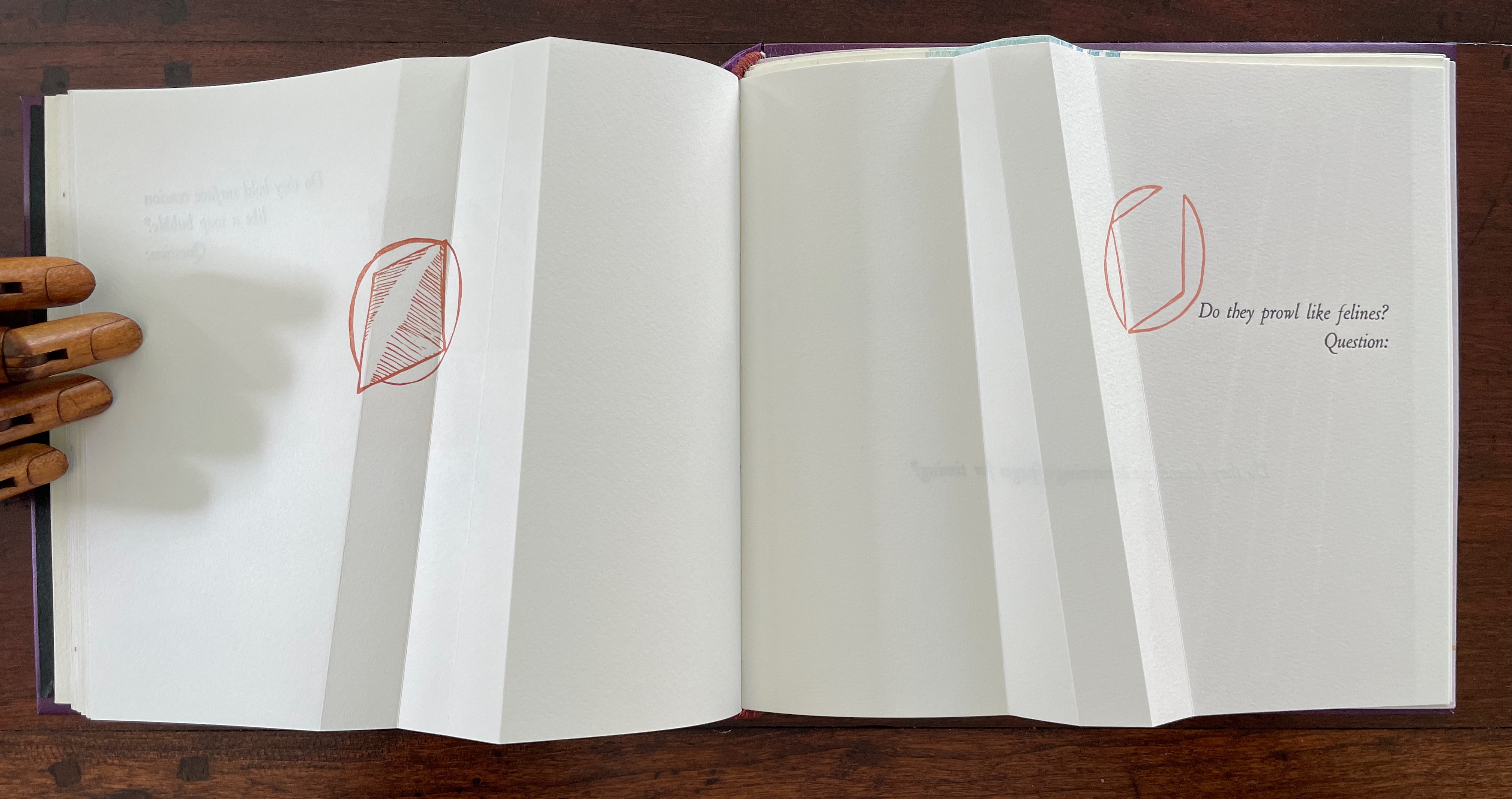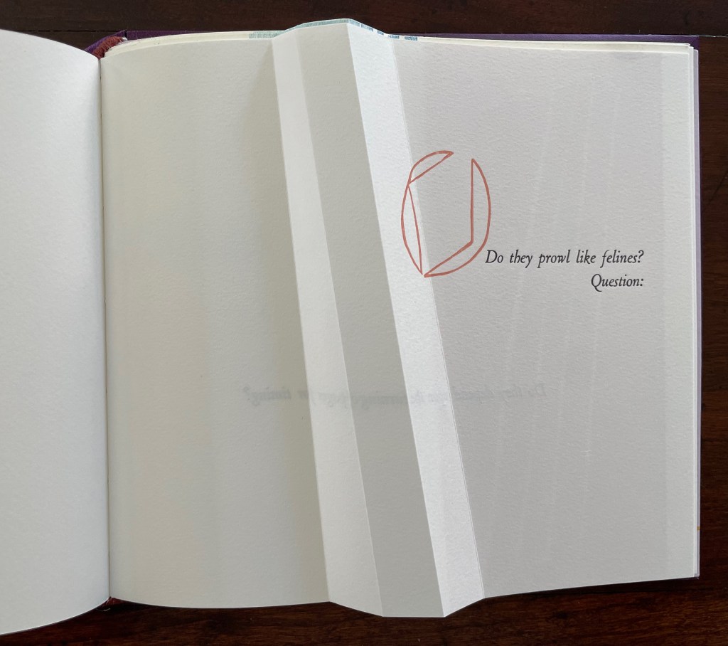 The next question (“Do they prowl like felines?”) prods at the unasked question: what or who are “they”? How is it that “they” are like prowling felines? Again, the images seem to progress across the spread, with the first image’s central diamond shape disappearing to leave the curvilinear second shape leaning over the printed question. Might these be diagrams of the limp vellum structure’s sewing holes and lacing? If so, has Cordeiro found another metaphor for limp vellum structures in the supple and sinuous strength of prowling felines? Do “they” refer to limp vellum structures?