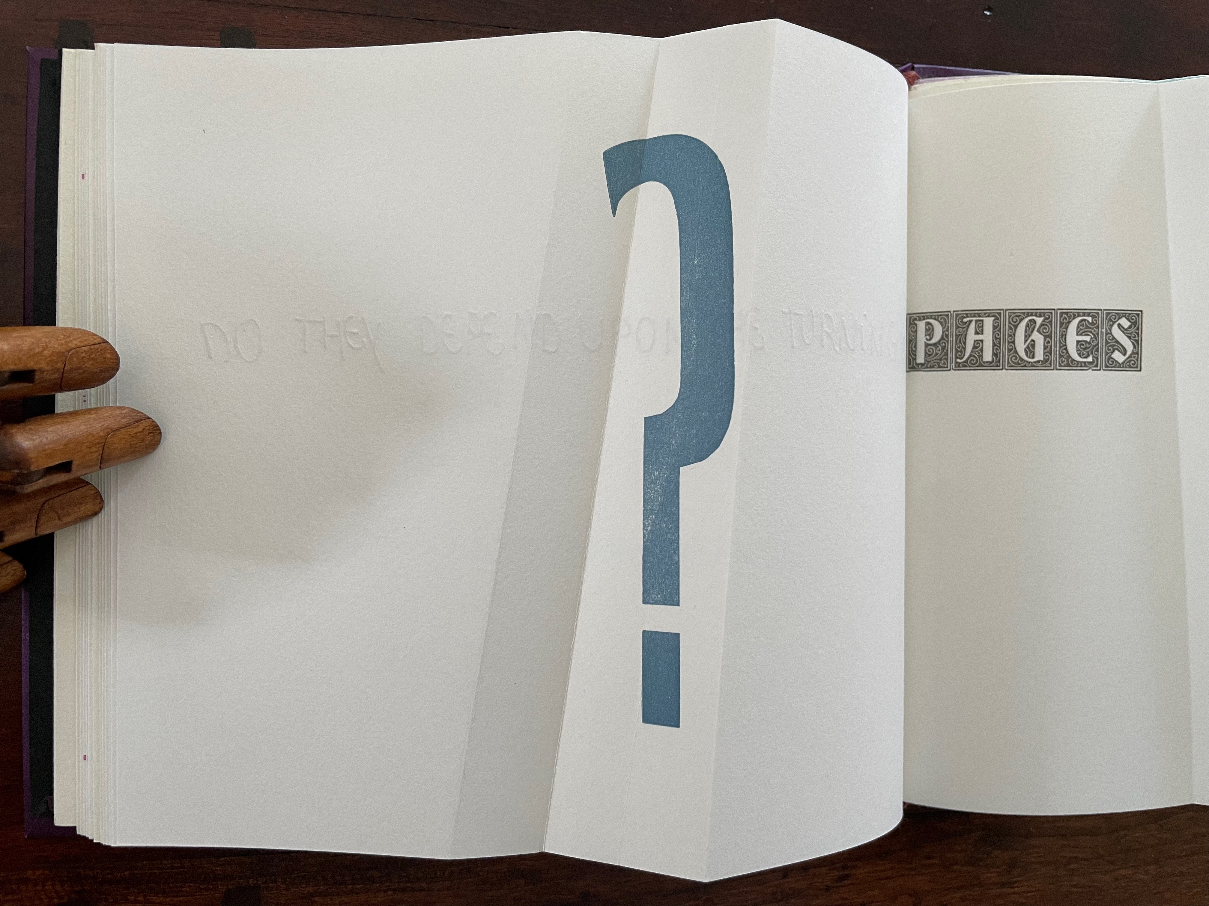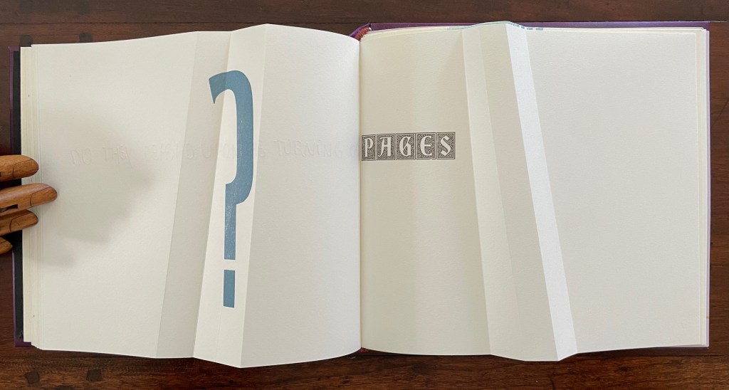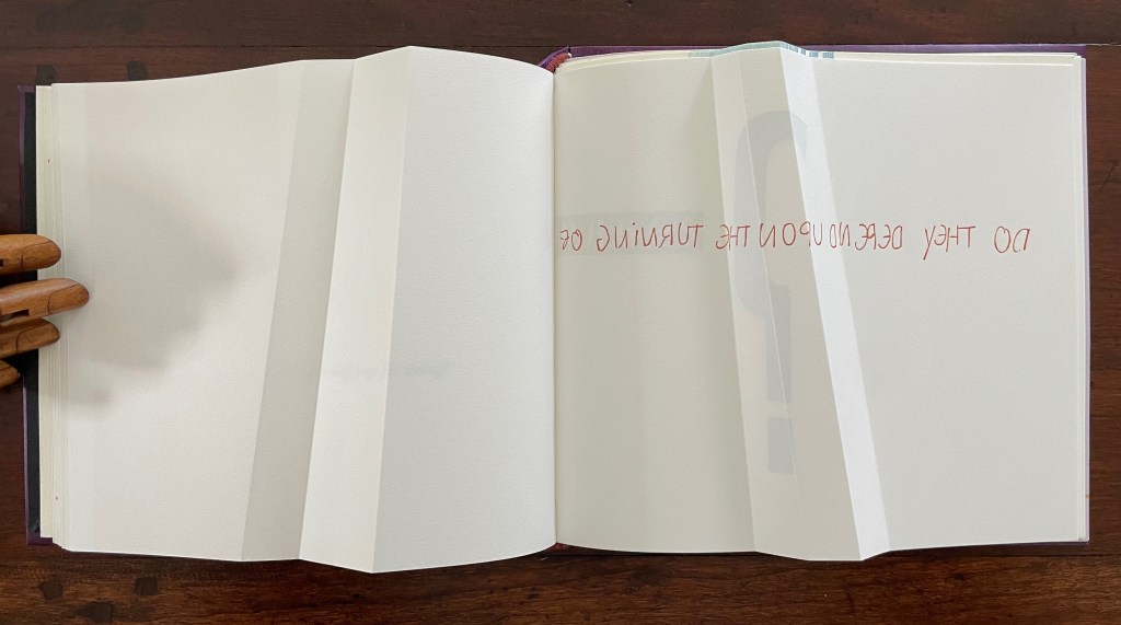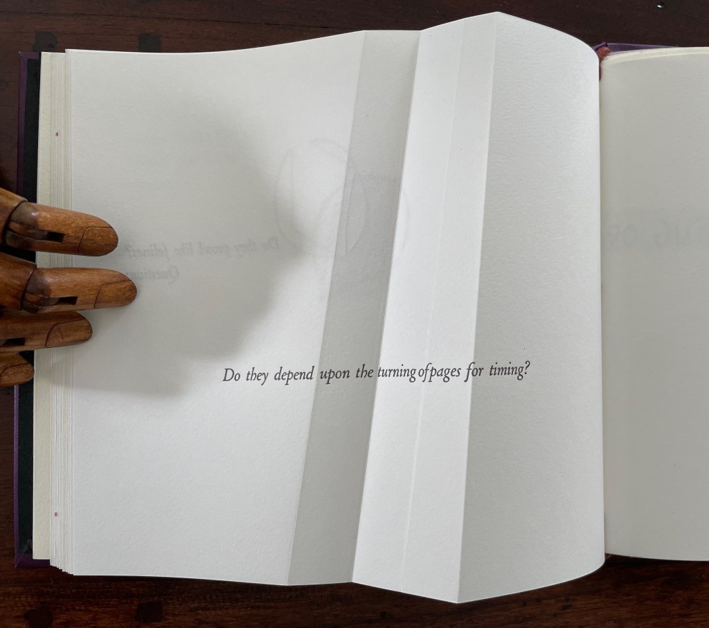 The next question enacts itself. To read the mirror-written script, we have to turn the page and look through its surface to the right-reading words: “Do they depend upon the turning of”. The question completes itself in a curious (again) metronomic motion. The syntax draws our eyes to “PAGES” on the right, while the oversized punctuation mark syntactically draws our eyes back to the left. The play between the reversed writing on a recto page, the right-reading script on the verso, the display type on the next recto, and oversized question mark on the adjacent verso provide self-reflexively an affirmative answer: Yes, limp vellum structures depend on the turning of pages.