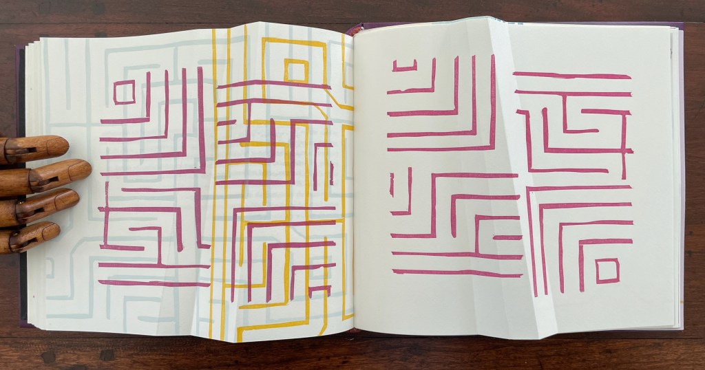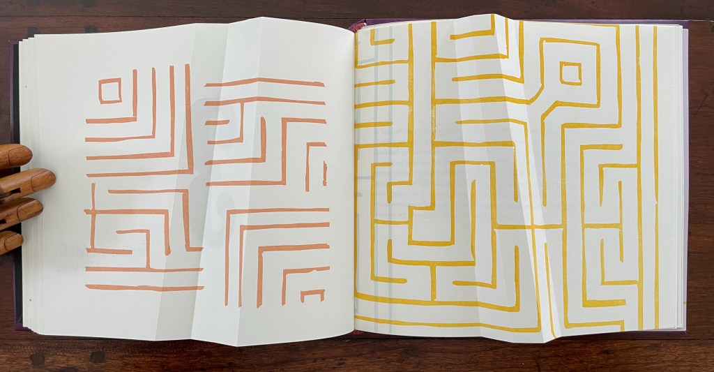 Cordeiro brackets the excerpts with maze-like images constructed of mirrored forms across four different colors. So we have the continua of mind to matter and of genius to madness embedded in a continuum of color and form (color and form merging).