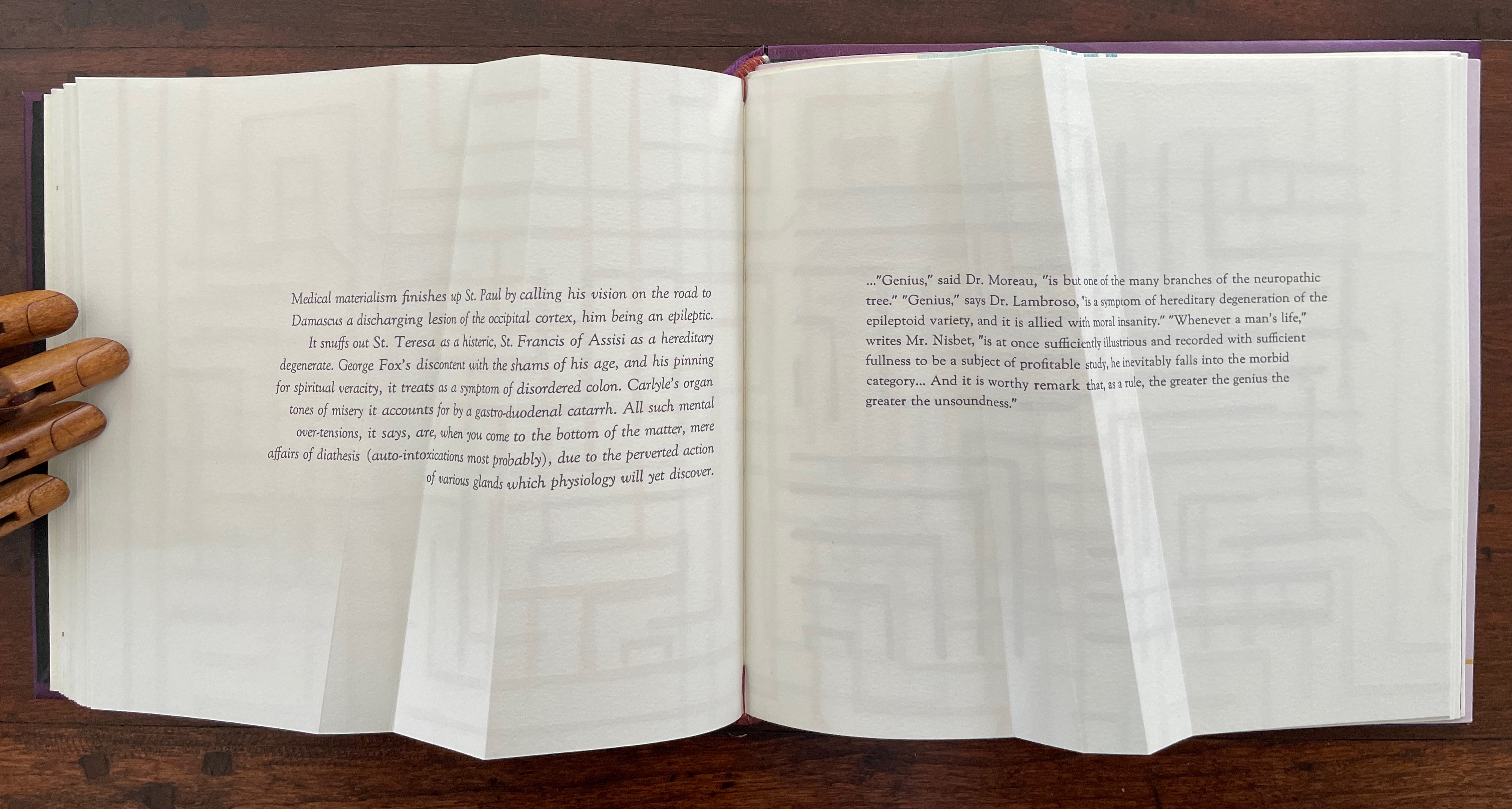 Part 3 introduces rather more esoteric continua with which Cordeiro seeks to connect the genius of the limp vellum structure. The Section letters M, M and G are her reminders-to-self that this section excerpts passages from William James’ The Varieties of Religious Experience (1902): one on medical materialism (p.14) and another on genius (p.18).