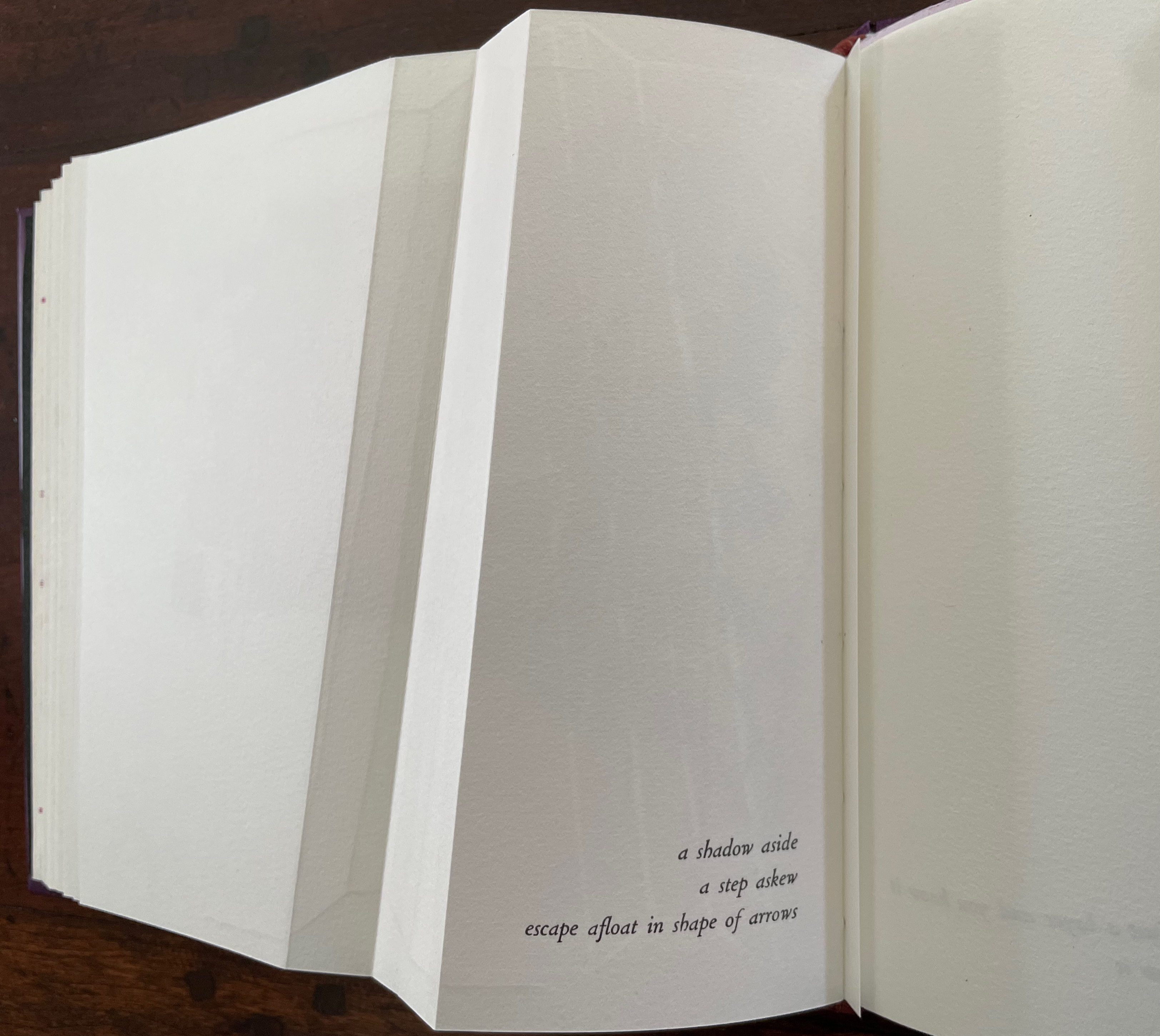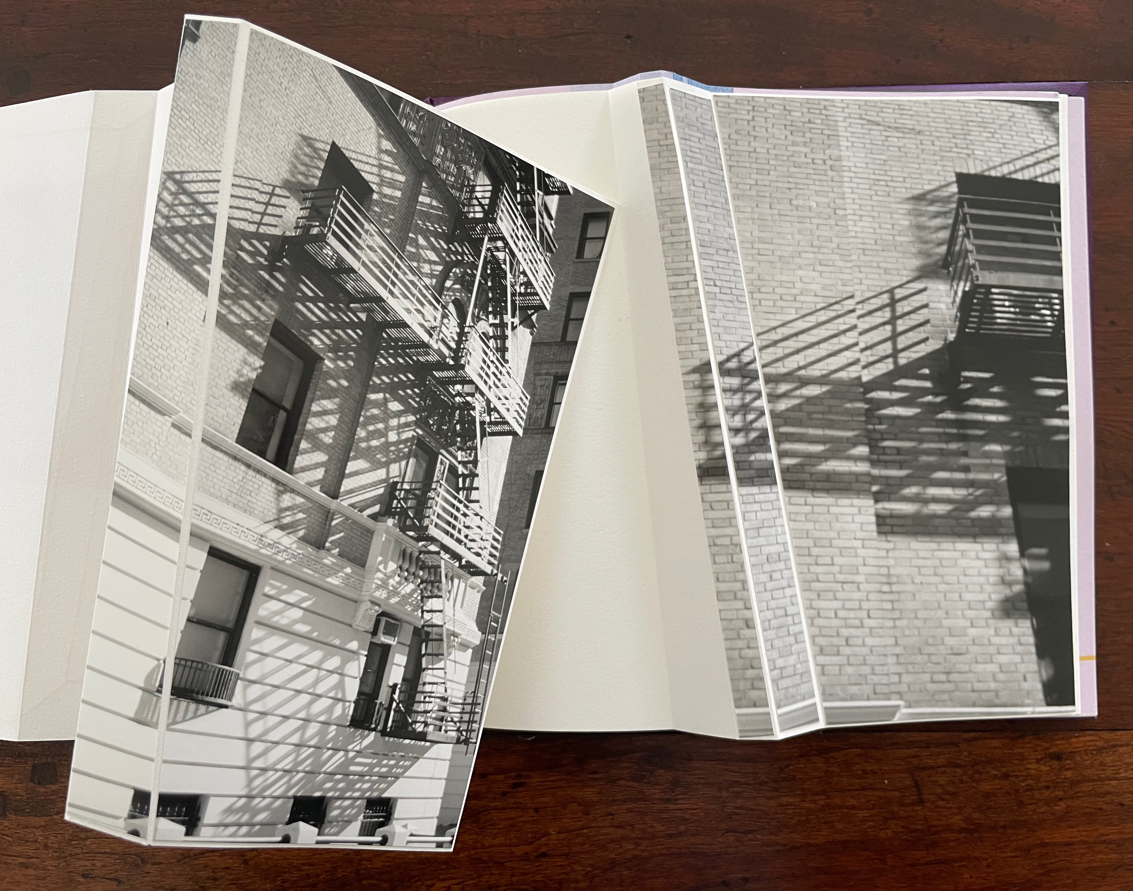 “a shadow aside / a step askew / escape afloat in shape of arrows”. The segmented photos of an Upper West Side building’s fire escape articulate with the angled beam shape to echo the text.