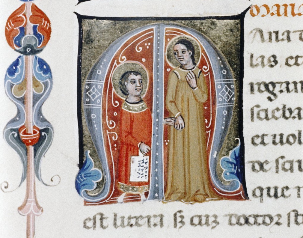 The image shows Christ being brought to school by his mother. He is bringing his “textbook” to class: a hornbook, which dangles from his wrist by a string, just like many of the later specimens did … Quite intriguingly, we are shown a real medieval snapshot of how children carried their hornbook to and at school. More importantly, it shows that the hornbook was indeed a medieval invention….While no actual hornbooks appear to survive from the medieval period, these visual representations show that educating young children was also the driving force behind the production of hornbooks in the age before print.