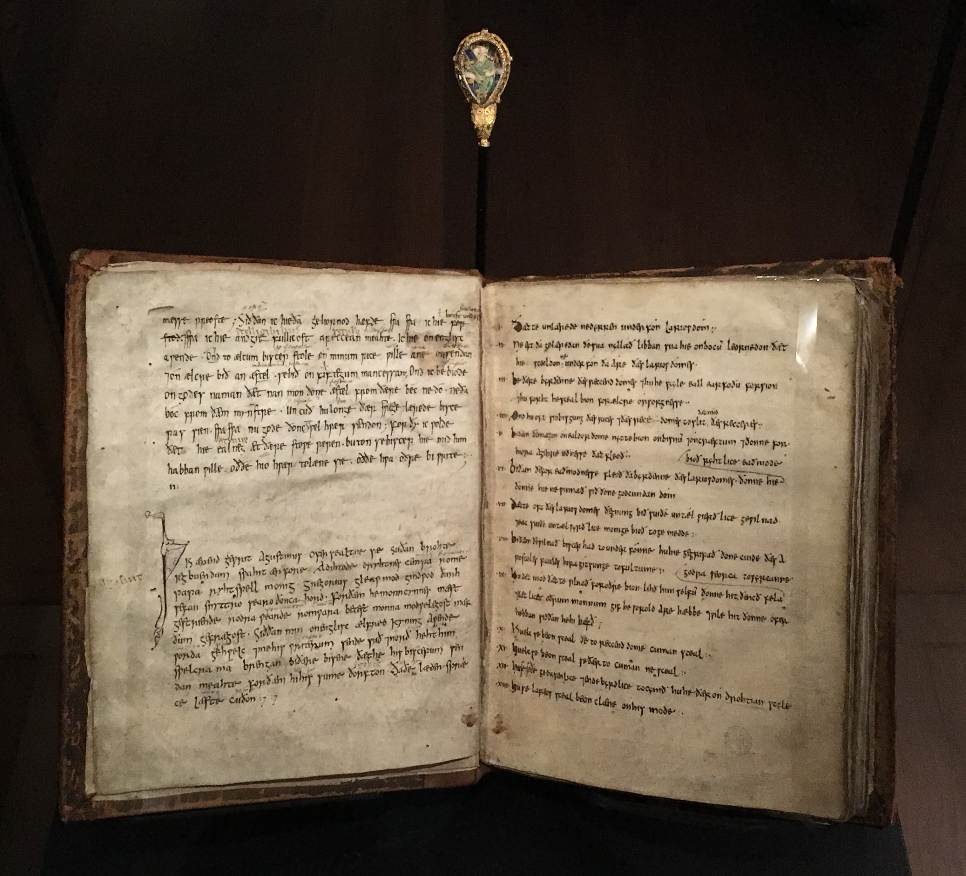 Above: “The Alfred Jewel”, enamel and gold; late 800s; found at Petherton, Somerset, in 1693. The Ashmolean Museum, Oxford, presented by the Estate of Colonel Nathaniel Palmer. Below: MS. Hatton 20, fols 2v-3r. St Gregory the Great, Cura pastoralis, translated by King Alfred and copied 890-897. This copy of St Gregory’s manual for clergymen “speaks” (bottom left) of how Alfred “sent me to his scribes north and south”.