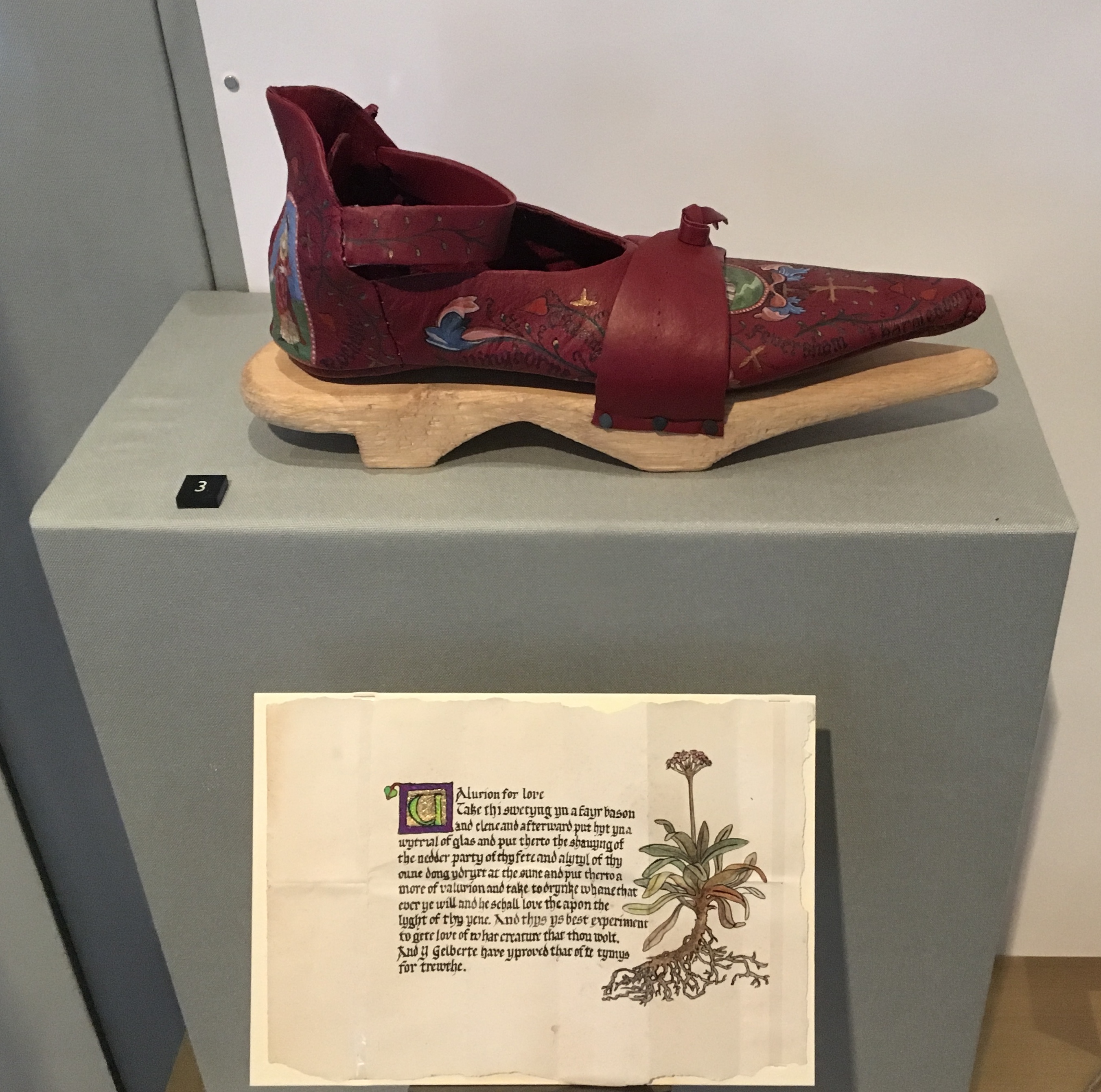 Paper charm: Selected from a section on Medical Remedies and Charms from the 1400’s for the concealed charm written by hand on paper, housed in the heal of the shoe.