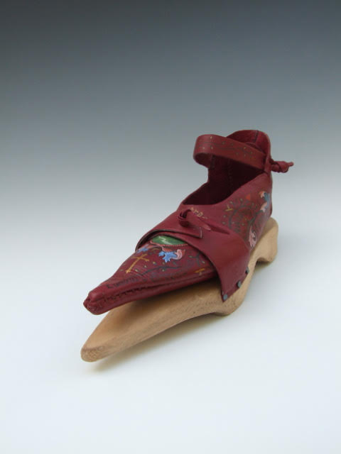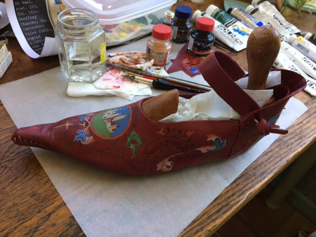 I hand painted images and added calligraphic text on the shoe. The place references from London to Canterbury were researched using various historical sources including the Gough Map http://www.goughmap.org/about/