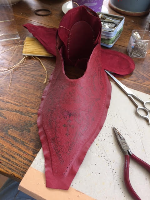 With this in mind I made a Poulaine style shoe with wooden patten specifically for Chaucers’ ‘The Lady of Bath’, who may have been attracted by the decorated shoe both as a unique, sensuous status symbol and a map with which to find her way from London to Canterbury. Such a shoe might have been admired or found useful by fellow pilgrims en-route, and with a recipe for love (from the Anthology of texts) concealed within the rein-forced heal, perhaps she might attract a new husband during her pilgrimage.