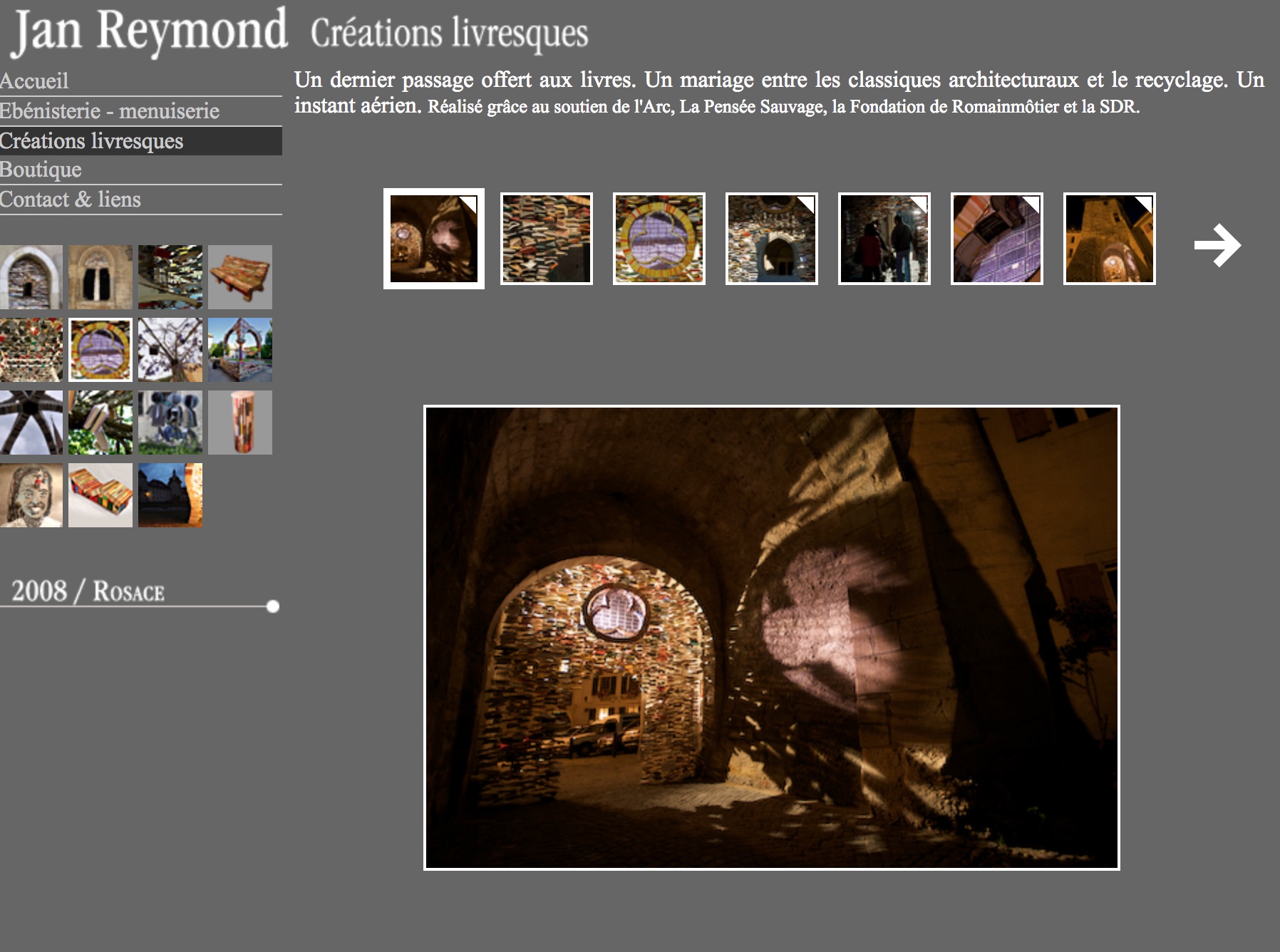 Since 2005 Reymond has created book art installations associated with the annual used book fair held in Romainmôtier, Switzerland.