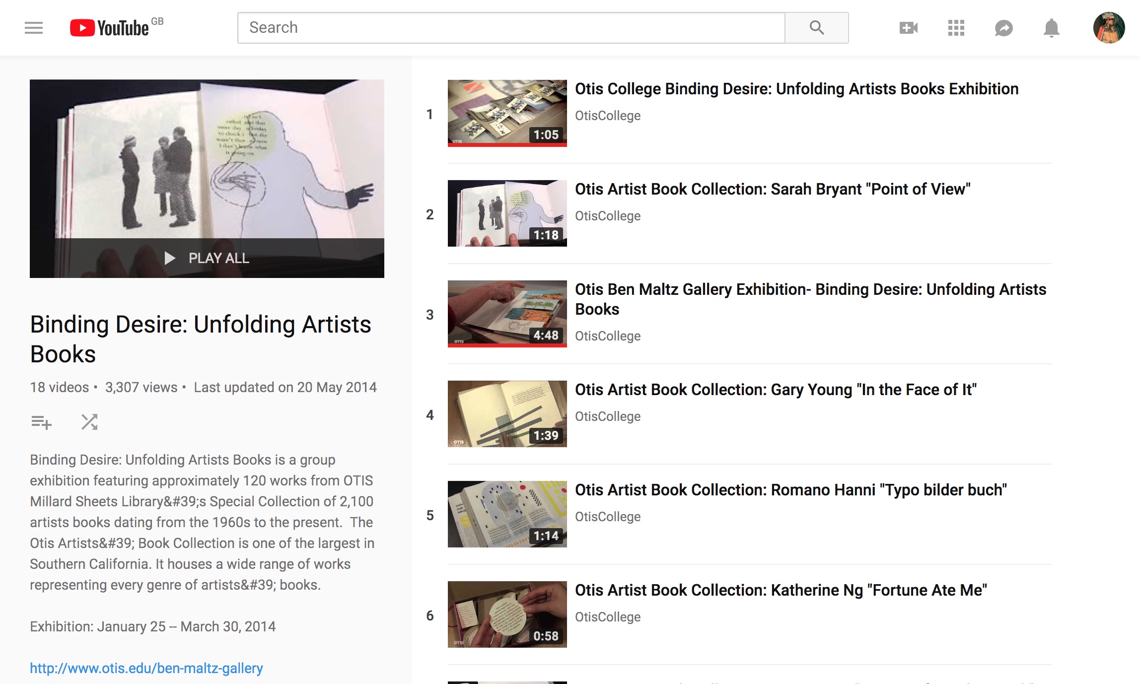 This 18-video playlist at the Otis College of Art and Design covers a 2014 exhibition highlighting around 120 works in the Artists Book Collection. The playlist contributes to the collection’s goal: