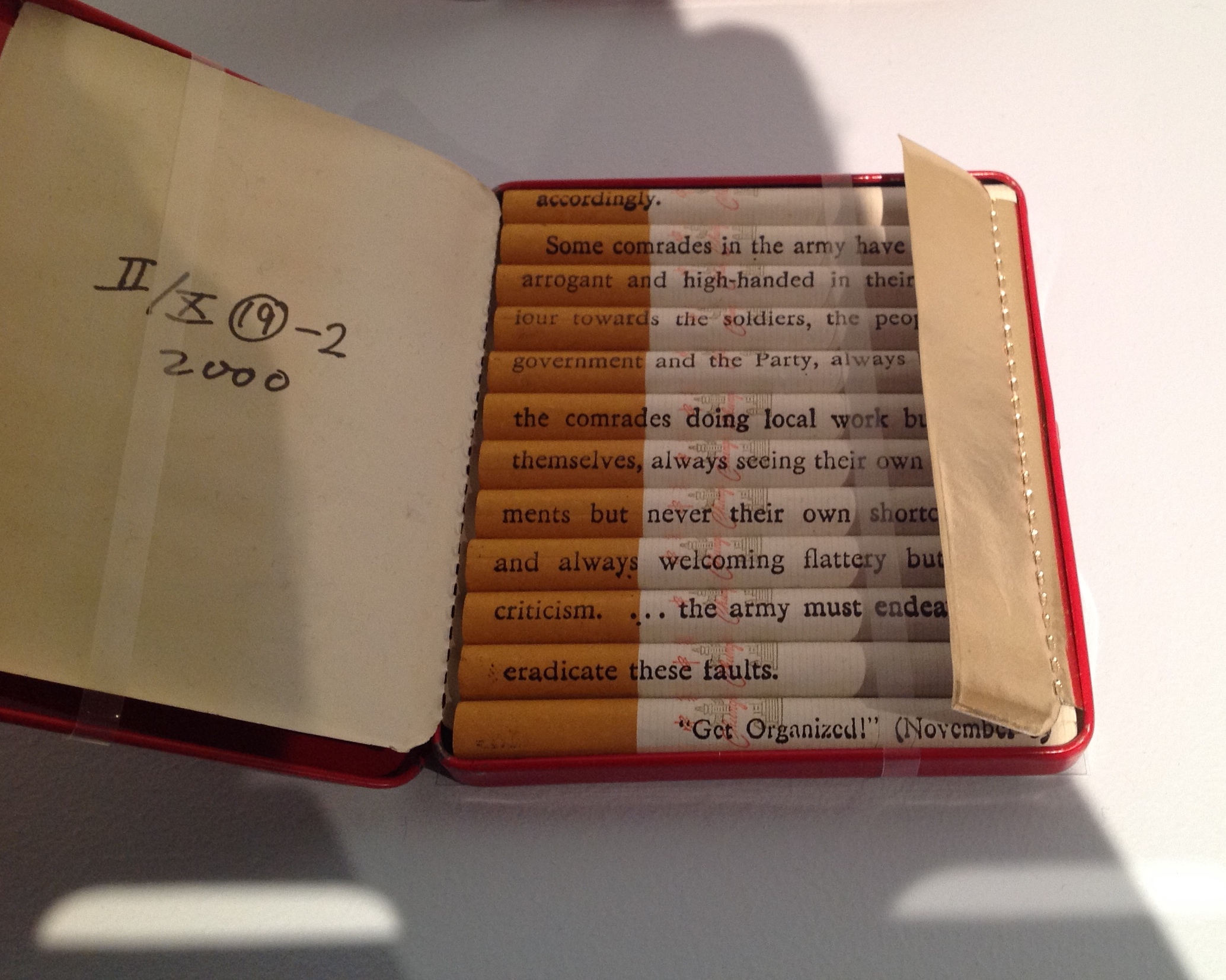 Xu’s Tobacco Project trilogy, which began in 1999, incorporates Red Book (with Chinese and English inscriptions on each cigarette from Mao’s little Red Book), the floor sculpture Honor and Splendor (composed of 660,000 Fu Gui cigarettes) and several other related works. For an earlier in-depth piece on the Tobacco Project (and extensive illustrations), the reader can go to John Ravenal’s description in Blackbird (Fall 2011, Vol 10, No. 2). As the curator who organized the Tobacco Project exhibition in 2011, Ravenal’s perspective is unique. Like John Cayley, Ravenal also produced a book — Tobacco Project, Duke/ Shanghai/ Virginia, 1999–2011 (2011).