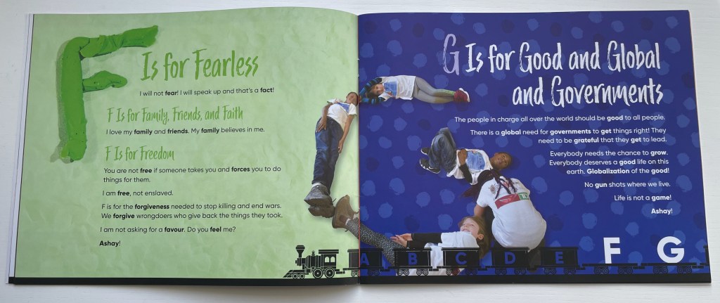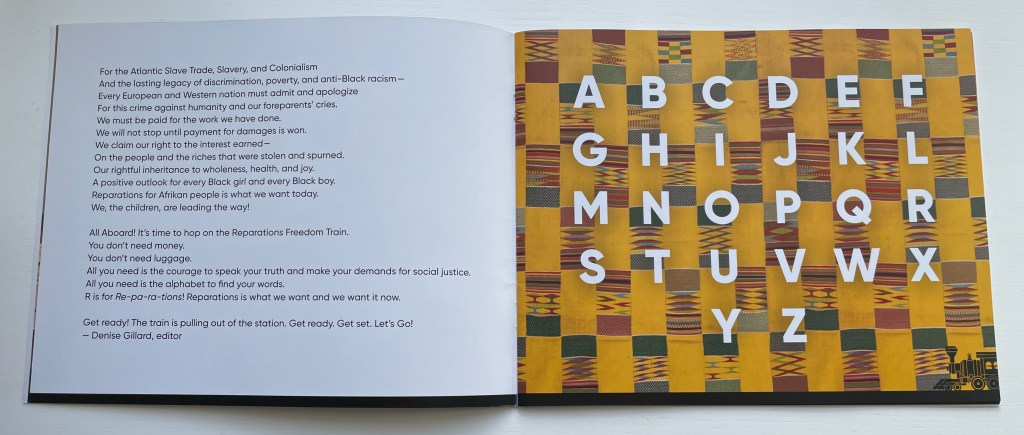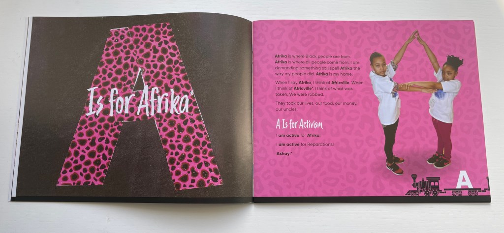 The foreword by Denise Gillard takes a less complicated view as might be expected in a children’s book, and as R is for Reparations addresses primarily Afrikans and Afrikan Descendants both on the Afrikan Continent and in the Diaspora, that view is strong and forceful. It is the sort of children’s book that would be banned in some US school libraries, but as the voices and bodies of its multi-racial cast of participants imply, it is the sort of book that those schools’ children could fearlessly manage.