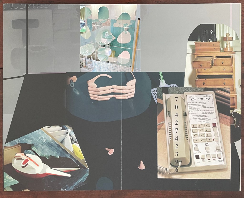But without the app or memory of the installation, we have a gap like that missing tooth. We can bridge the gap somewhat with online links and the book’s collaged imagery of mixed media and photographs to recognize that Making Memeries is also about how we perceive surfaces and what lies beneath — and what might come between. Consider the earplugs alongside the telephone below. Then there’s the pair of spectacles in the shape of fingers that would cover the wearer’s eyes. Now look back to the cover, and we find the view from behind those finger-spectacles.