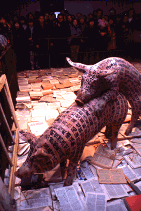 “Art and China after 1989: Theater of the World,” now appearing at the Guggenheim Museum in New York through January 7, 2018, includes work from Xu Bing and Huang Yong Ping. The exhibition attracted animal rights protestors and removal of works, one of which was Xu Bing’s video of his 1994 installation A Case Study of Transference. In a pen littered with books, Xu Bing presented two pigs, one tattooed with words in his now famous nonsense Chinese calligraphy and one with nonsense English words. The piece became infamous when the pigs, bored with the intercourse offered by the books, engaged in more mutually interesting discourse.
