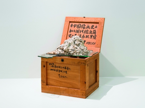 Huang Yong Ping: The History of Chinese Painting and a Concise History of Modern Painting Washed in a Washing Machine for Two Minutes, 1987/1993, ink on wooden crate, paper pulp, and glass, 30 by 19 by 27½ inches. Walker Art Center, Minneapolis.