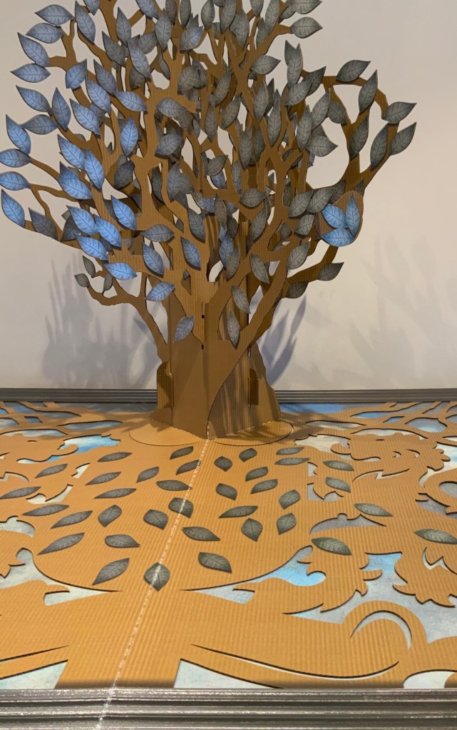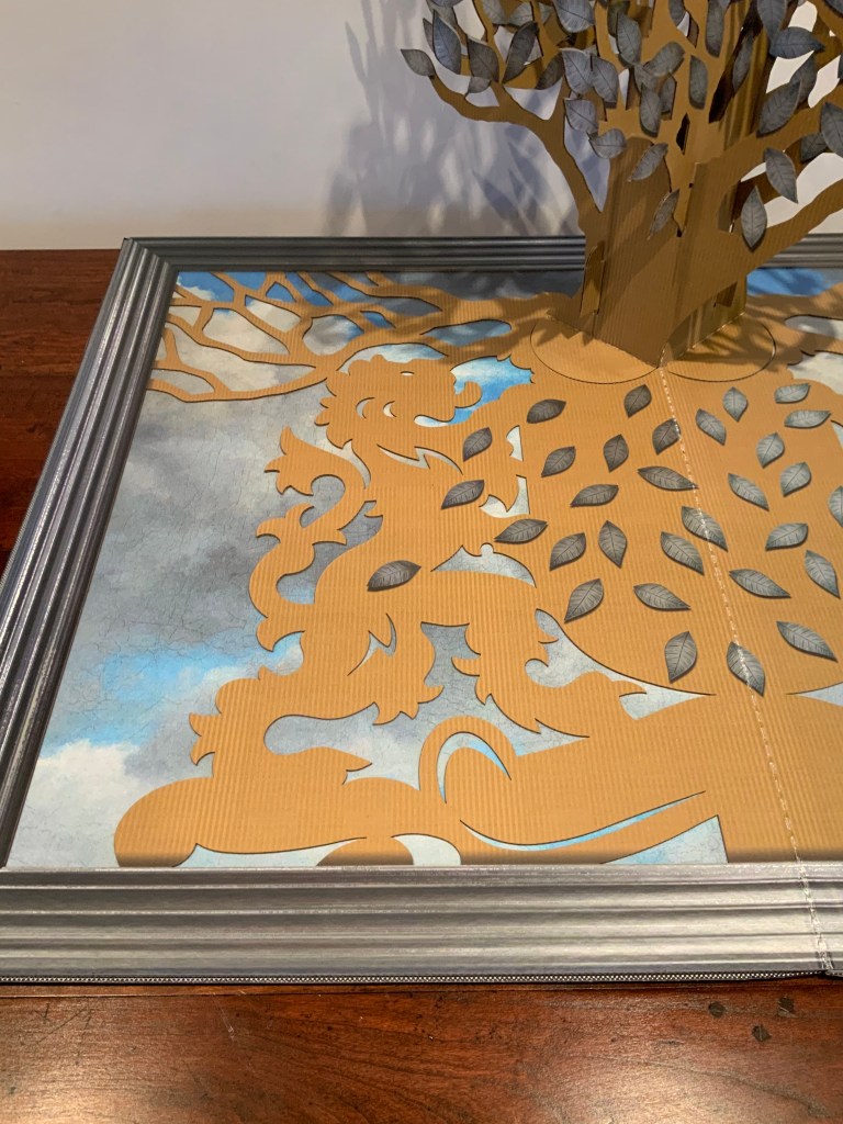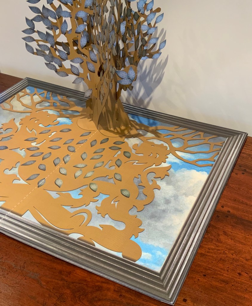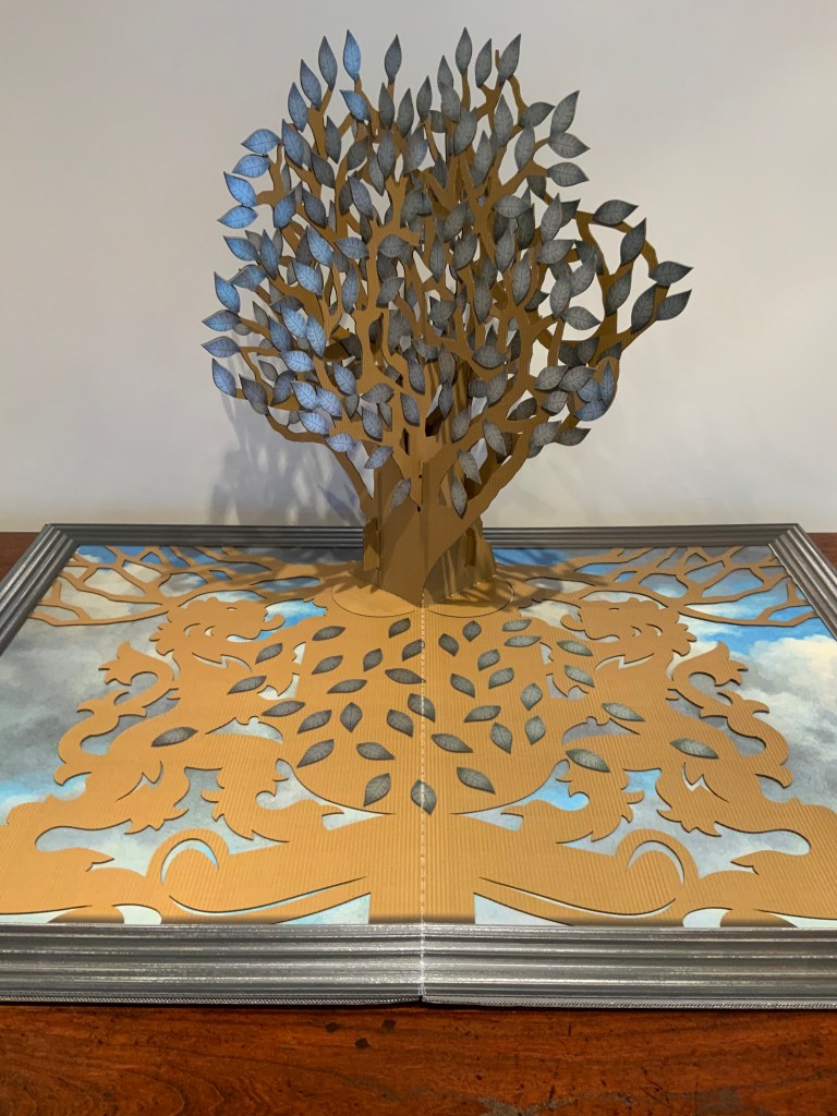 The tree trunk, branches and its roots represent the cultural values of all of Dutch people and the silver leaves symbolize the true assets of the Netherlands: the Dutch people. All parts of this artwork are interlocked representing the fact that all elements in a society are also interconnected. The cloudy sky visible through the base of the pop-up represents fantasy and the unreachable….