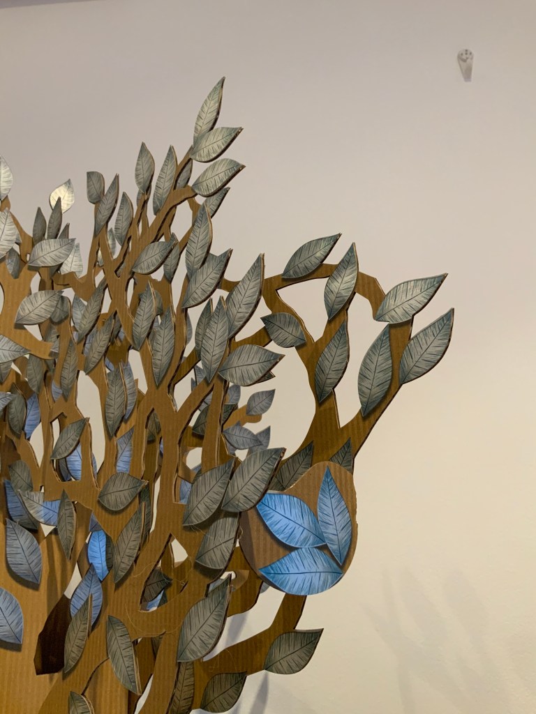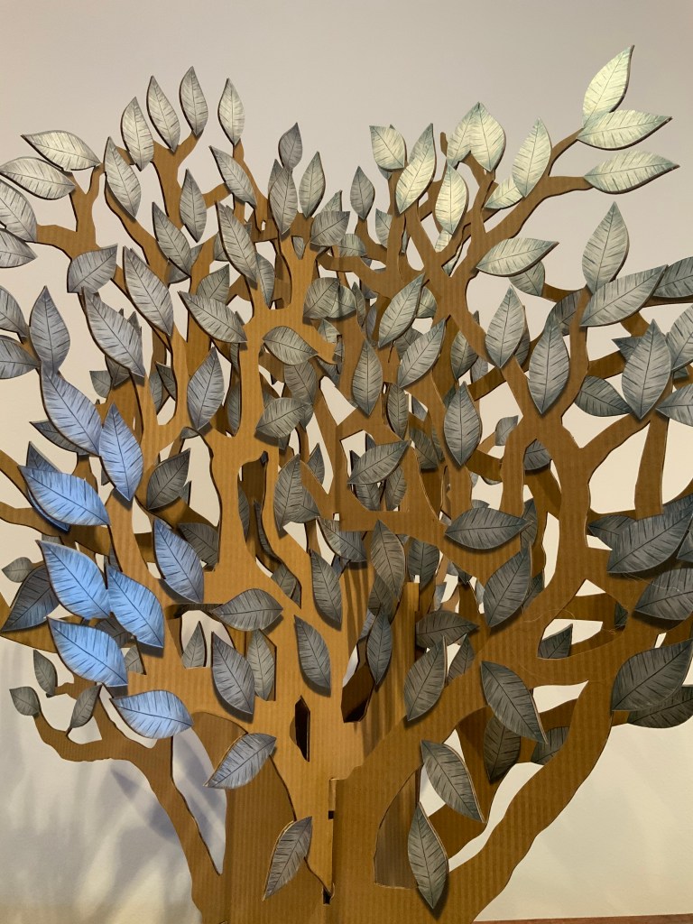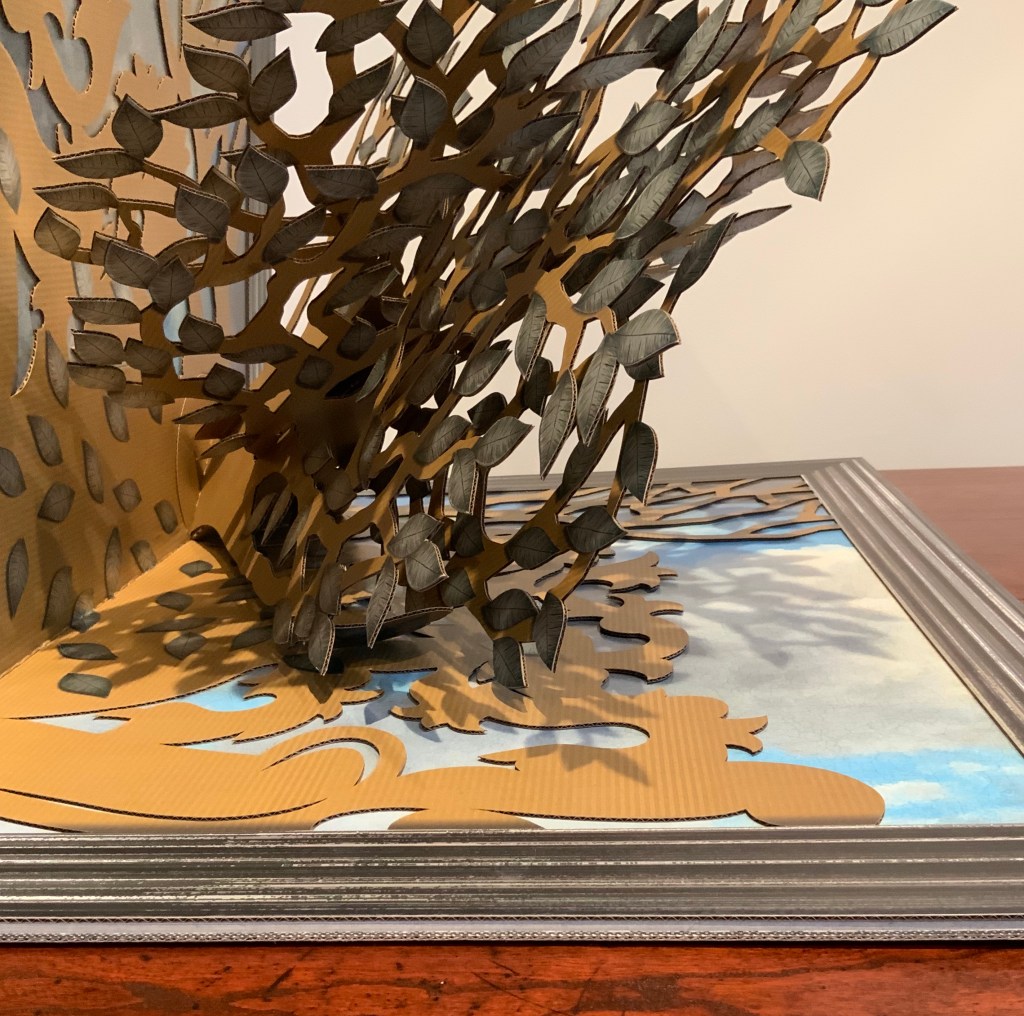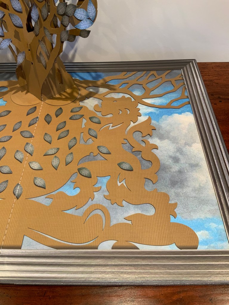 The tree trunk, branches and its roots represent the cultural values of all of Dutch people and the silver leaves symbolize the true assets of the Netherlands: the Dutch people. All parts of this artwork are interlocked representing the fact that all elements in a society are also interconnected. The cloudy sky visible through the base of the pop-up represents fantasy and the unreachable….