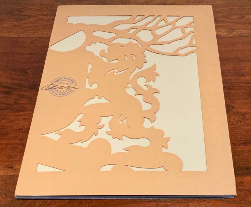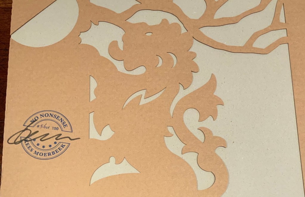 No Nonsense (2020) Kees Moerbeek Pop-up construction: corrugated cardboard, 1.5 mm thick; printed four-color/four-color with an additional print with silver Coldfoil. Cover: Greyboard four-color/no-color, 3 mm, with an additional layer of unprinted and laser cut courrugated cardboard 1.5 mm thick. Closed: H700 x W500 x D20 mm. Open: H700 x W1000 x D560 mm. Published by OptArt in an edition of 100, of which this is #56. Acquired from OptArt, 20 January 2020.