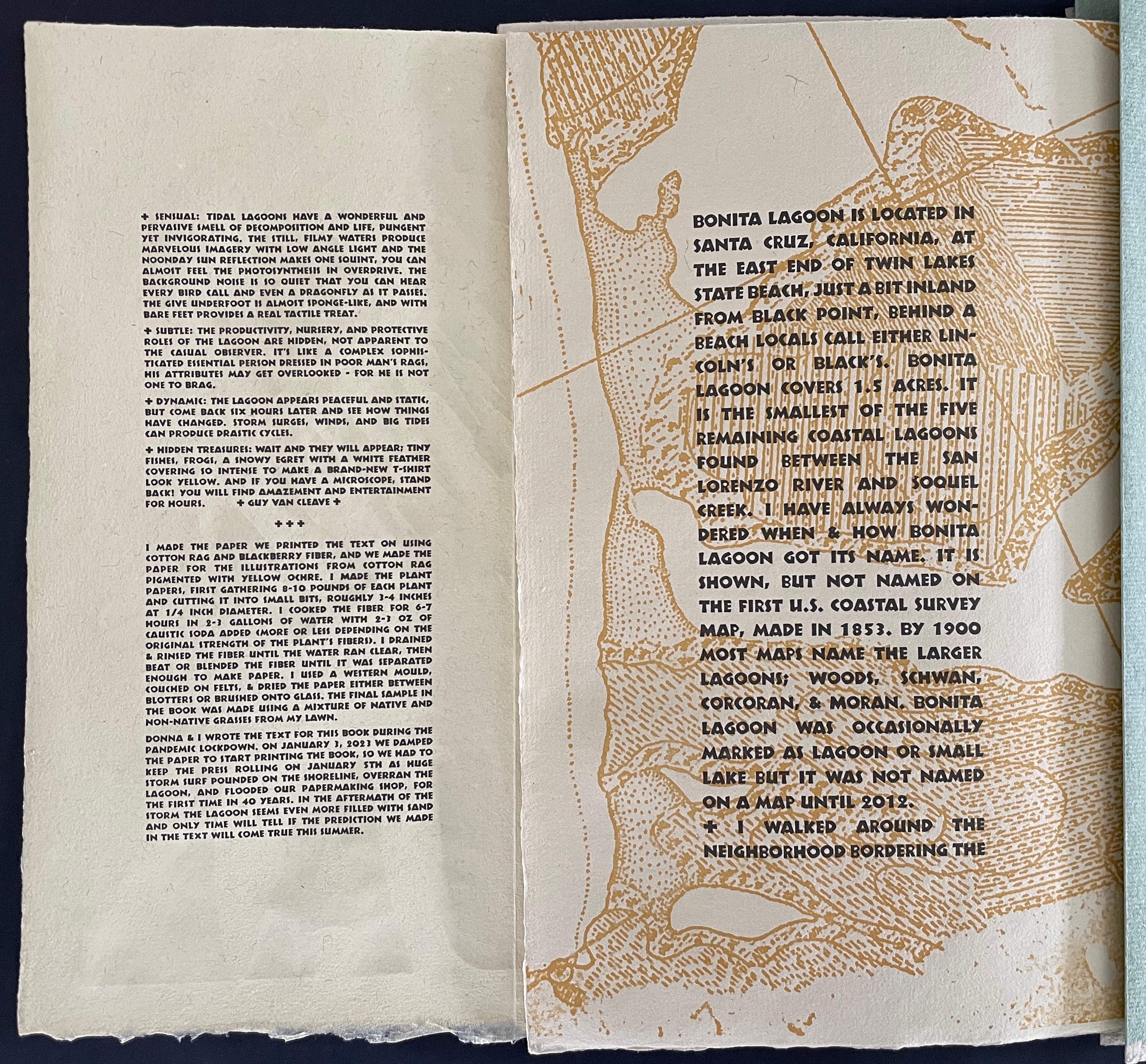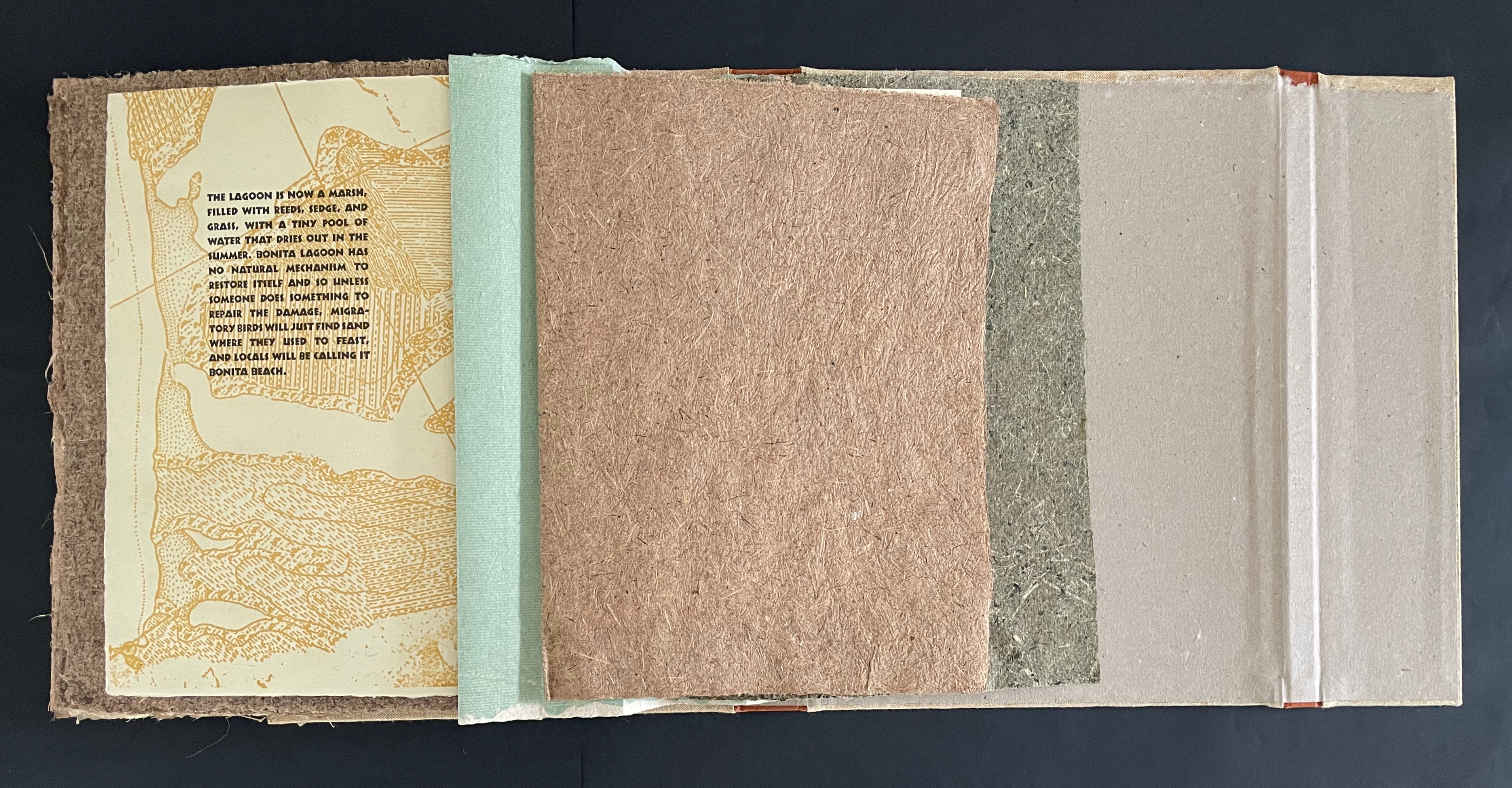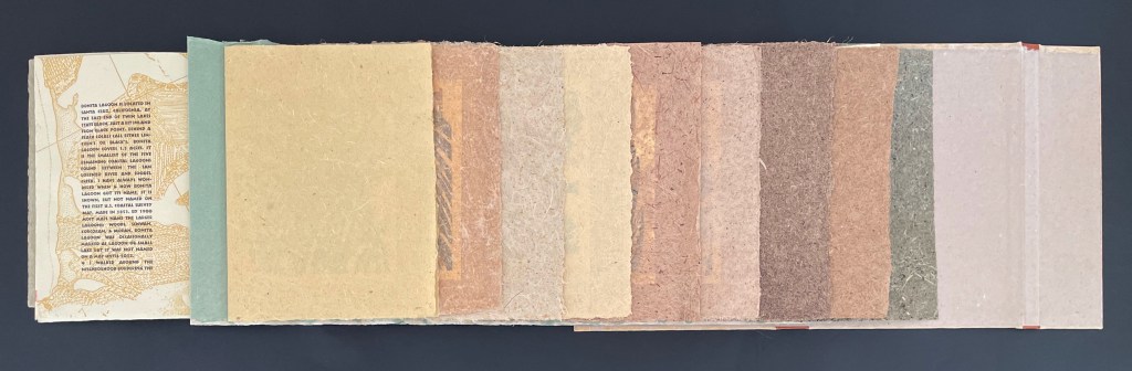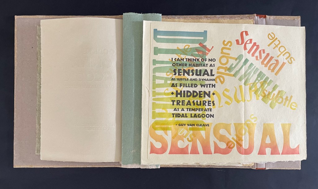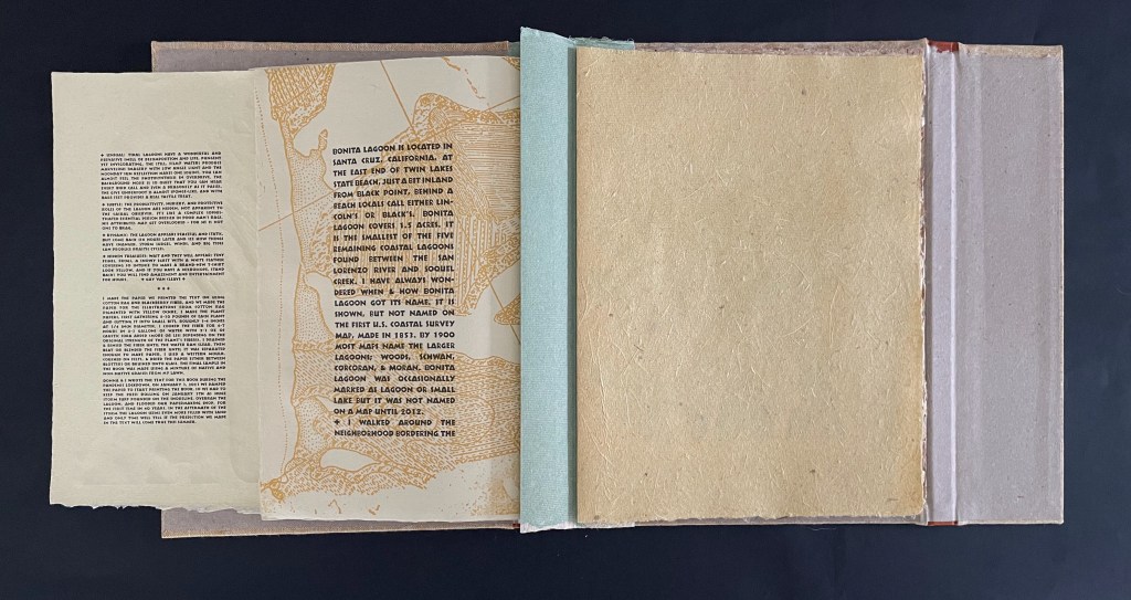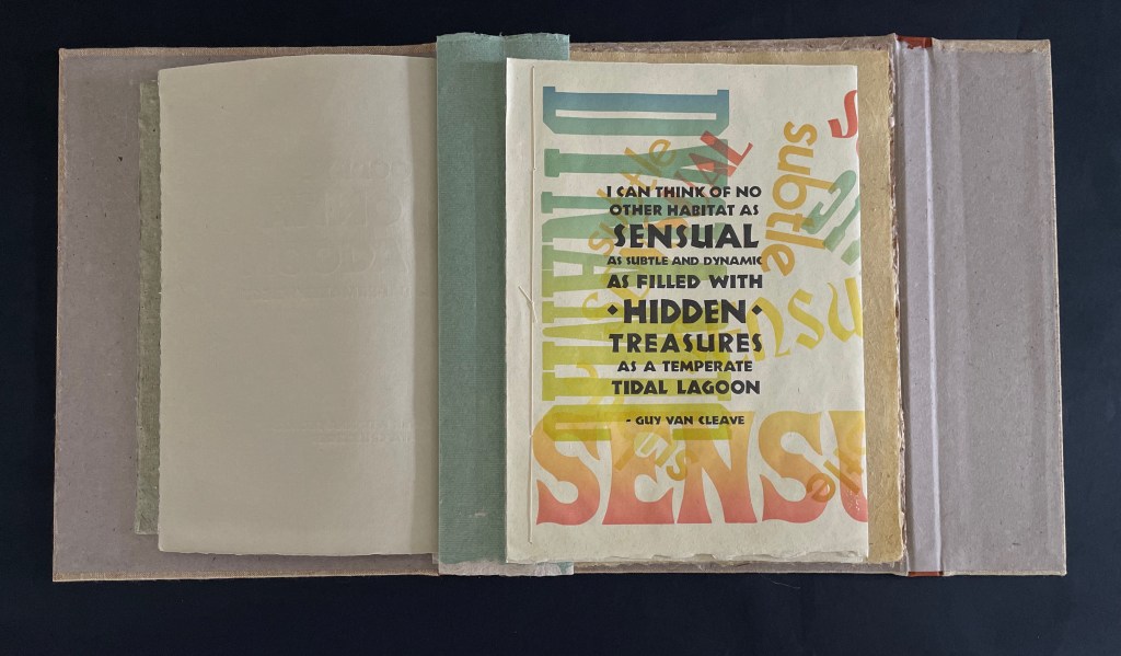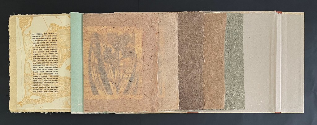At this point, the reader might register that a continuum whose extremities hang in the balance against one another and yet are still connected is also a description of metaphor itself. Two disparate terms are brought together to make a figure of speech. Cordeiro brings two disparate objects together — a softcover codex and the shape of an angled beam, a hard form of structural support — to shape her artist’s book. She materializes that metaphor, then uses it as a platform for textual, graphical, material, and structural metaphors that celebrate the limp vellum structure. It is a striking accomplishment that challenges readers to think with their hands as well as their minds.