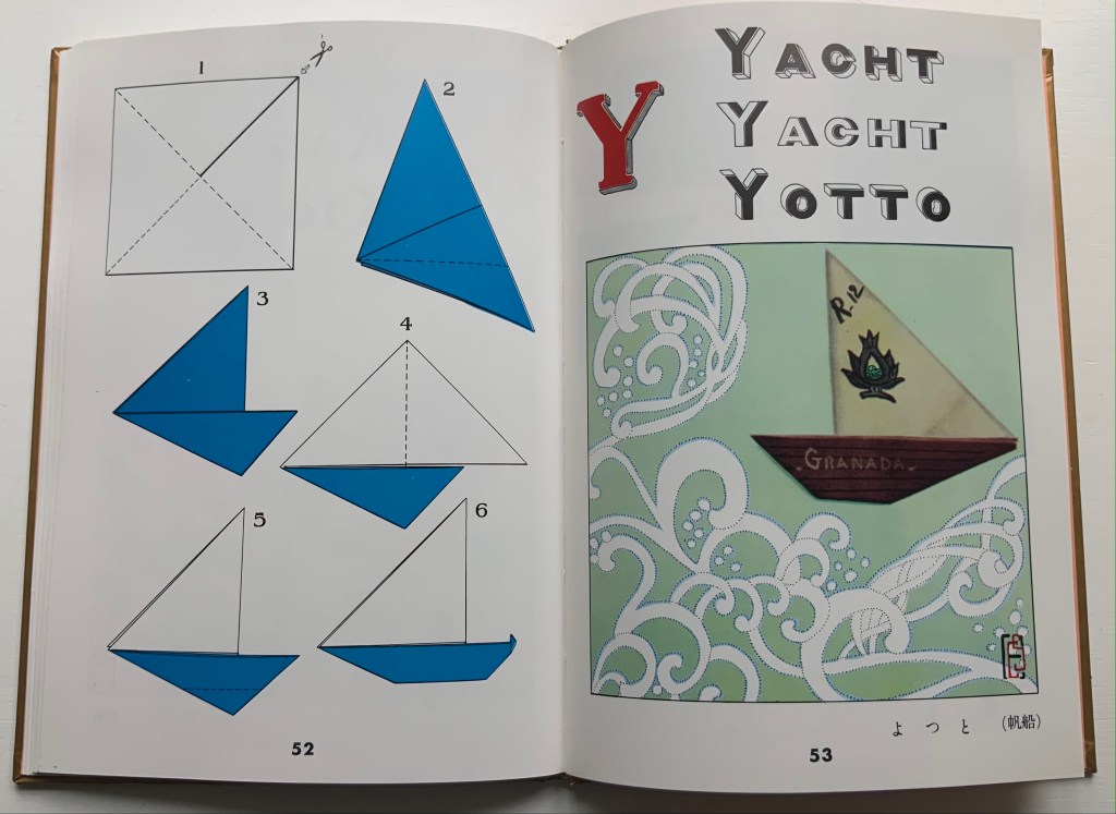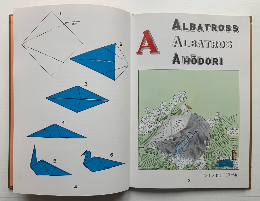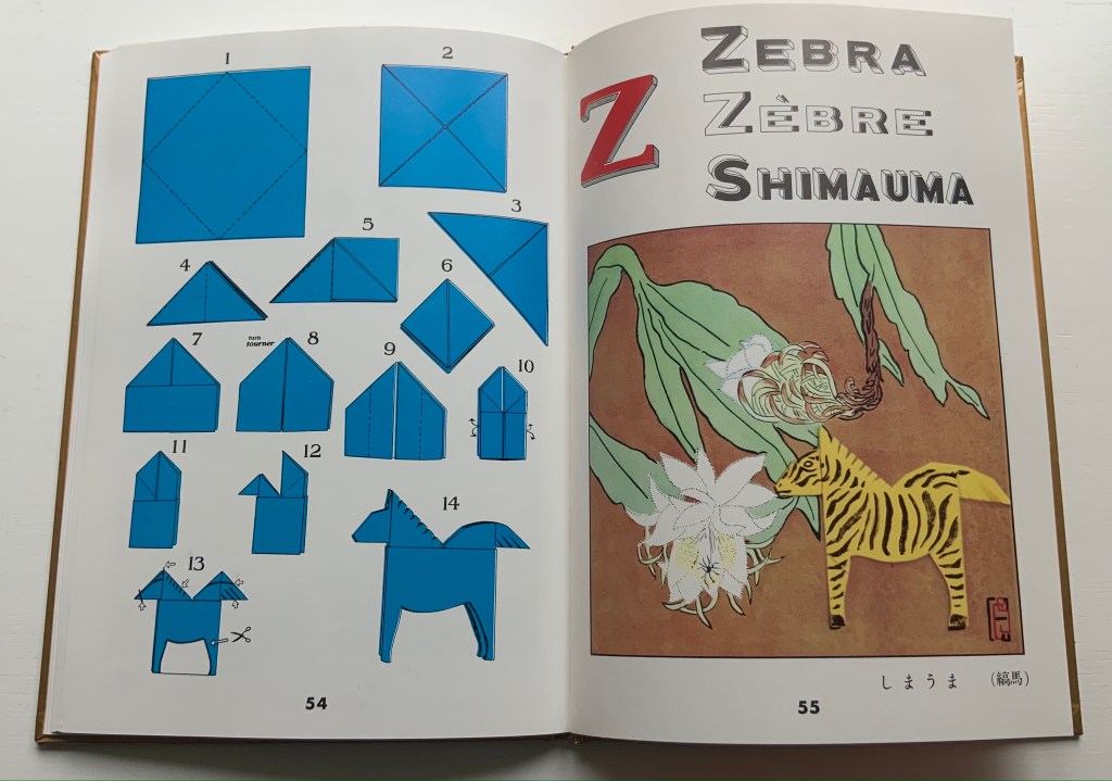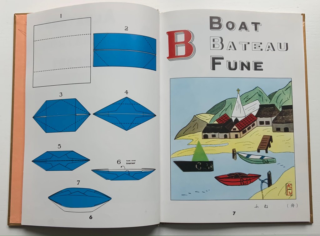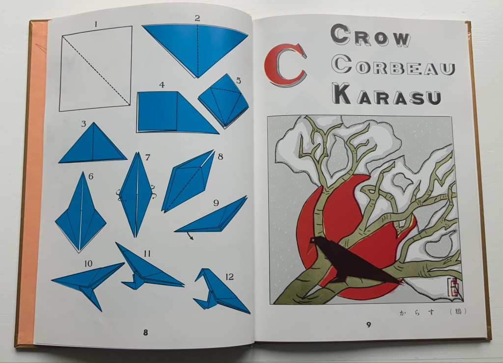 Its blend of multilingual treatment, paper craft applied to the alphabet and collage of origami figures against scenes of Japanese landscapes recommended this book to the Books On Books Collection as a curiosity. The less-than-always-clear origami directions and the words’ lettering, however, altering between black and white and shadowed to tilt in different directions to distinguish the English, French and Japanese, dull the curiosity.