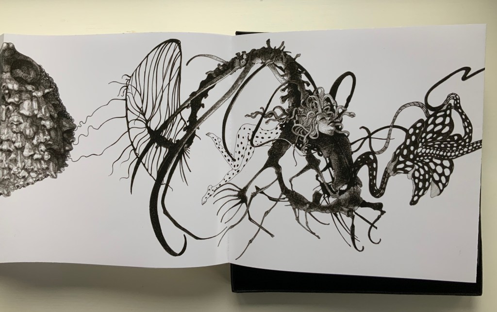 Turning the pages of the leporello or unfolding it to full display invokes the feel of an artist book. Consulting the separate booklet of text creates the air of a disembodied gallery. I move from Odessa to Elasmus (rhinoceros), Ecla (amberjack woman), Amutiel (Scorpionfish), Tharnos (The great mother), Boeotia (Horn of Plenty), Smyrna (Wave), Kalamata (Onda bis), Thelma (zebra lion), Elsa (Mouth eats mouth), Talpio (Bull), One (Noses), Orphestia (fish), Corinna (Cat), Soneril (tiger monkey) and Temel (mouth), but often forget to consult the booklet, which sends me back to gaze at the Chimera whose entry I missed and whose intricacy and connection to the next Chimera make me restart the journey from that point.