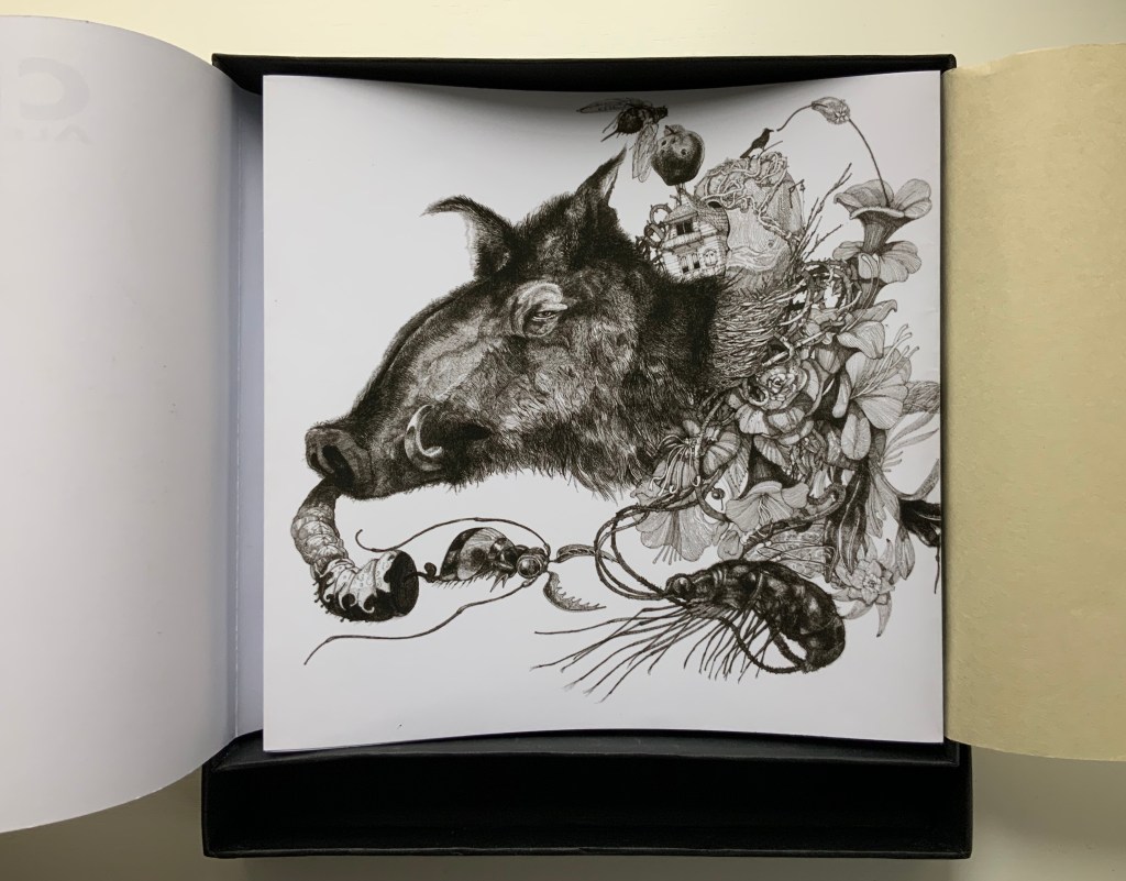 In the booklet, each of the Chimeras has a sort of prose poem in Italian and English to tell its story. The first beast is “Odessa (wild boar), Birth: March 1, 2011 – Death: November 1, 2017”, whom the artist addresses alongside Oedipus: