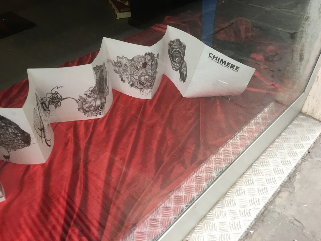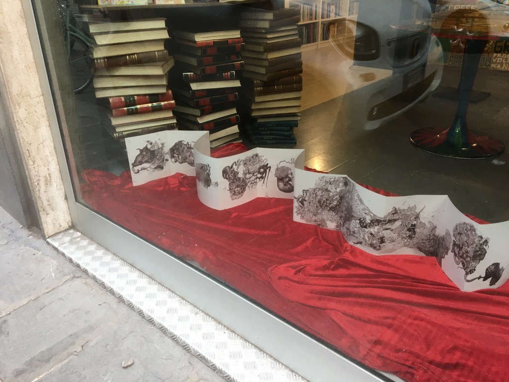 Chimere appeared to me on Via San Gallo. According to the myth, Chimera had three heads: a lion’s, a goat’s emerging from the lion’s back to breathe fire, and a snake’s at the end of its tail. Perhaps the serpent’s eye exerted the same fabled fascination as this leporello did, snaking along the window of Libri Liberi. Drawn closer, then inside, I could find no one to tell me anything about it, but a poster provided the artist’s name and address.