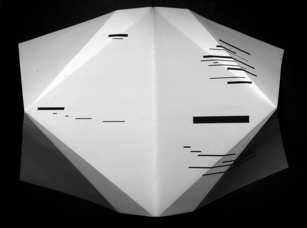 The photo in question is the 78th among 81 photos that mirror and document an installation exhibited at the Musée d’Art Moderne de la Ville de Paris in 2010. In the photo, a double-page spread has been removed from a book, folded and creased into a three-dimensional shape. Or perhaps, as hinted in the interview at the end of the book, it is an enlarged re-creation staged for the photo. The catalogue provides no caption for it or any other image. The text concluding the catalogue does not clarify what it is. Only for someone familiar with Marcel Broodthaers’ homage to Un Coup de Dés Jamais N’Abolira le Hasard are the pages recognizable.