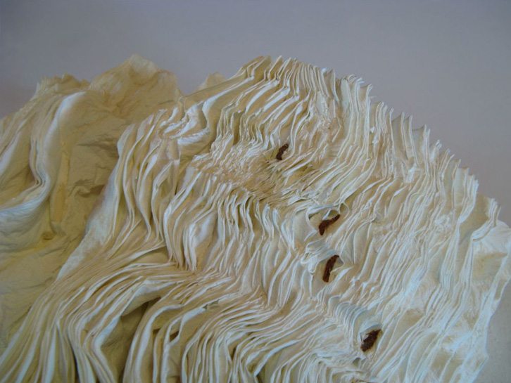 But that oblong of material just lying there and the techniques of altering it are not usually sufficient starting points for the artist. In Jessica Drenk’s case, a visit to a botanic garden’s “large greenhouse full of hundreds of different succulent species” provided the necessary catalyst. As she explained in an interview with Patron: “It blew me away to see so much slight variety within the same category of plant and this experience sent me down a path of experimenting with books in the studio; I wanted to see how many different shapes and objects I could make out of the one material.”