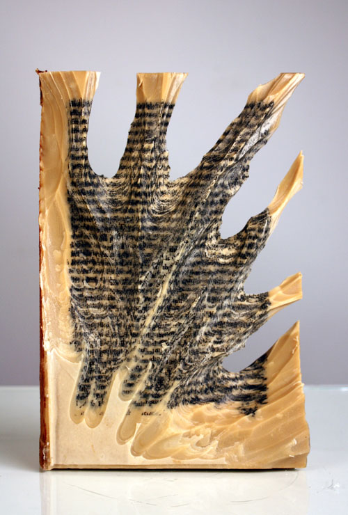 Once a book becomes another material from which art can be made, the rectangular block offers itself up to an unbounded variety of treatments. It can be folded into something else. Or macerated and squeezed out, or into, something else. Or shot, burnt, frozen, soaked, coated or buried and dug up. Or torn, shredded and reconstituted or scattered. Or carved with any number of implements into any number of shapes.