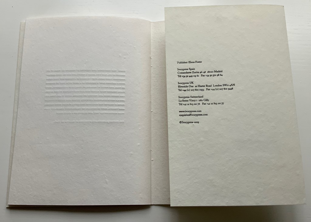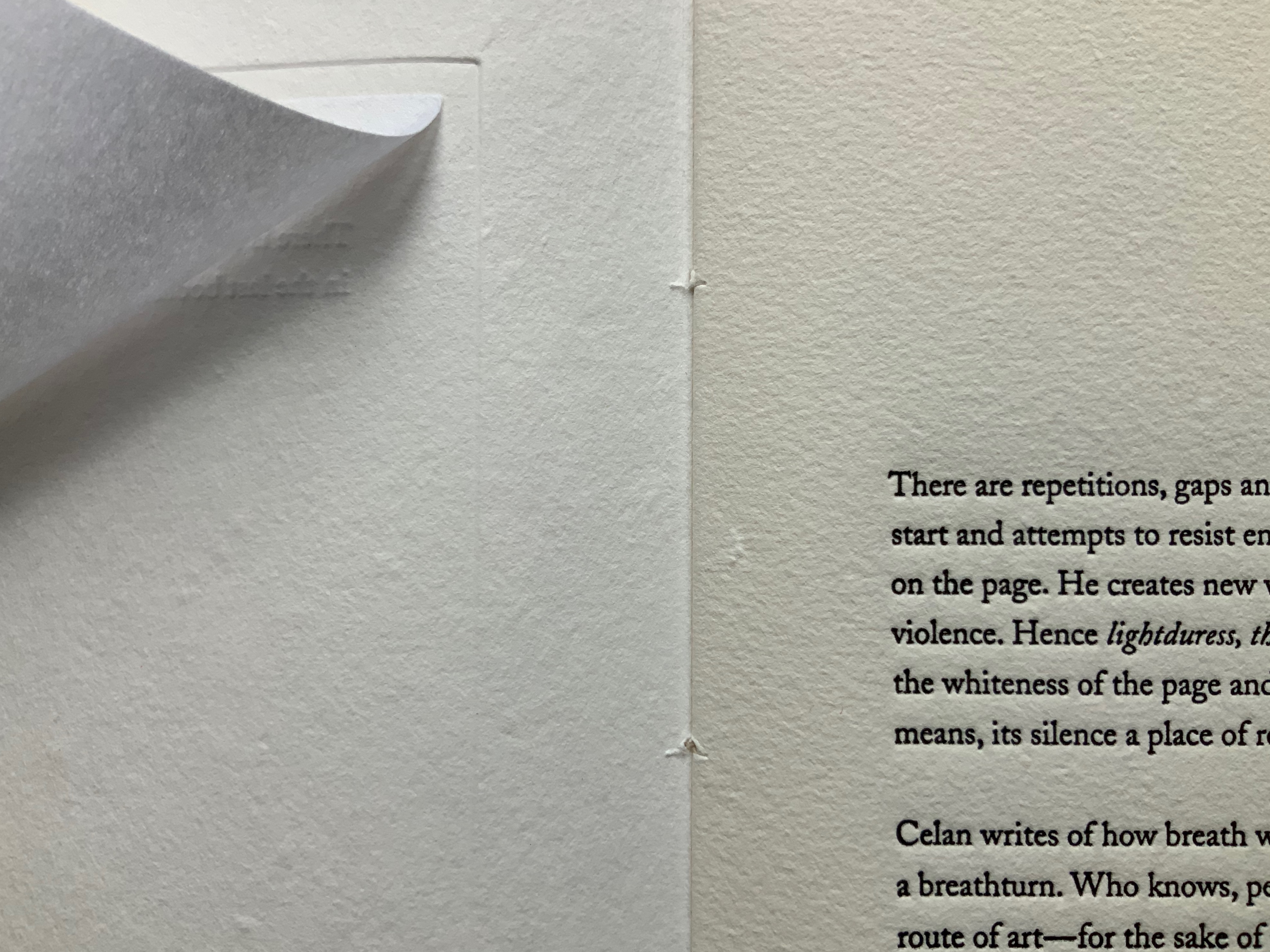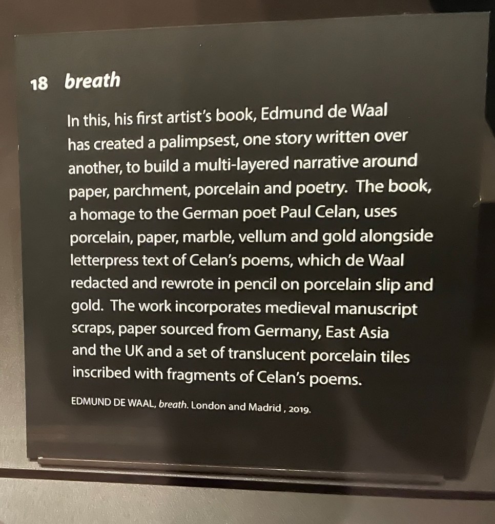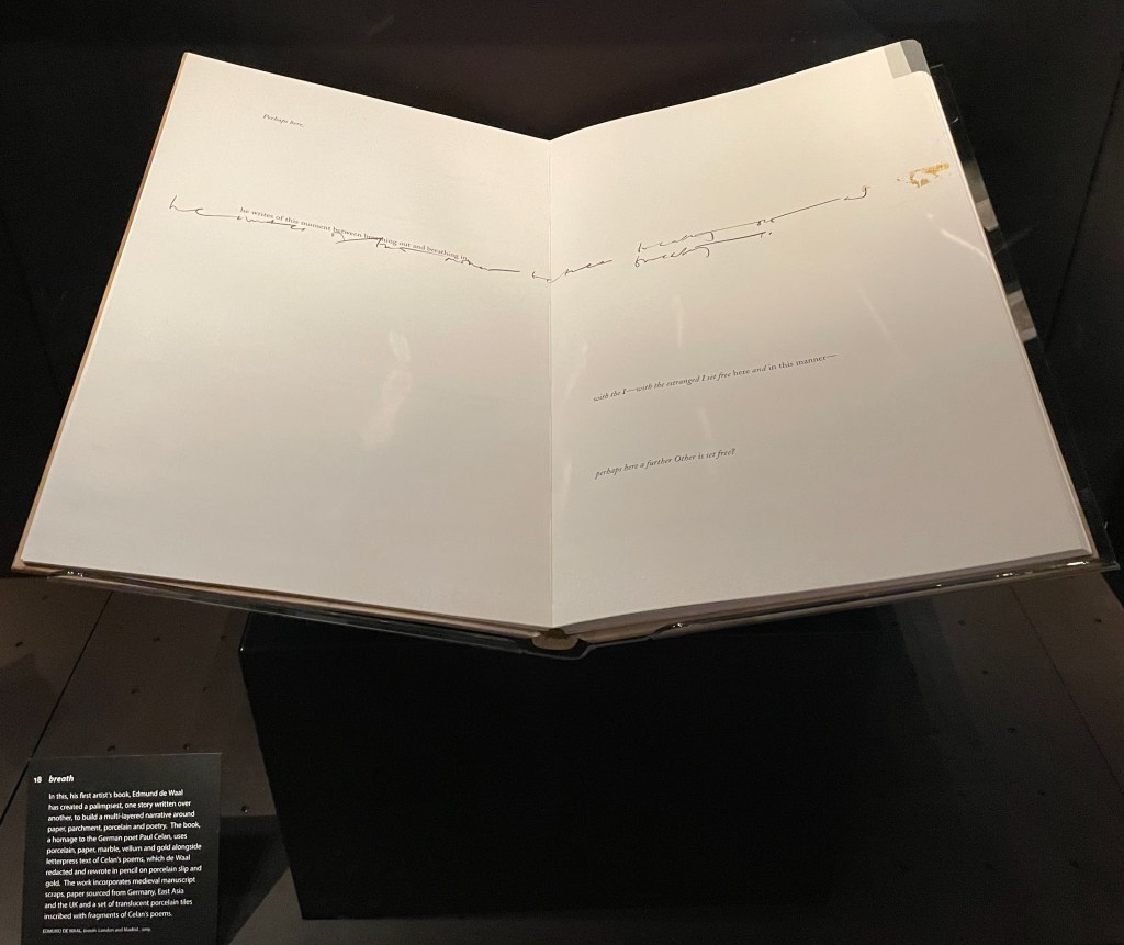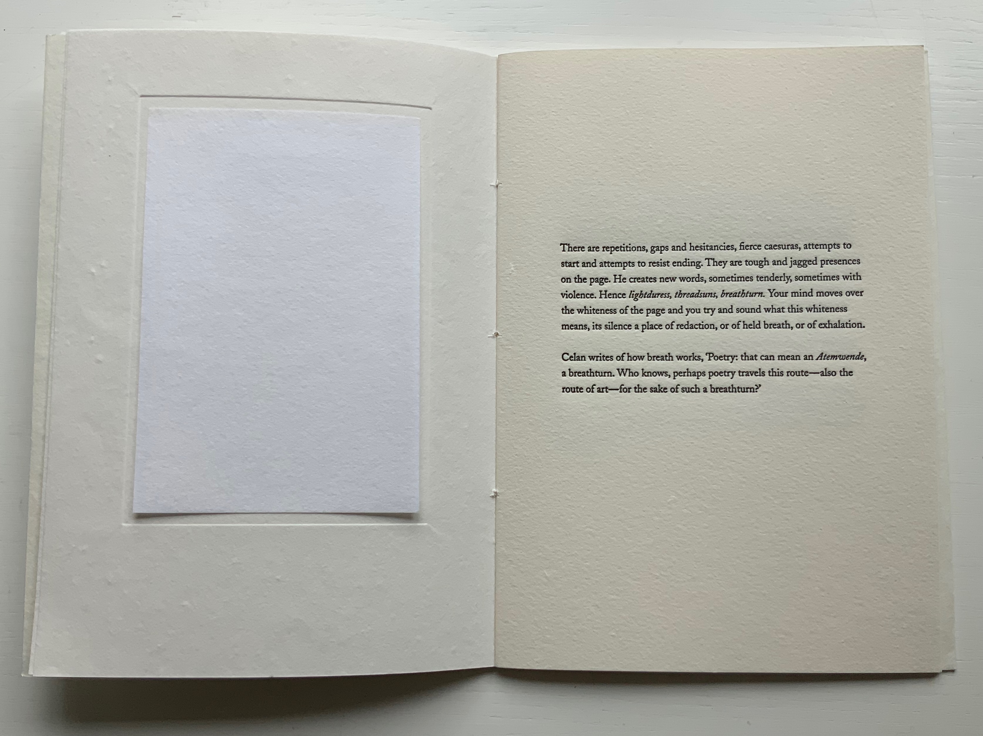 In correspondence with Ivorypress in 2019, I first learned of Edmund de Waal’s artist’s book inspired by the later works of Paul Celan. With the help of Ivorypress, de Waal created breath as an artwork consisting of the artist’s book (in a limited edition of six), a series of vitrines, shelves and diptychs conceived as open books, and a reading room. His aim was to pay homage to the Romanian poet Paul Celan, in whose last books “there is more white page than word”, as de Waal puts it. The only way to have seen the book then would have been to fly to Madrid.
