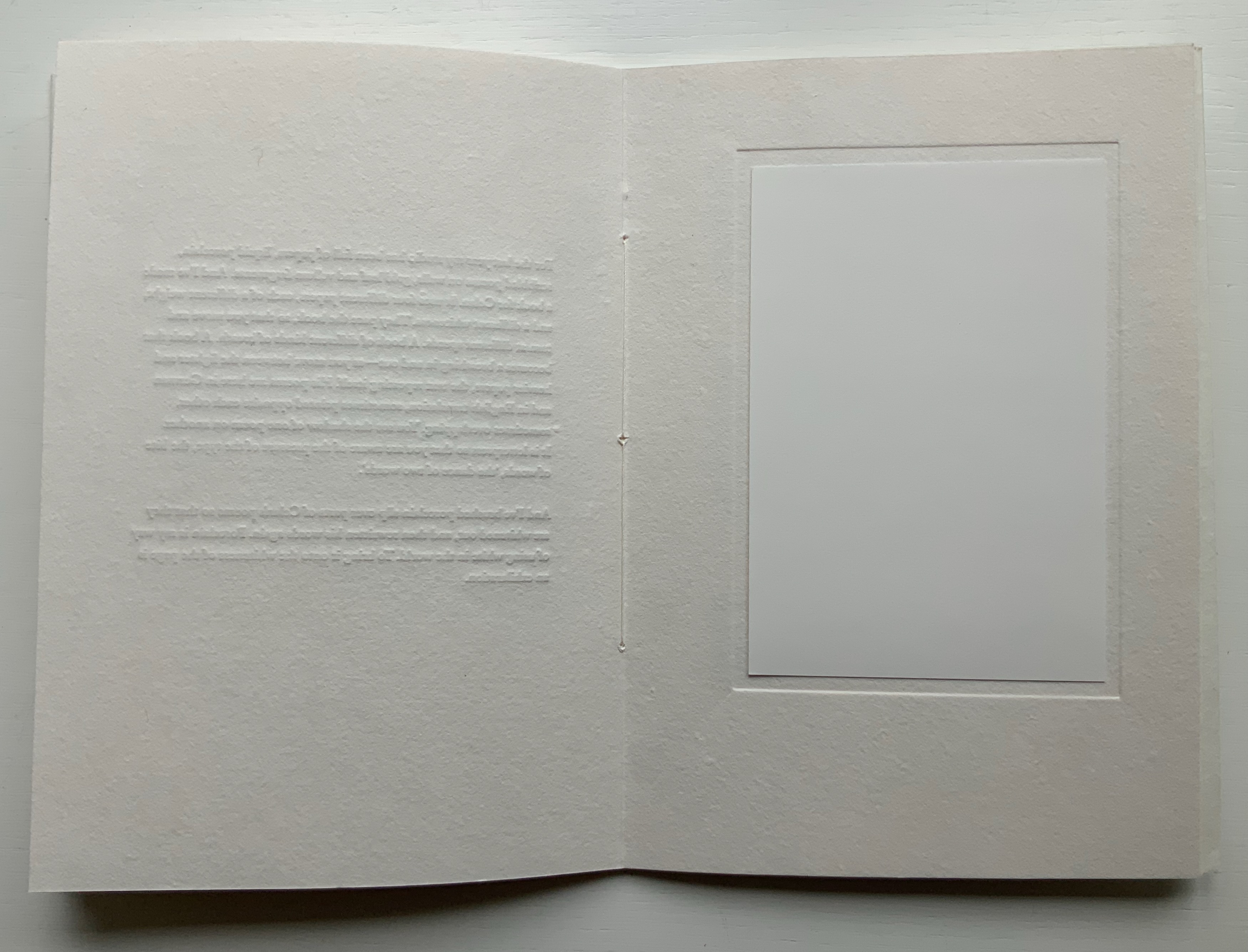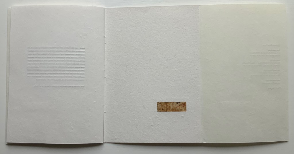 One of the booklet’s inserts is a square of white paper (perhaps the G.F. Smith Colorplan Ice White, one of the four different papers used in the artist’s book). Opposite the insert, de Waal writes, “Your mind moves over the whiteness of the page and you try and sound what this whiteness means, its silence a place of redaction, or of held breath, or of exhalation.” The close-up of the insert turned shows the paper’s degree of translucence that de Waal uses to great effect in his artist’s book as can be seen in the videos. The close-up also gives a view of the bite of the letterpress in the raised impression from the page before and the ink-filled depth on the facing page. This kind of material contrast recurs — bite and breath, white and black, lighter and heavier papers, rougher and smoother — in the larger work in so many ways.