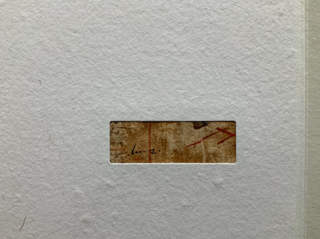Just as the book, ceramics and lectern constitute another layer to the installation work, there are layers in the artist’s book itself, some of them hidden. The use of porcelain slip to cover Celan’s words has already been mentioned. Another layer lies in the binding, executed by Shepherds, Sangorski & Sutcliff. As was done in the early days of bookbinding, scraps of previously published material line the spine. For this purpose, De Waal collected scraps of medieval manuscripts previously used for binding. Binding within binding, centuries within centuries. By tucking away underneath the paper binding’s flap the only colored image in the booklet, an image that even looks like a scrap of illuminated manuscript, de Waal alludes to this practice.